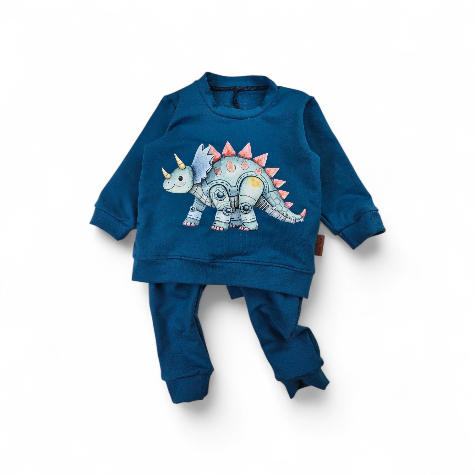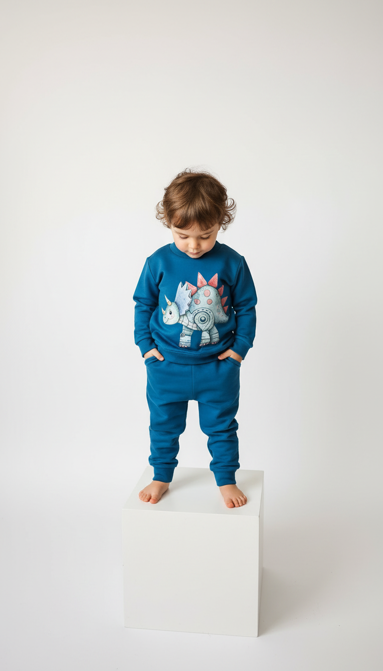 Ten komplet został stworzony dla dzieci, które kochają ruch, zabawę i wyraziste detale. Głęboki niebieski kolor, autorska grafika dino-robota oraz charakterystyczne kolce na plecach bluzy sprawiają, że zestaw wyróżnia się i daje efekt WOW już od pierwszego spojrzenia.