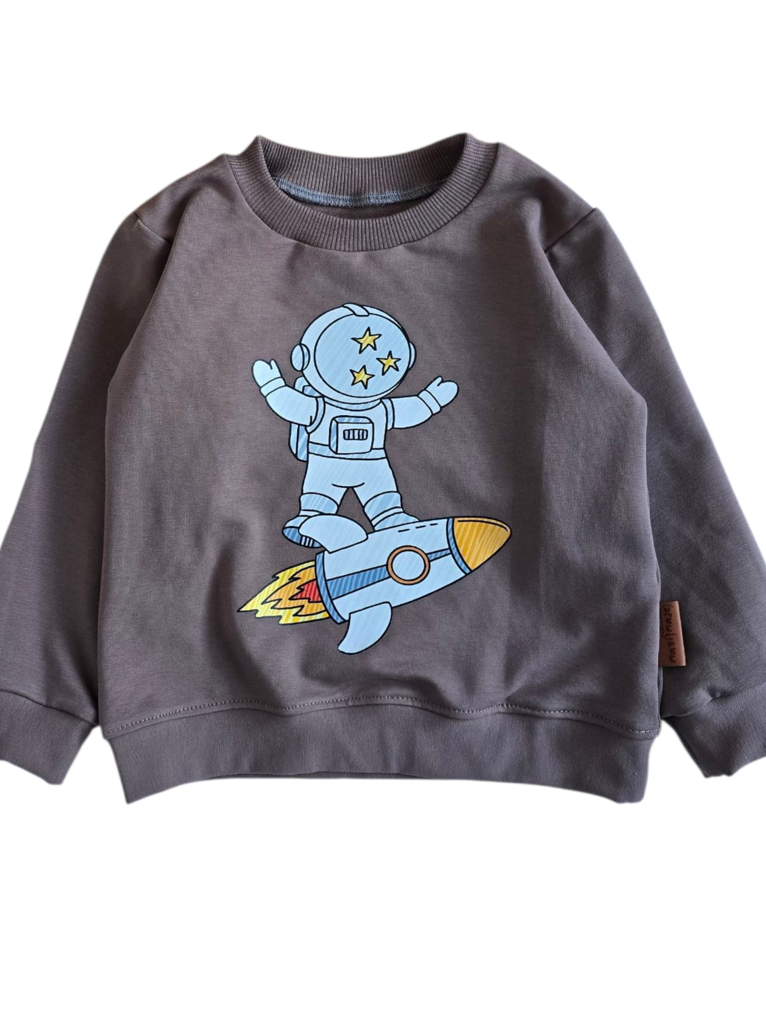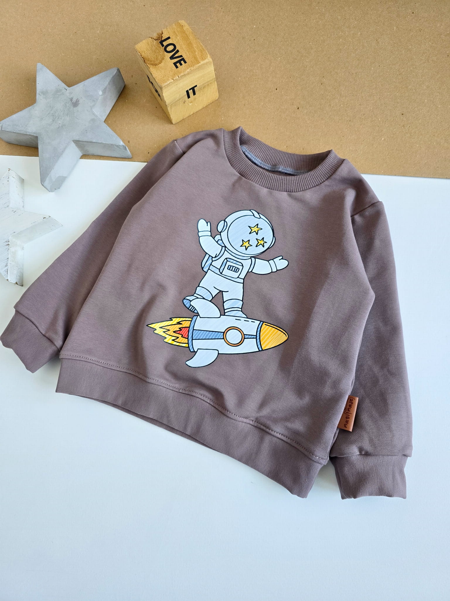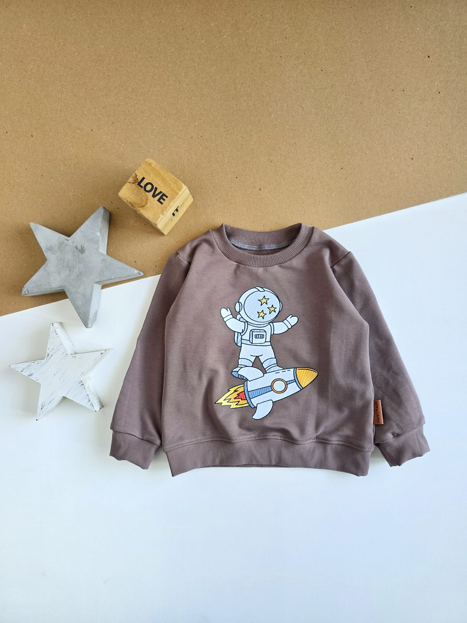 Bluza dziecięca uszyta z dzianiny dresowej w kolorze kakao. Ozdobiona trwałym nadrukiem wykonanym metodą DTF, przedstawiającym astronautę lecącego na rakiecie. Klasyczny krój, elastyczne ściągacze i staranne wykończenie sprawiają, że bluza świetnie sprawdzi się zarówno na co dzień, jak i podczas aktywnej zabawy.