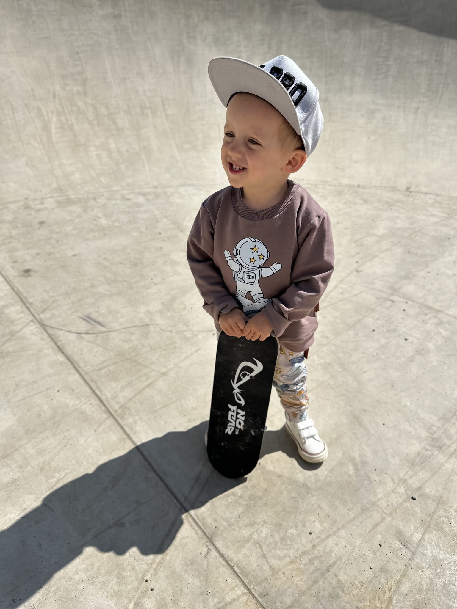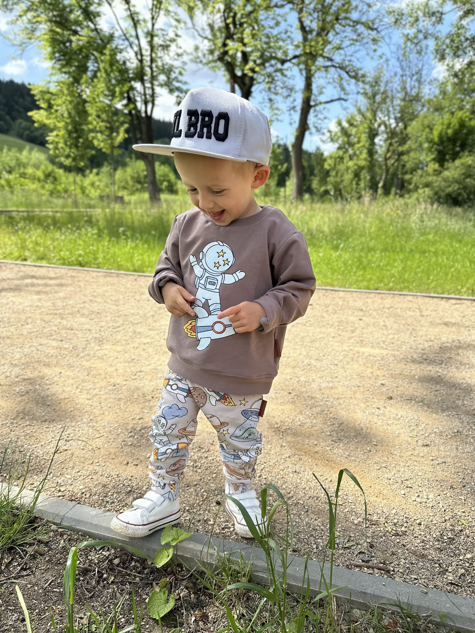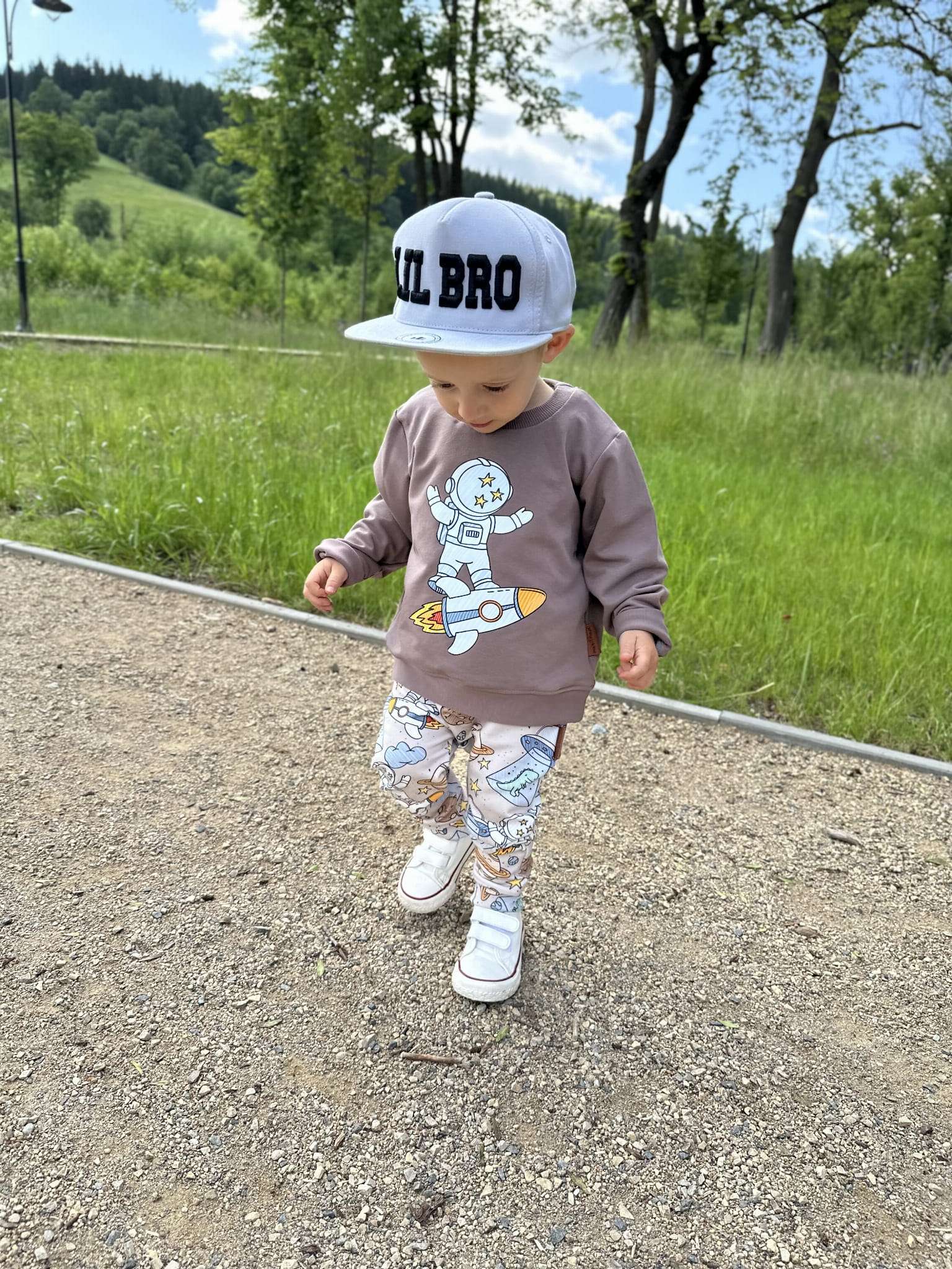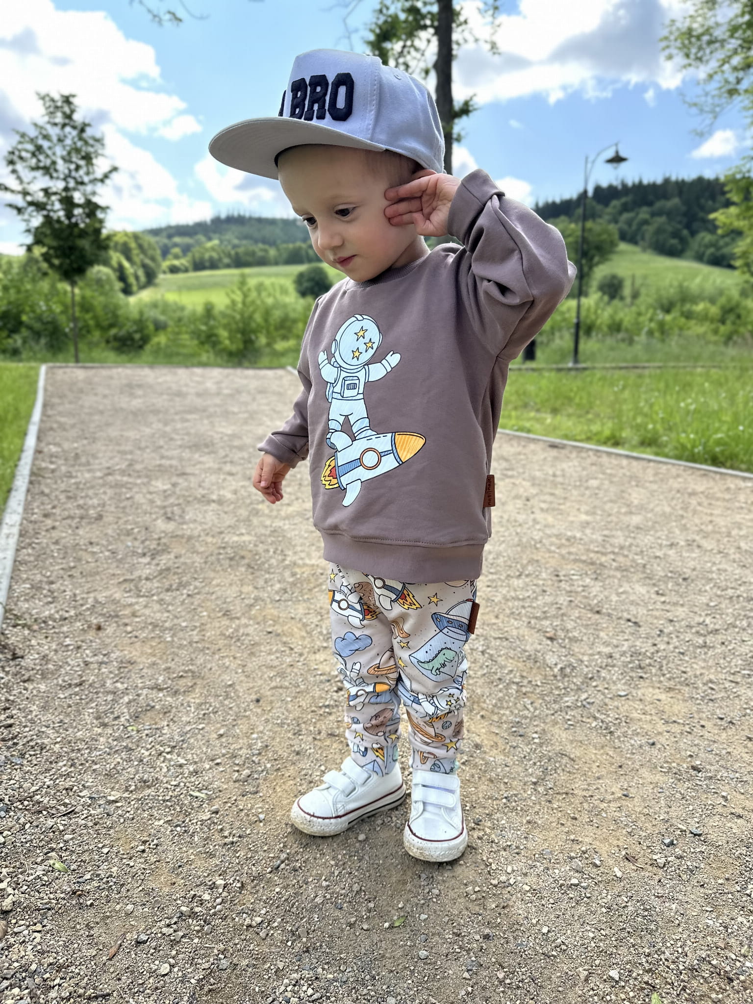 Bluza dziecięca uszyta z dzianiny dresowej w kolorze kakao. Ozdobiona trwałym nadrukiem wykonanym metodą DTF, przedstawiającym astronautę lecącego na rakiecie. Klasyczny krój, elastyczne ściągacze i staranne wykończenie sprawiają, że bluza świetnie sprawdzi się zarówno na co dzień, jak i podczas aktywnej zabawy.