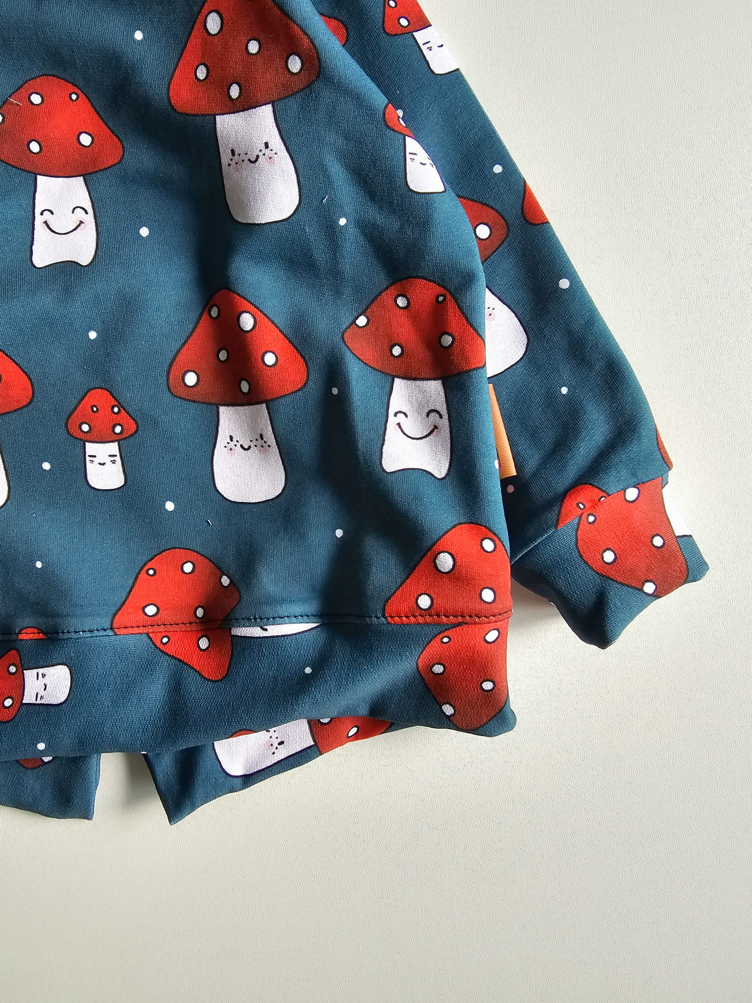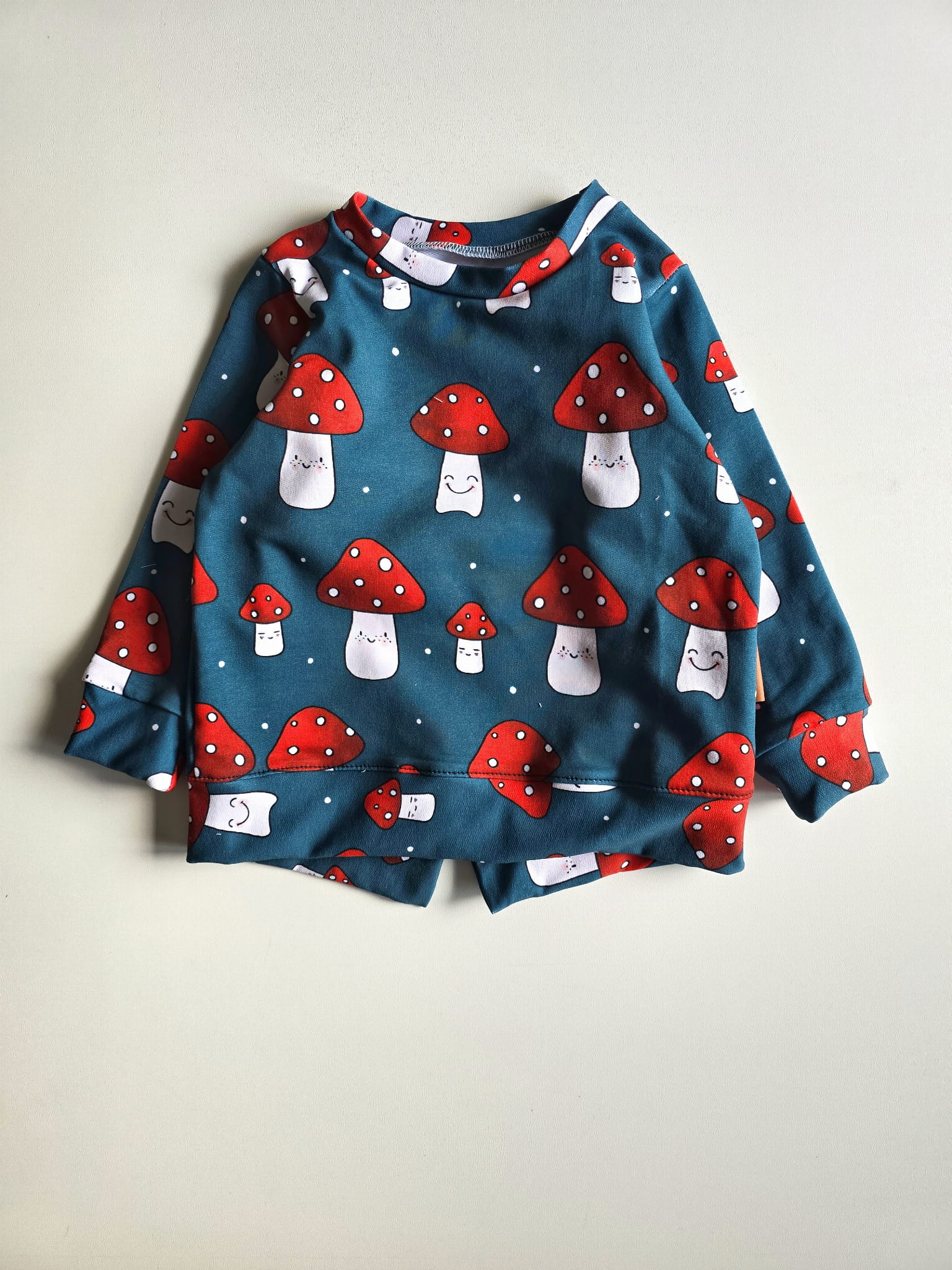 Aby bluza „Muchomorki” cieszyła oko przez długi czas, zalecamy pranie w temperaturze do 30°C, na lewej stronie, w delikatnym cyklu. Unikaj suszenia w suszarce bębnowej oraz stosowania wybielaczy.