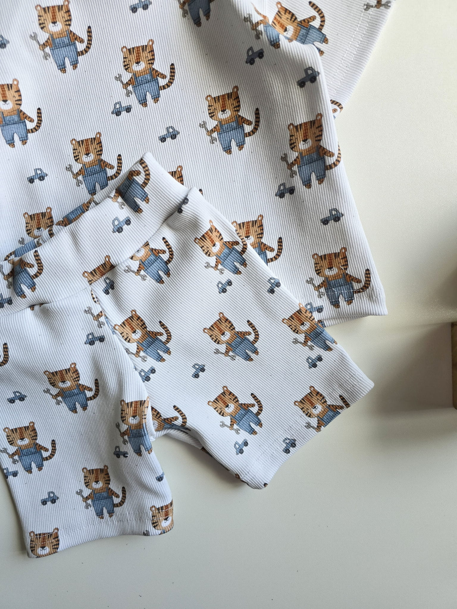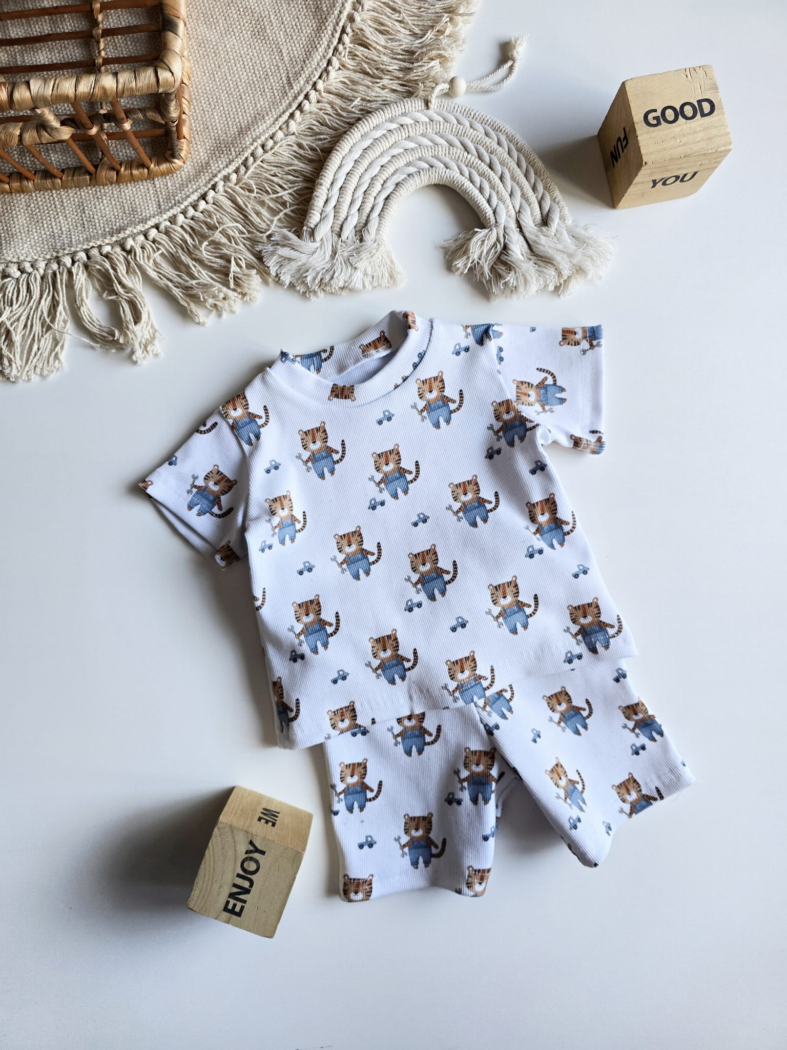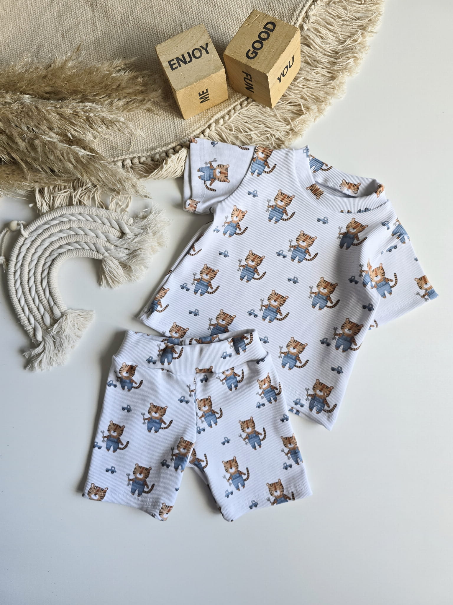 W skład kompletu wchodzi: bluzeczka krótki rękaw i szorty z gumką w pasie.