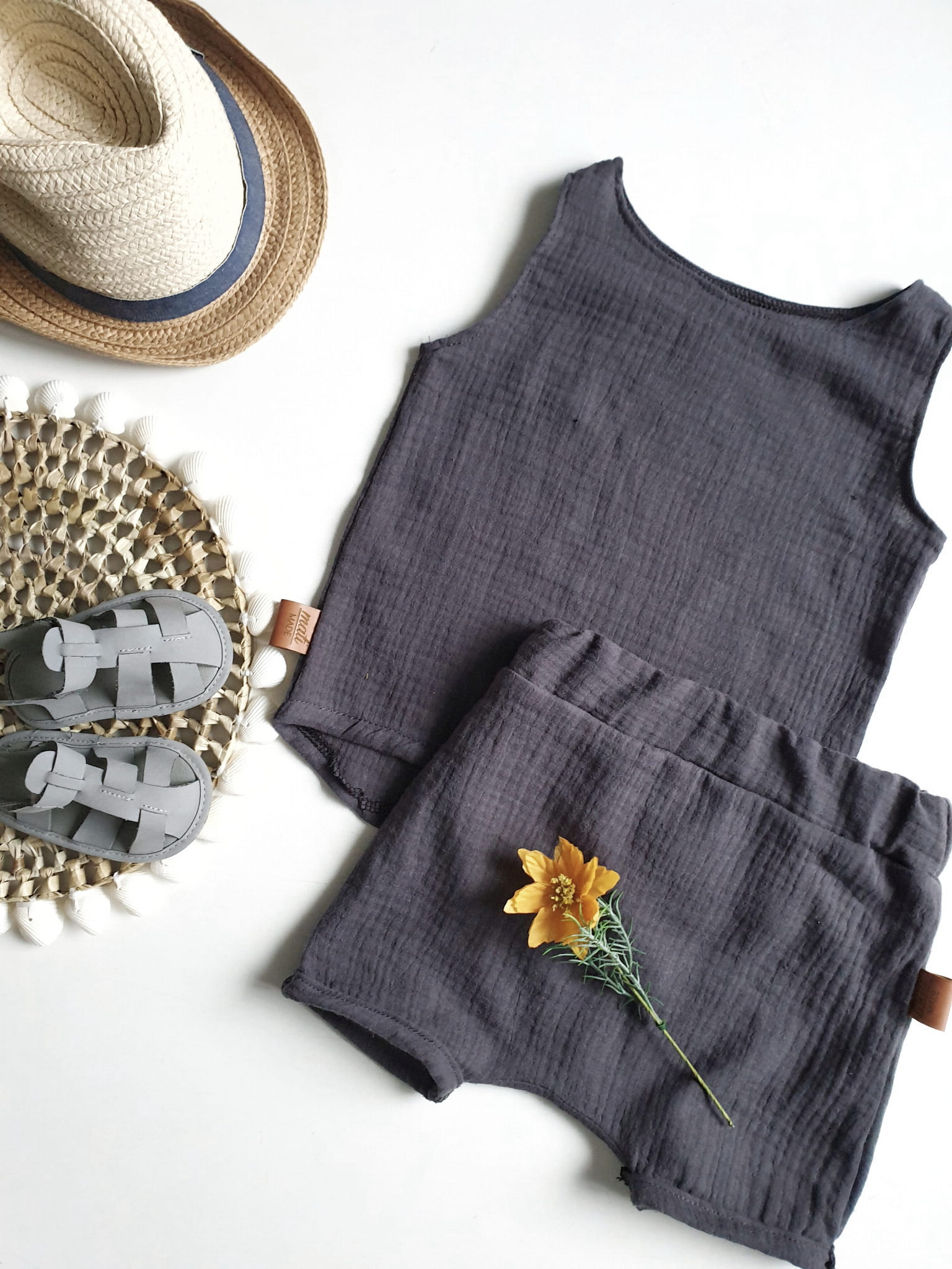 W skład kompletu wchodzi: bluzeczka i szorty z gumką w pasie.