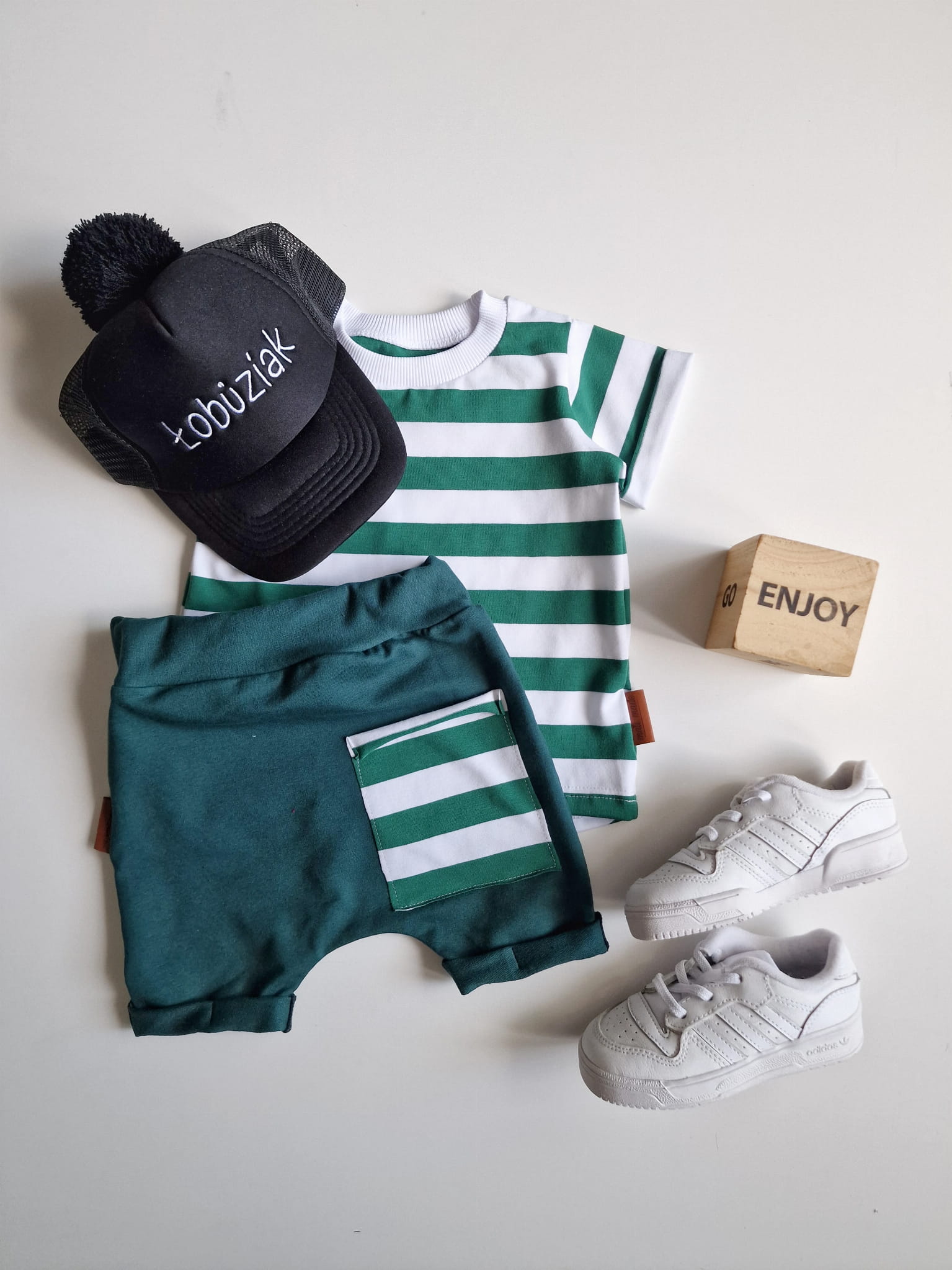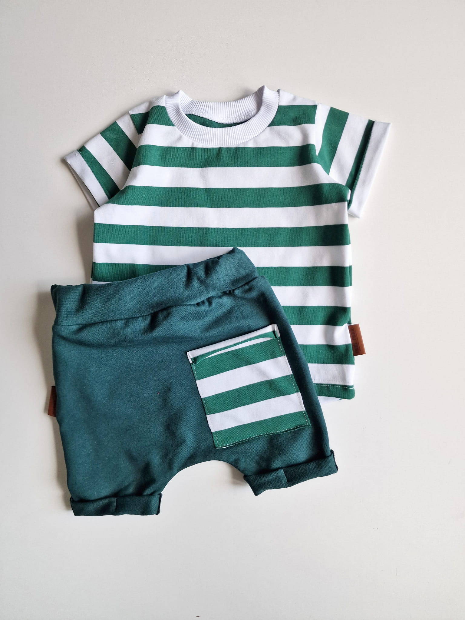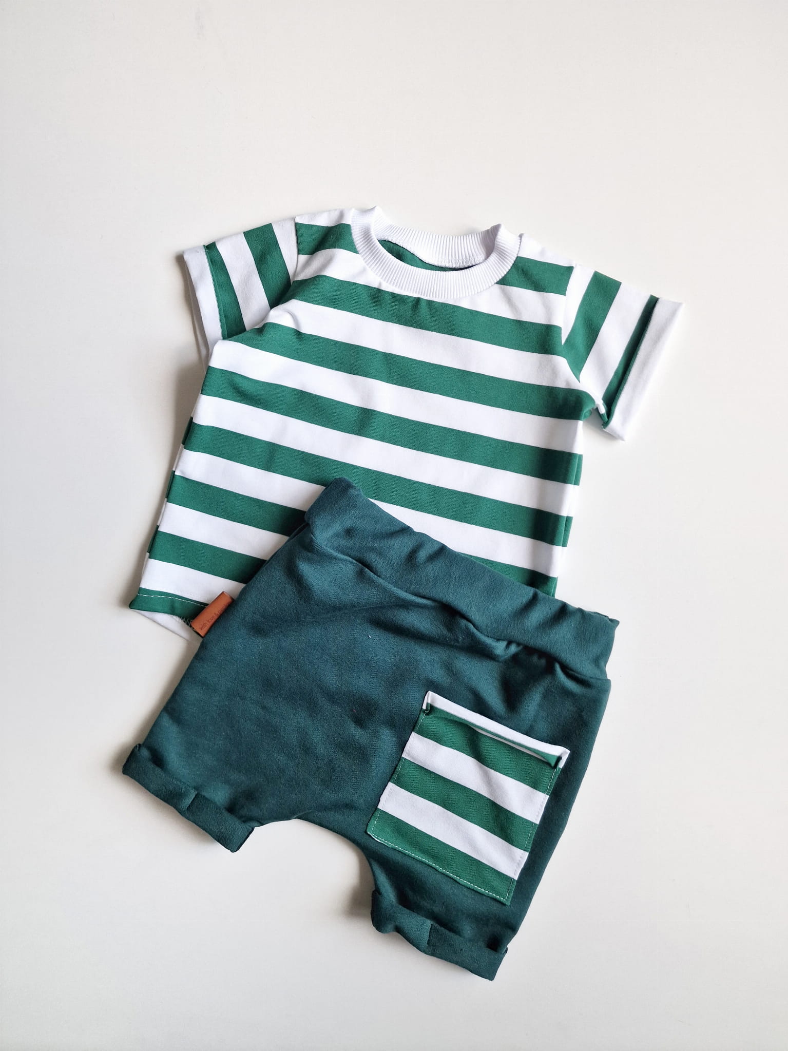 W skład kompletu wchodzi: bluzeczka krótki rękaw i szorty z gumką w pasie.