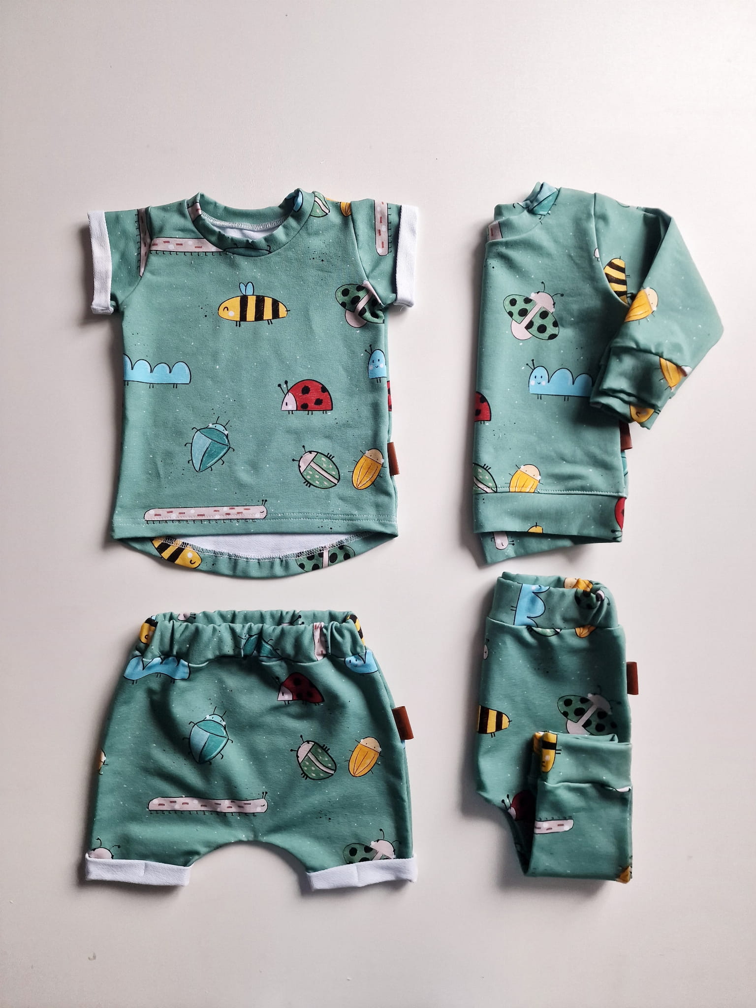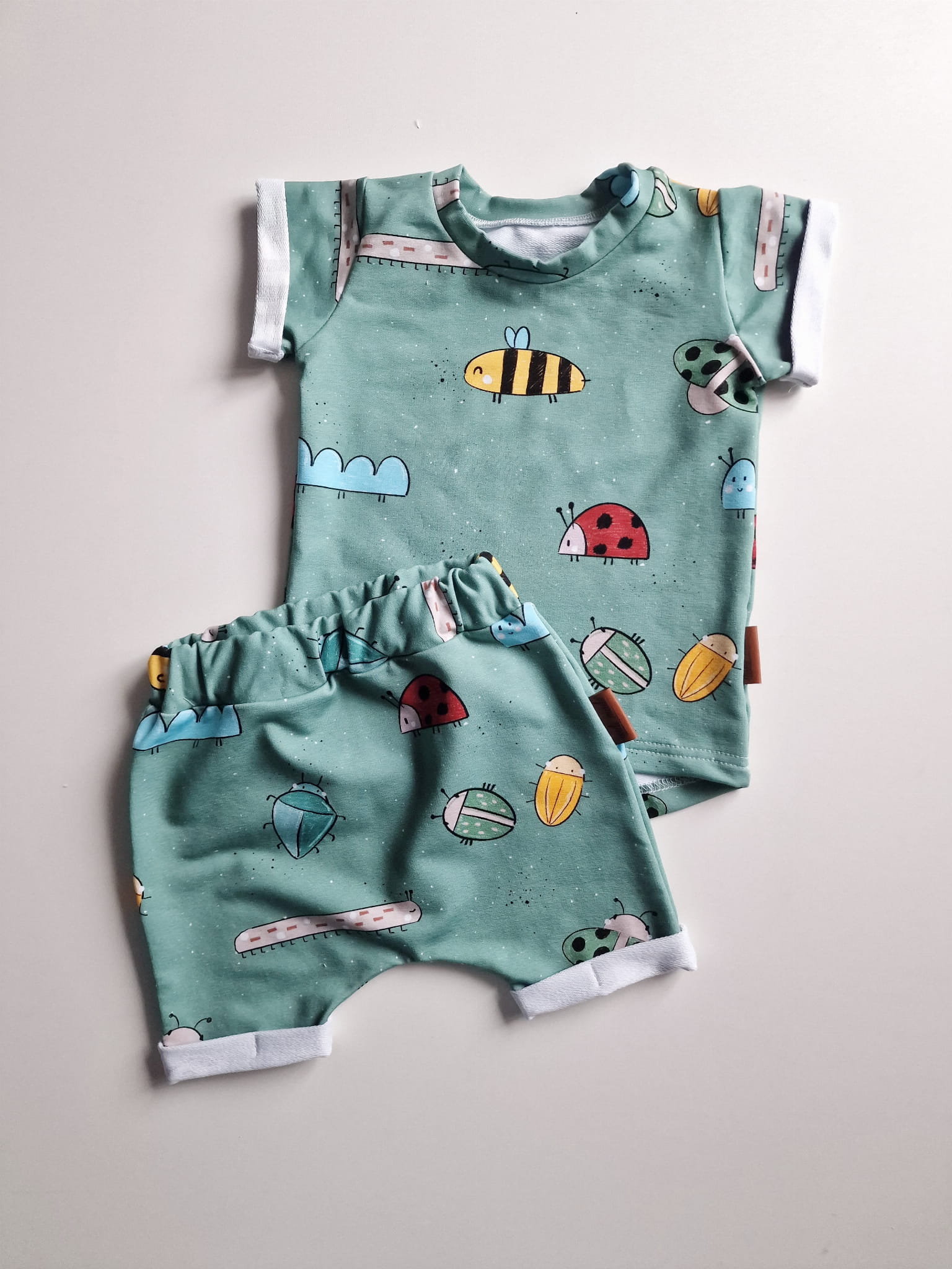 W skład kompletu wchodzi: bluzeczka krótki rękaw i szorty z gumką w pasie.