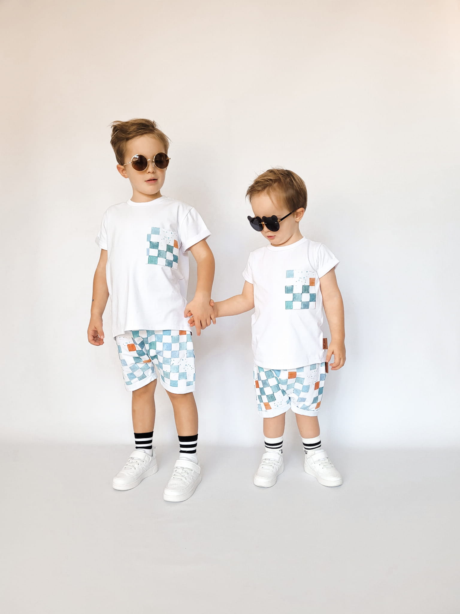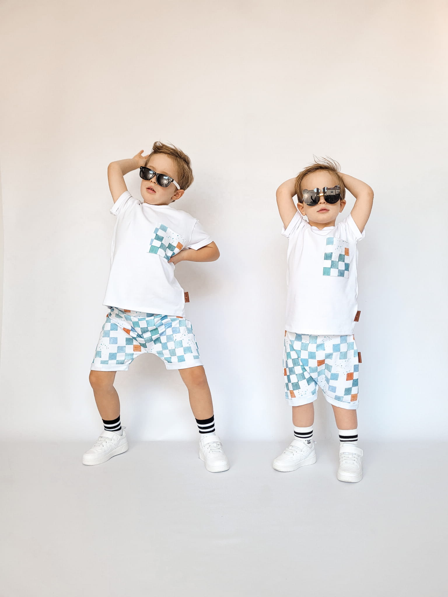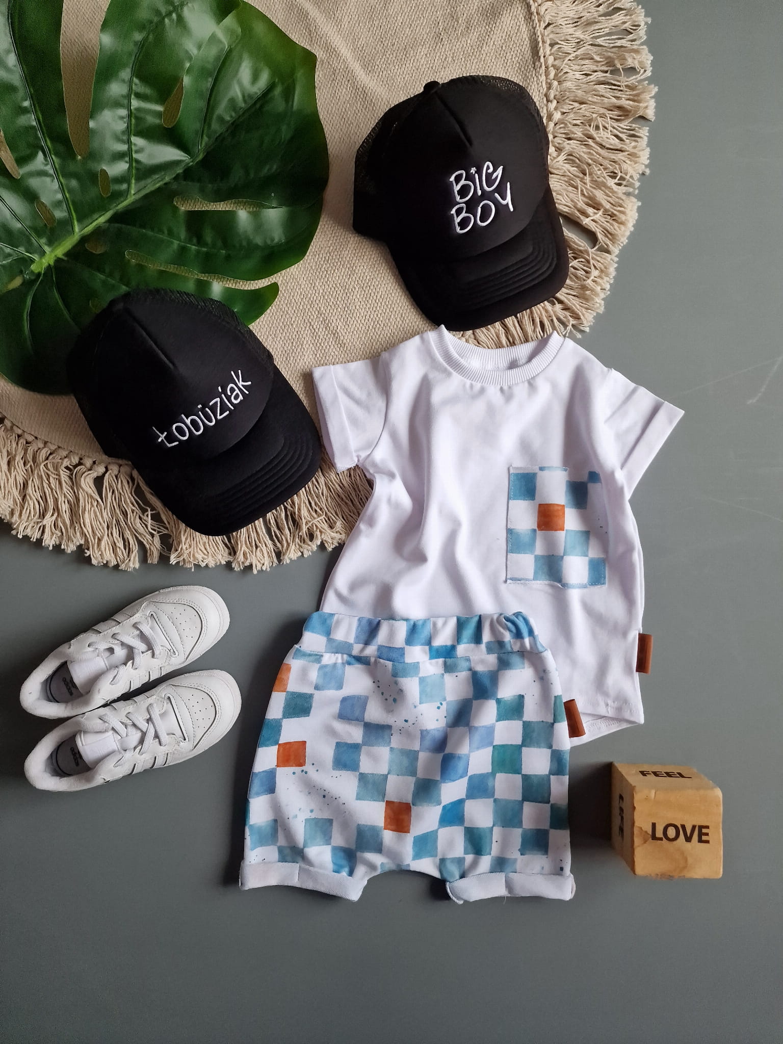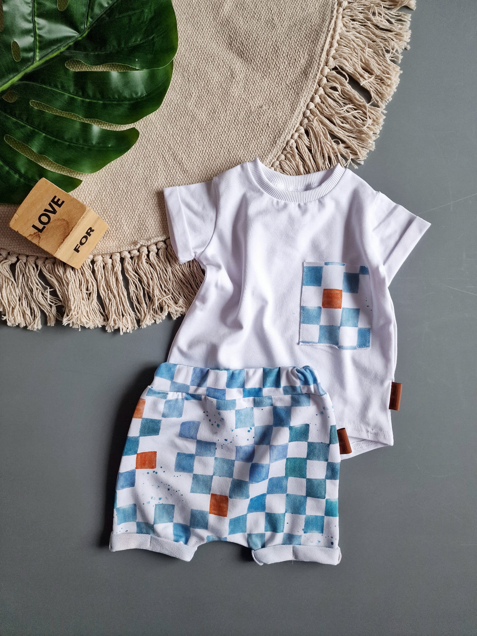W skład kompletu wchodzi: bluzeczka krótki rękaw i szorty z gumką w pasie.