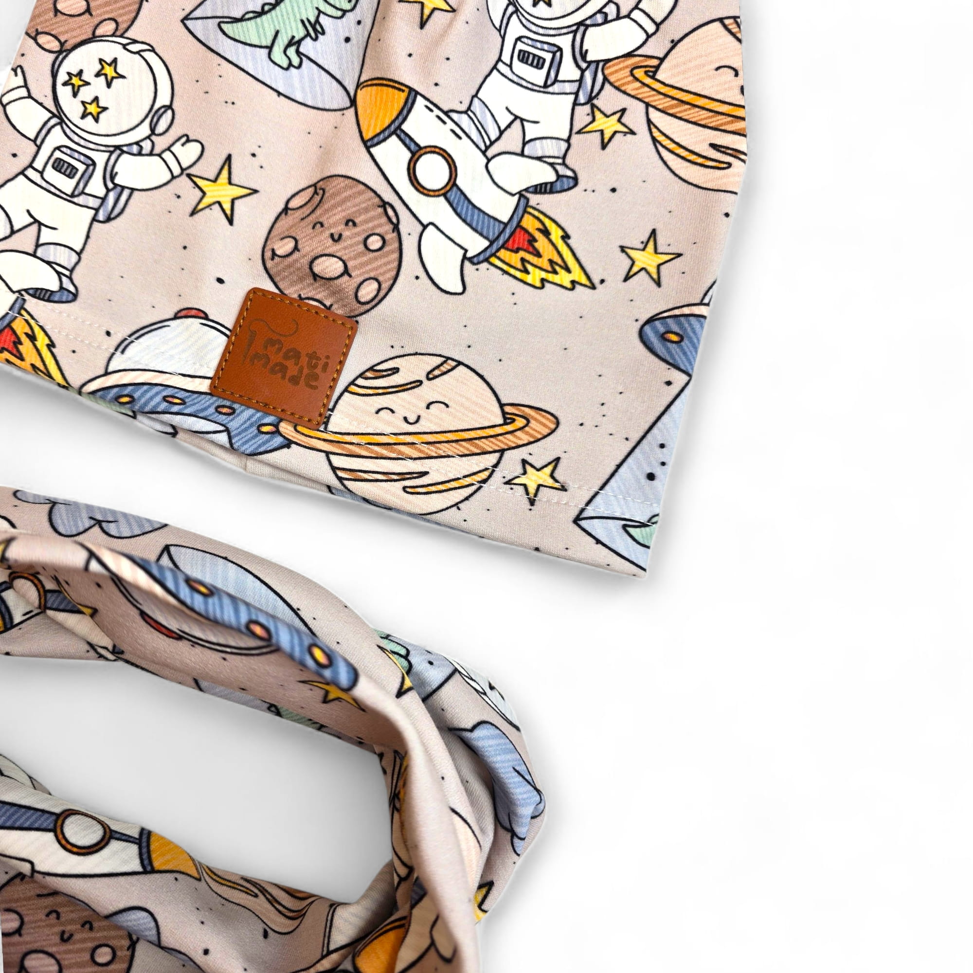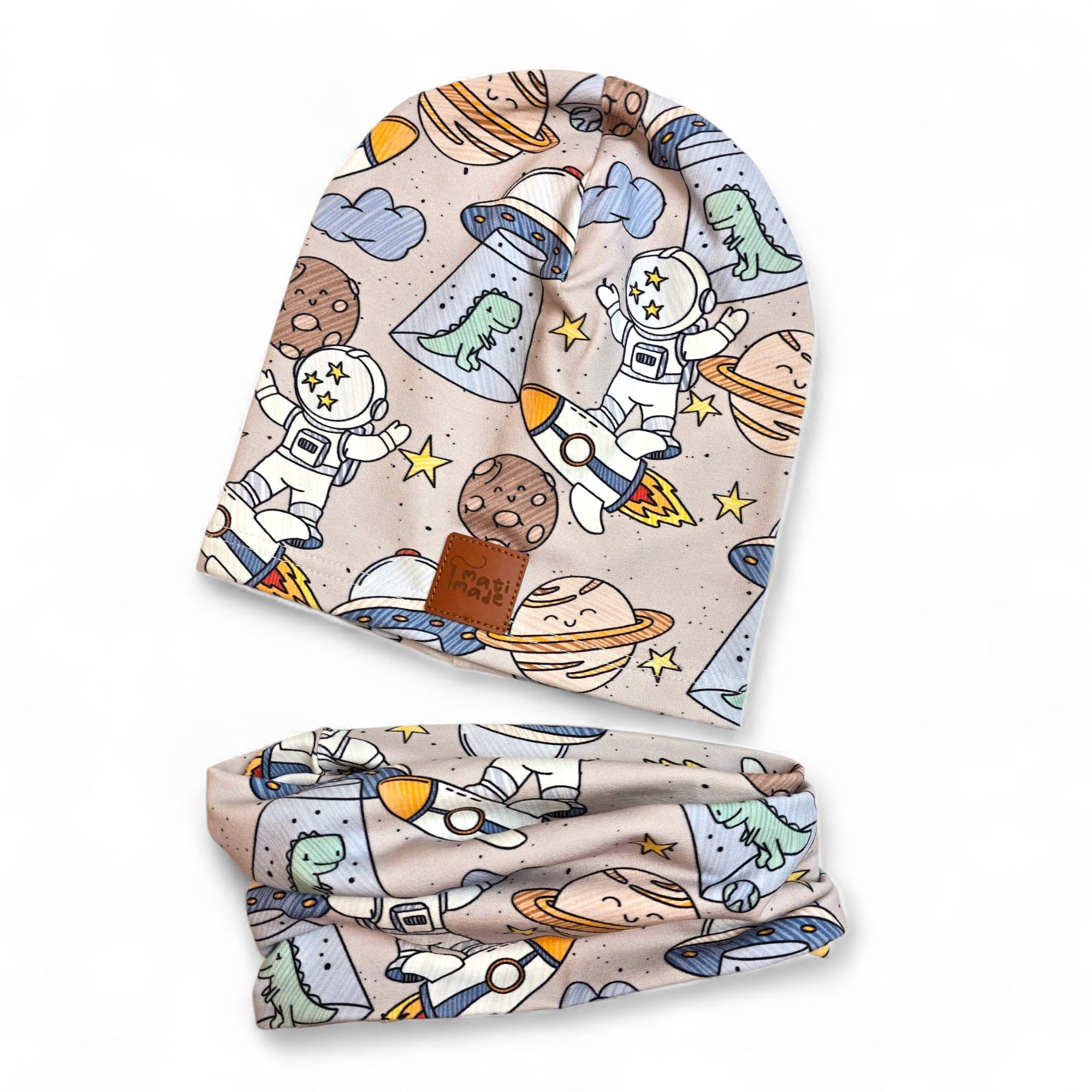 Zestaw czapka i komin „Space Dino” to wyjątkowa propozycja dla małych odkrywców i fanów kosmosu. Autorski wzór powstał we współpracy z polskim grafikiem i jest dostępny wyłącznie w sklepie MatiMade. Urocze dinozaury w statkach kosmicznych, mali astronauci, rakiety i planety to motyw, który z pewnością wyróżni Twoje dziecko na placu zabaw, w przedszkolu czy w drodze na spacer.