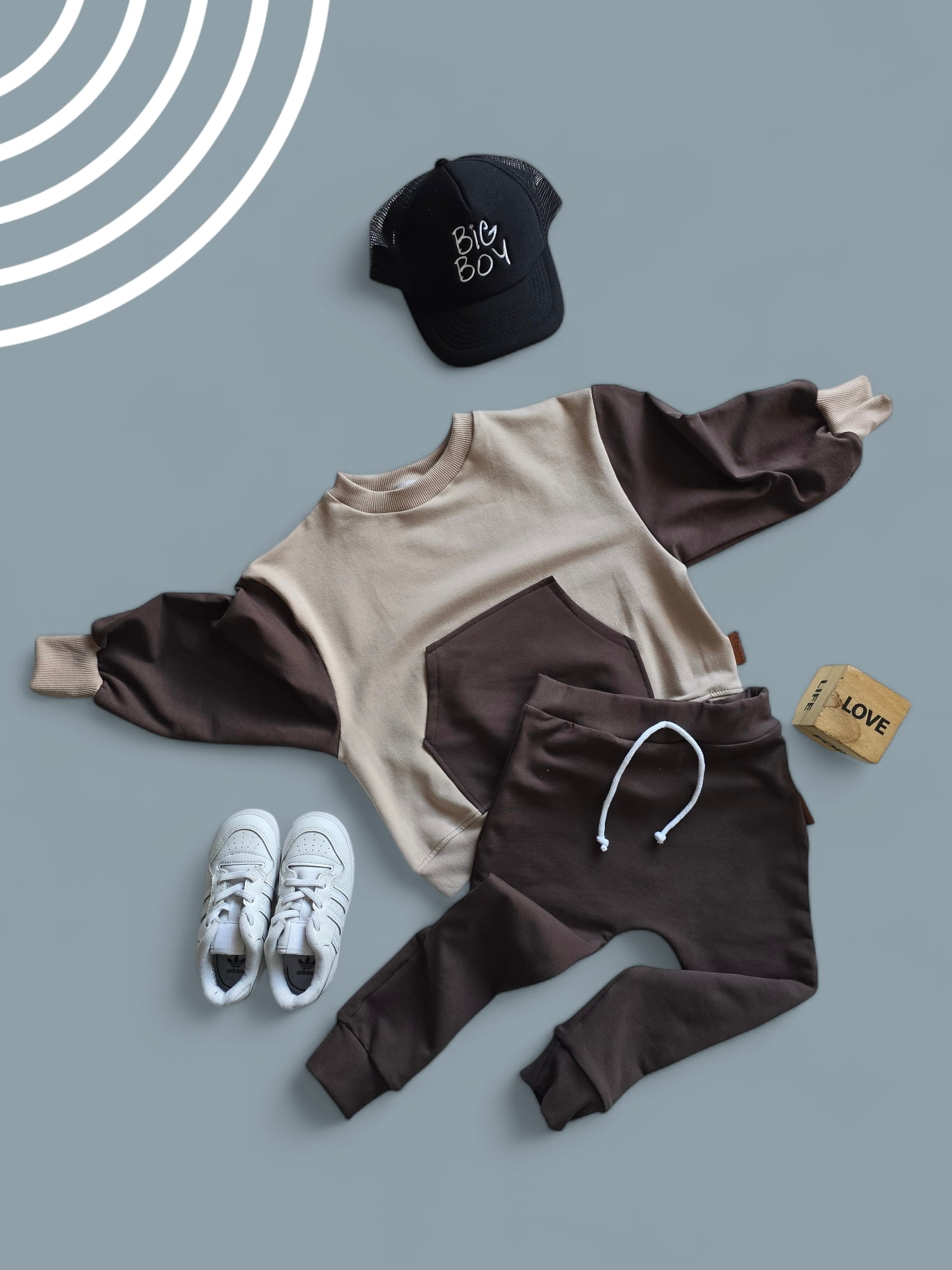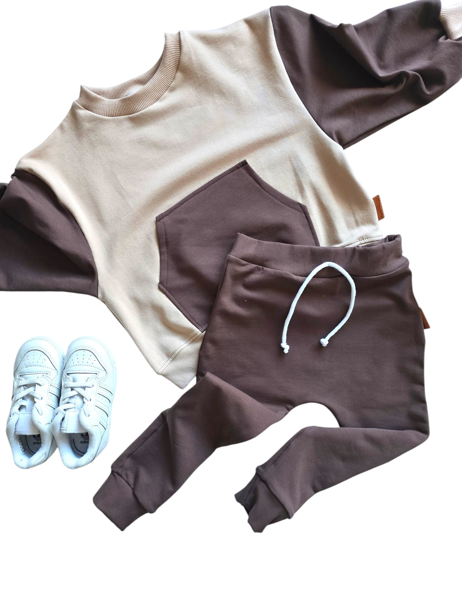 Dres dziecięcy w neutralnych kolorach - wygodny i stylowy zestaw oversize dla Twojego dziecka! Wykonany z wysokiej jakości polskich dzianin, składa się z bluzy z dużą kieszenią kangurką i spodni baggy z gumką w pasie oraz praktycznym sznureczkiem do regulacji.