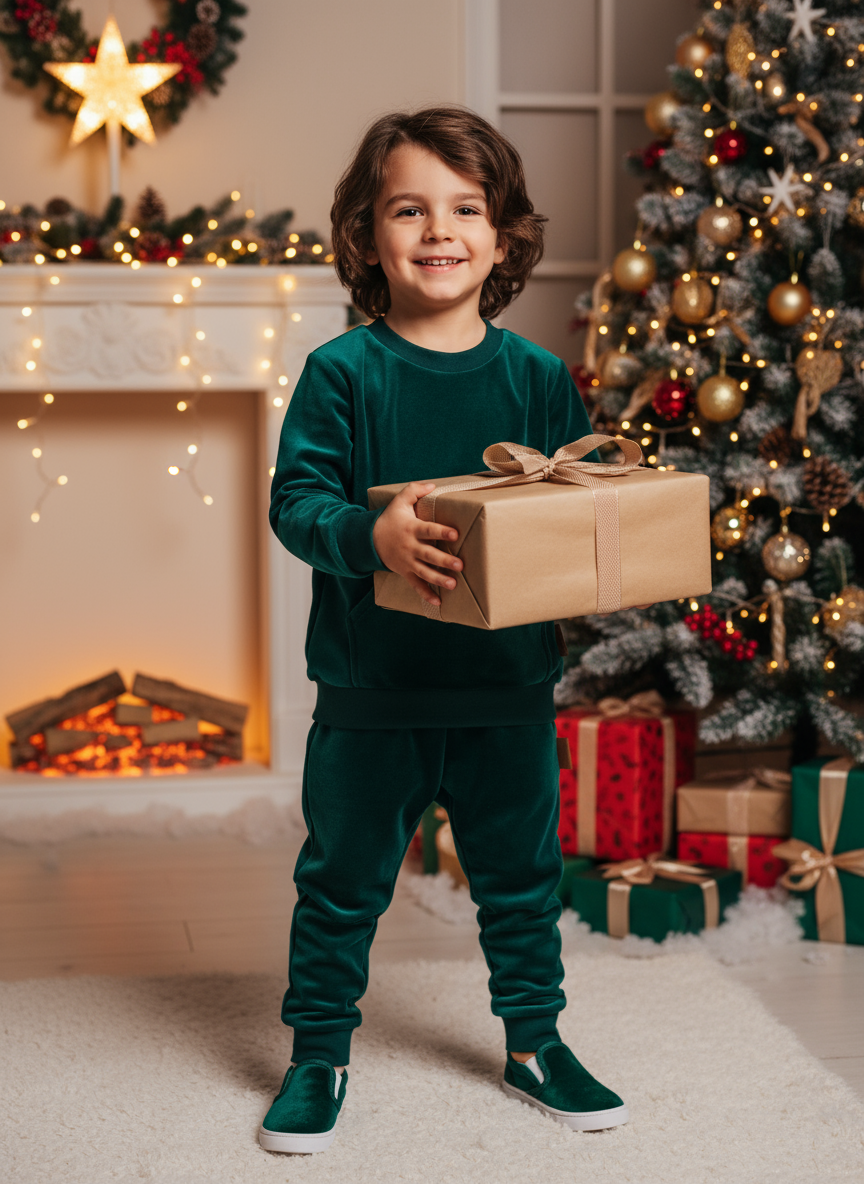Wykonany z certyfikowanej dzianiny bawełnianej z dodatkiem elastanu, jest miękki w dotyku, elastyczny i nie krępuje ruchów. Wyróżnia się eleganckim wyglądem weluru, a jednocześnie zachowuje funkcjonalność klasycznego dresu dziecięcego.