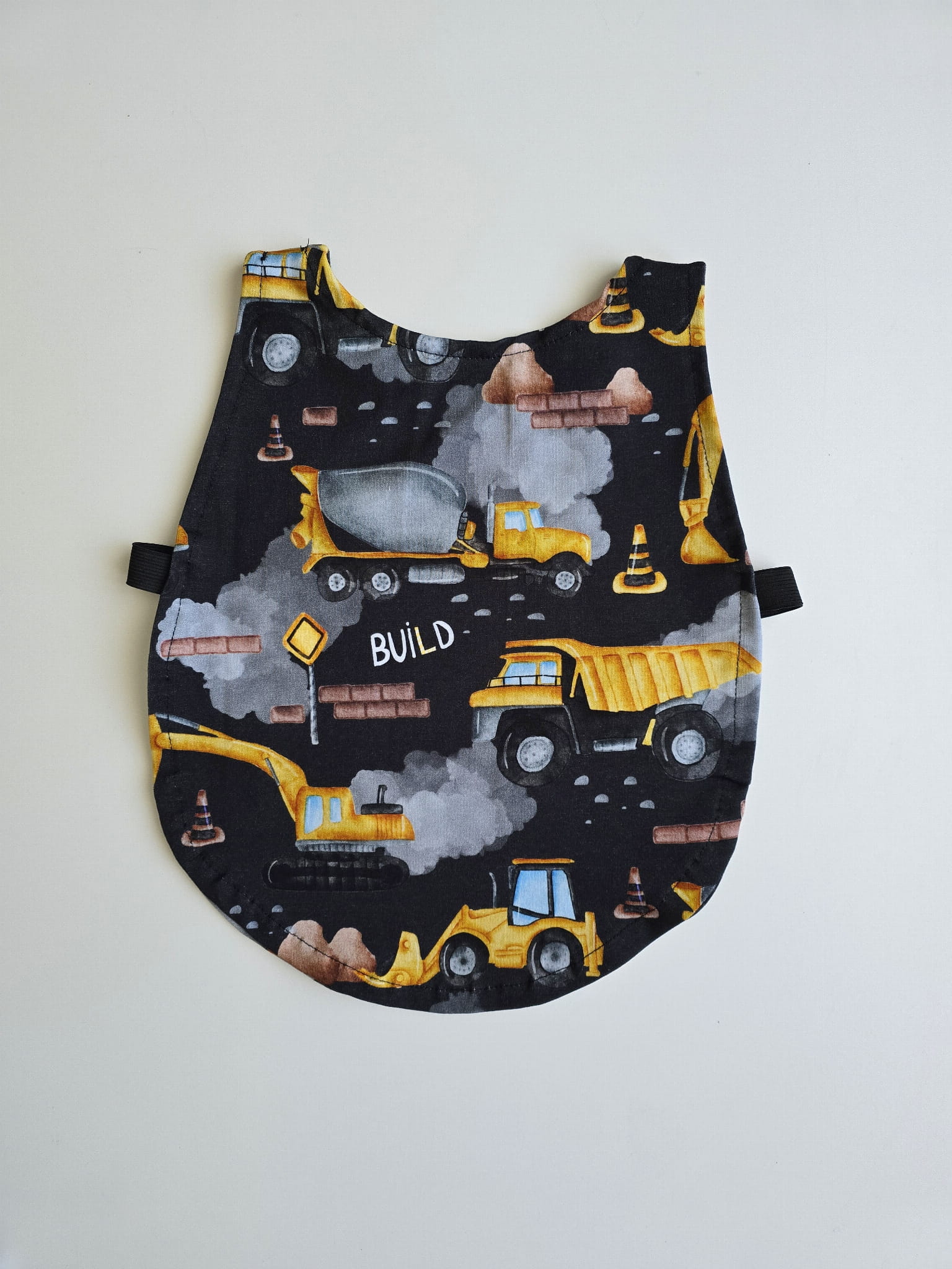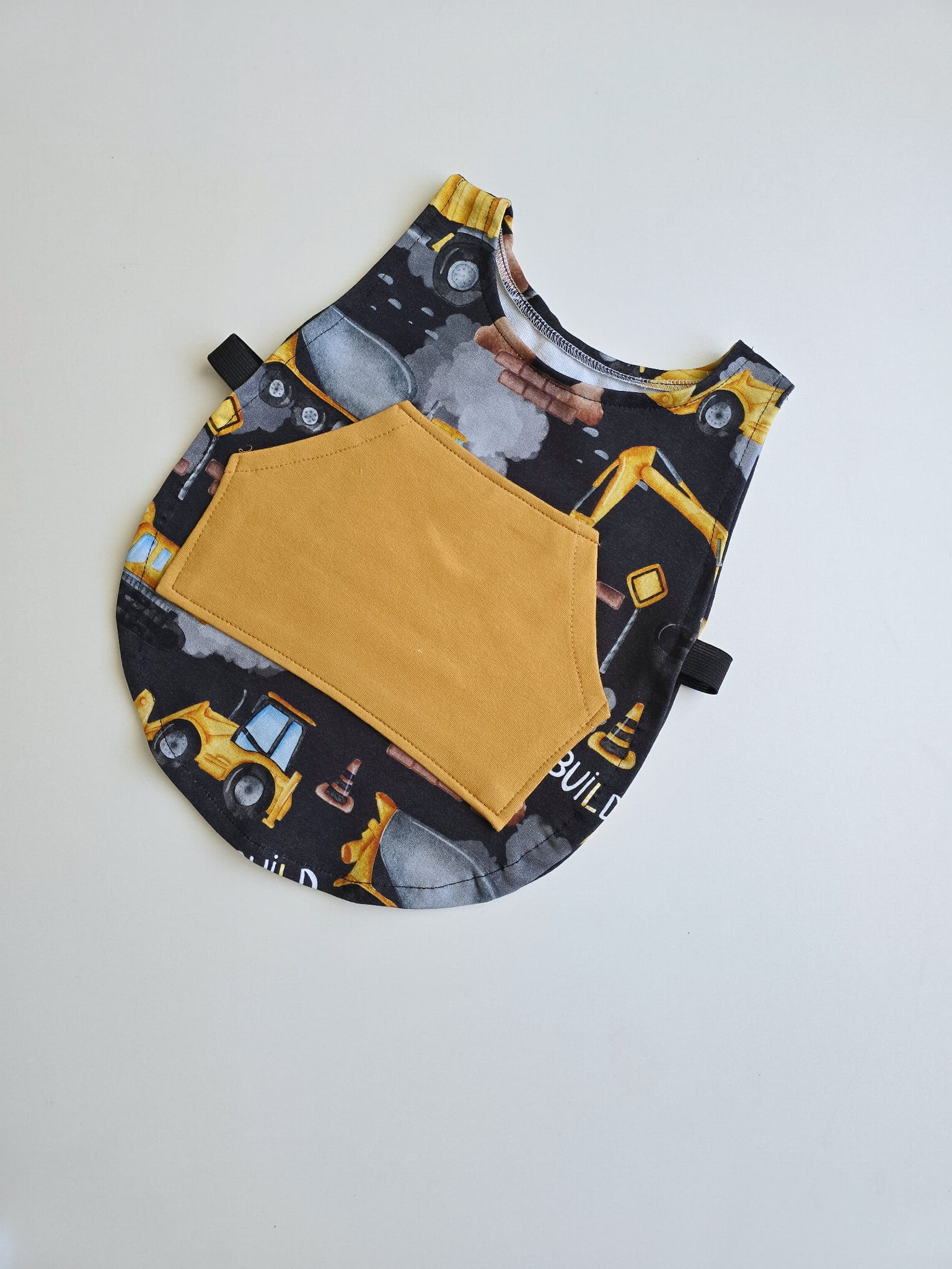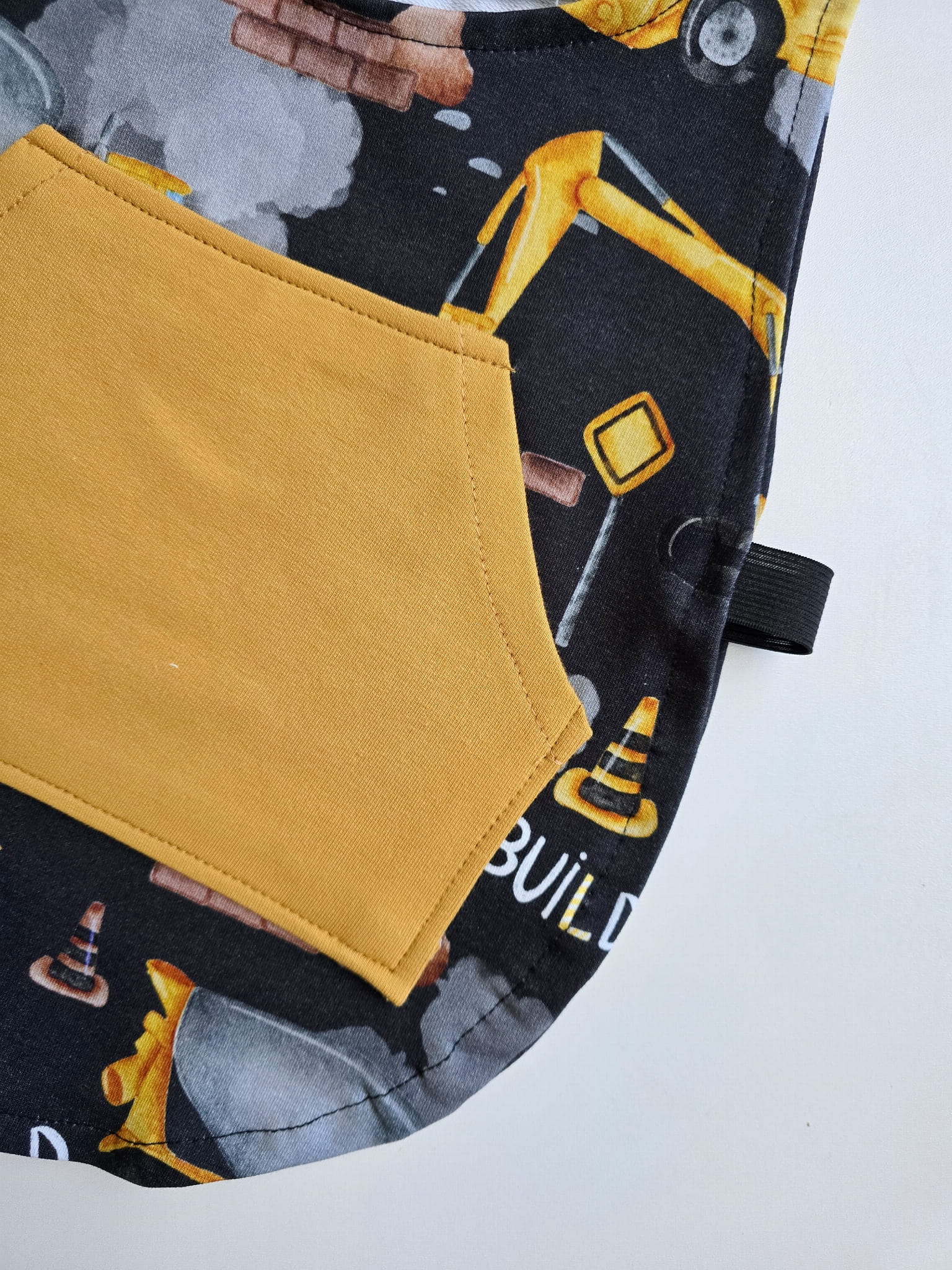 - Wzory: Fartuszki dostępne z motywem budowlanym z przednią kieszonką w kolorze musztardowym