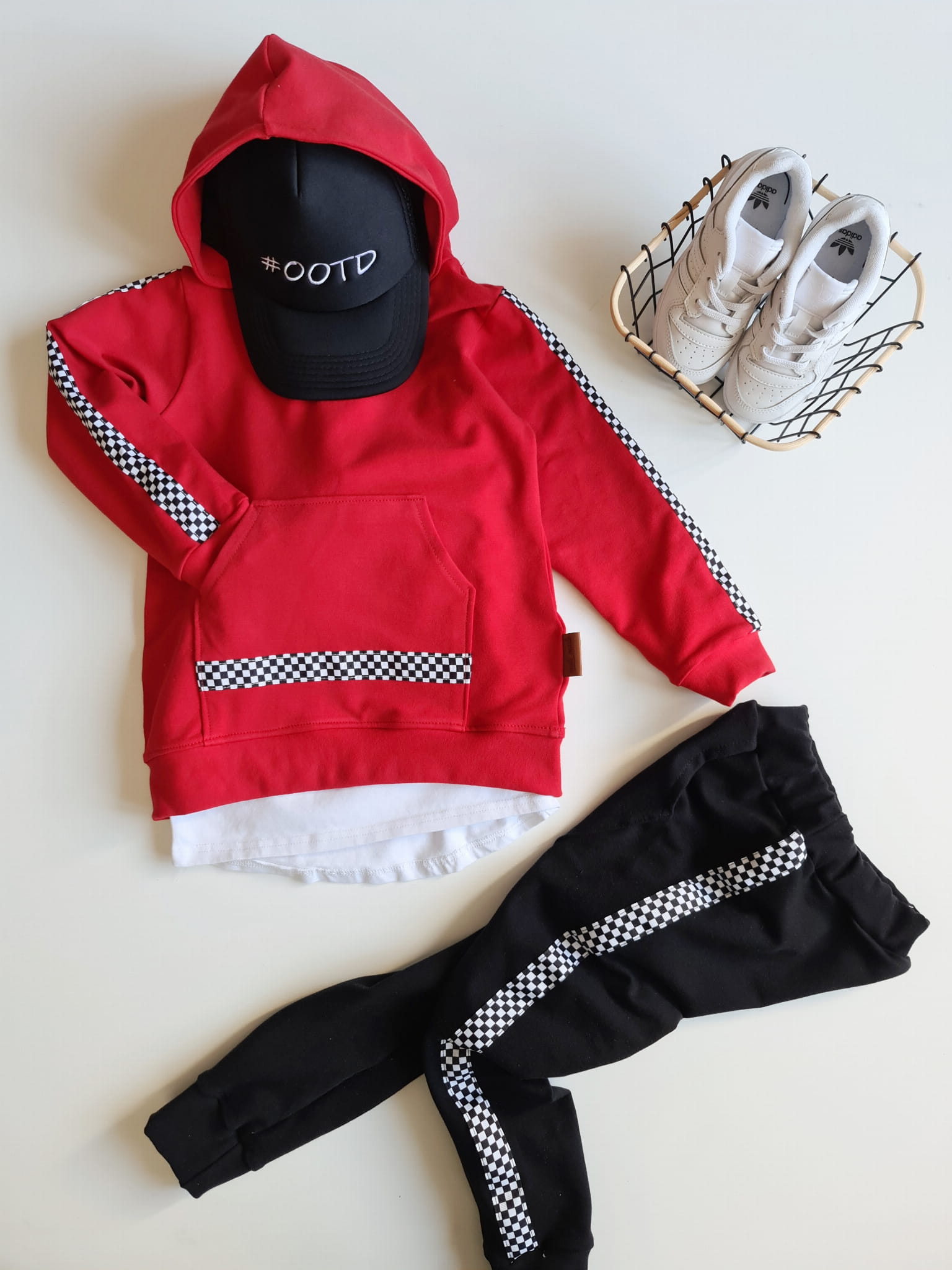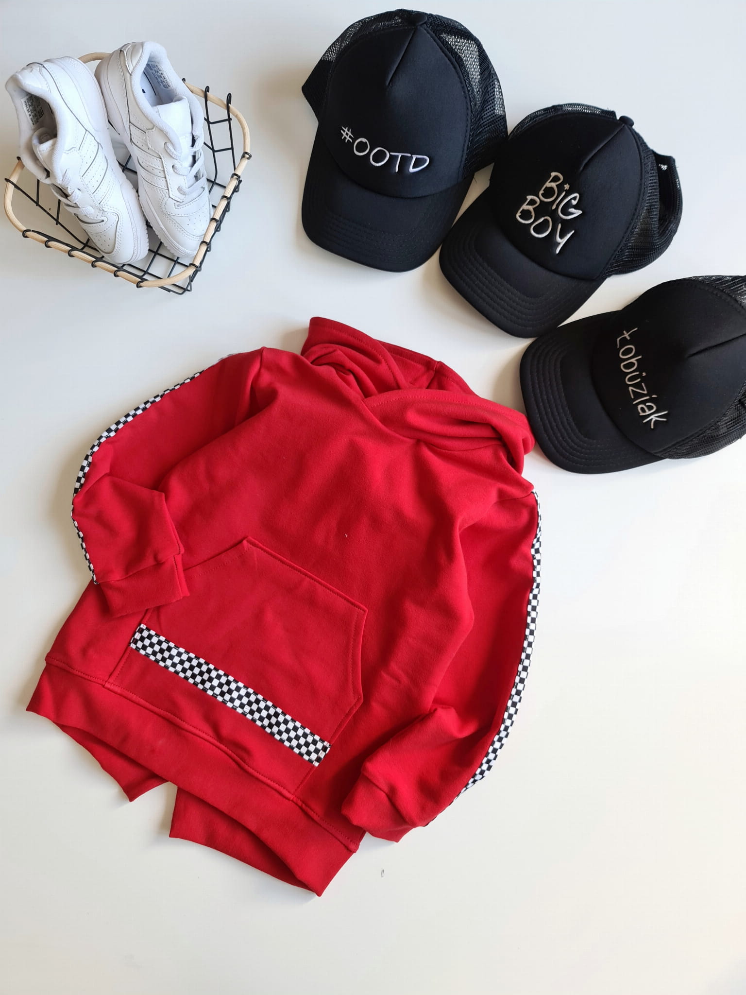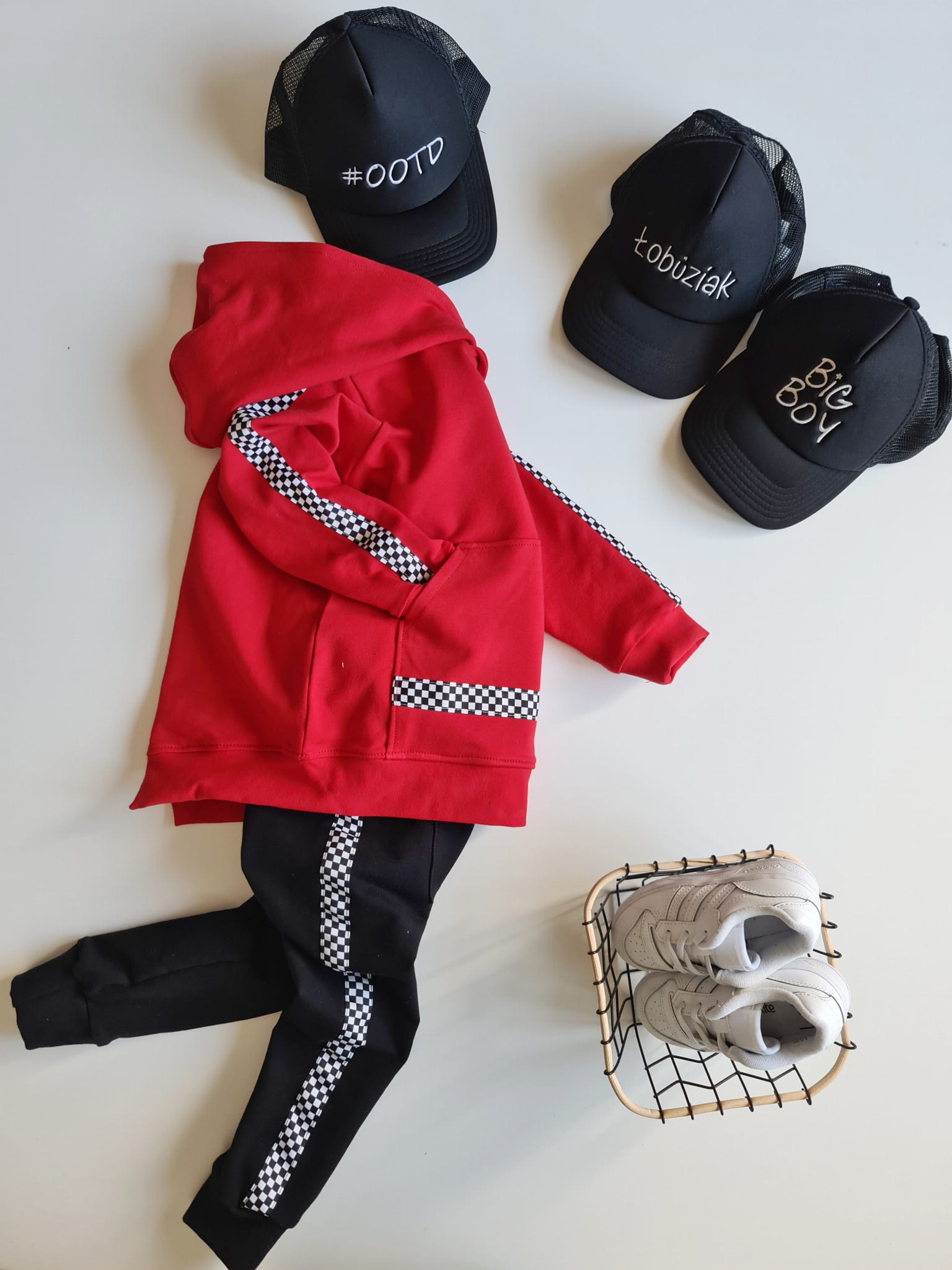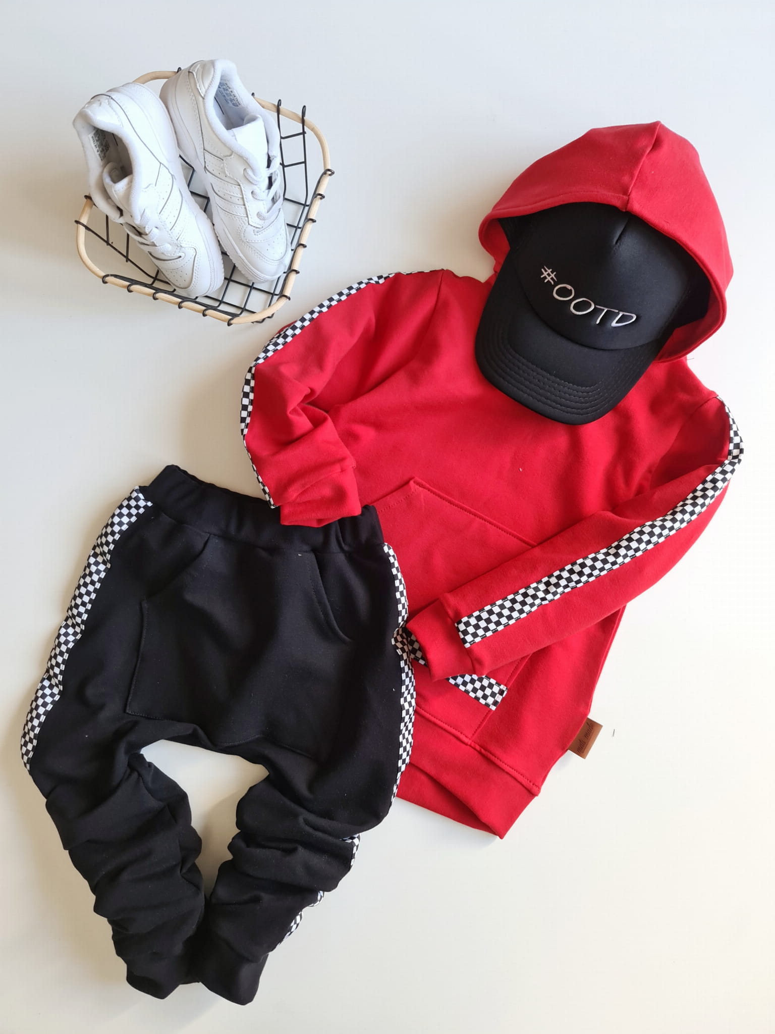 Komplet bluza czerwona z lampasem szachownica i baggy czarne