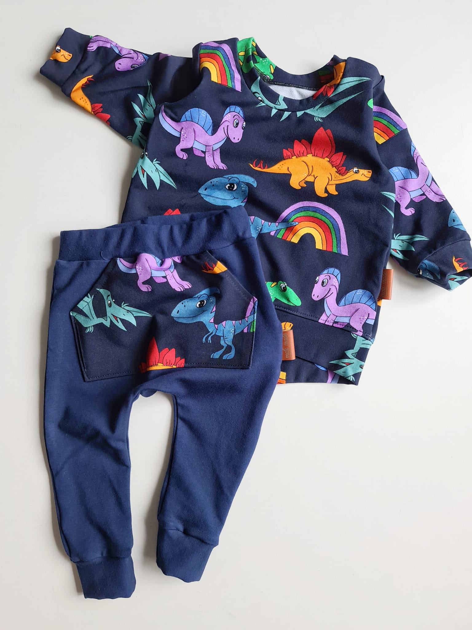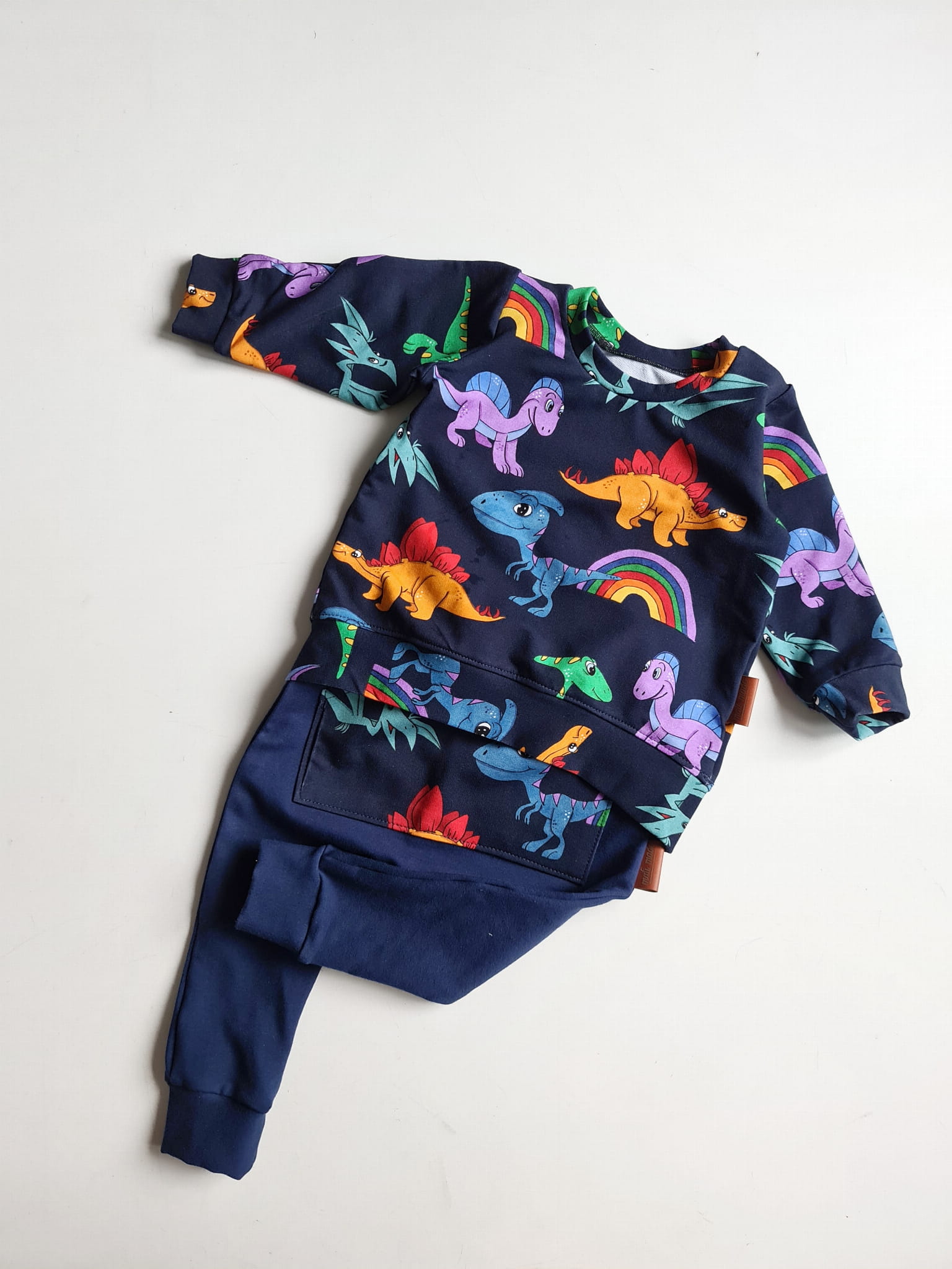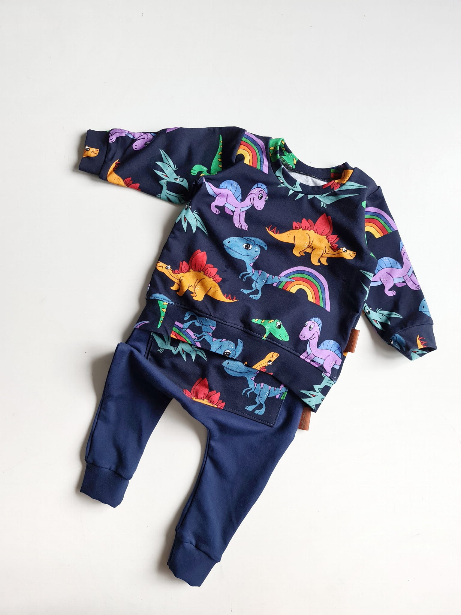 Odkryj wyjątkowy komplet "Nasze Dinusie na granacie", który zachwyci każdego małego miłośnika dinozaurów! Wygodna bluza oraz stylowe baggy z uroczym motywem dinozaurów na granatowym tle to doskonały wybór na każdą okazję – od przedszkola po rodzinne spacery. Komplet został uszyty w naszej pracowni z najwyższej jakości dzianiny bawełnianej (92% bawełny, 8% elastanu), zapewniając pełną swobodę ruchu i komfort noszenia.