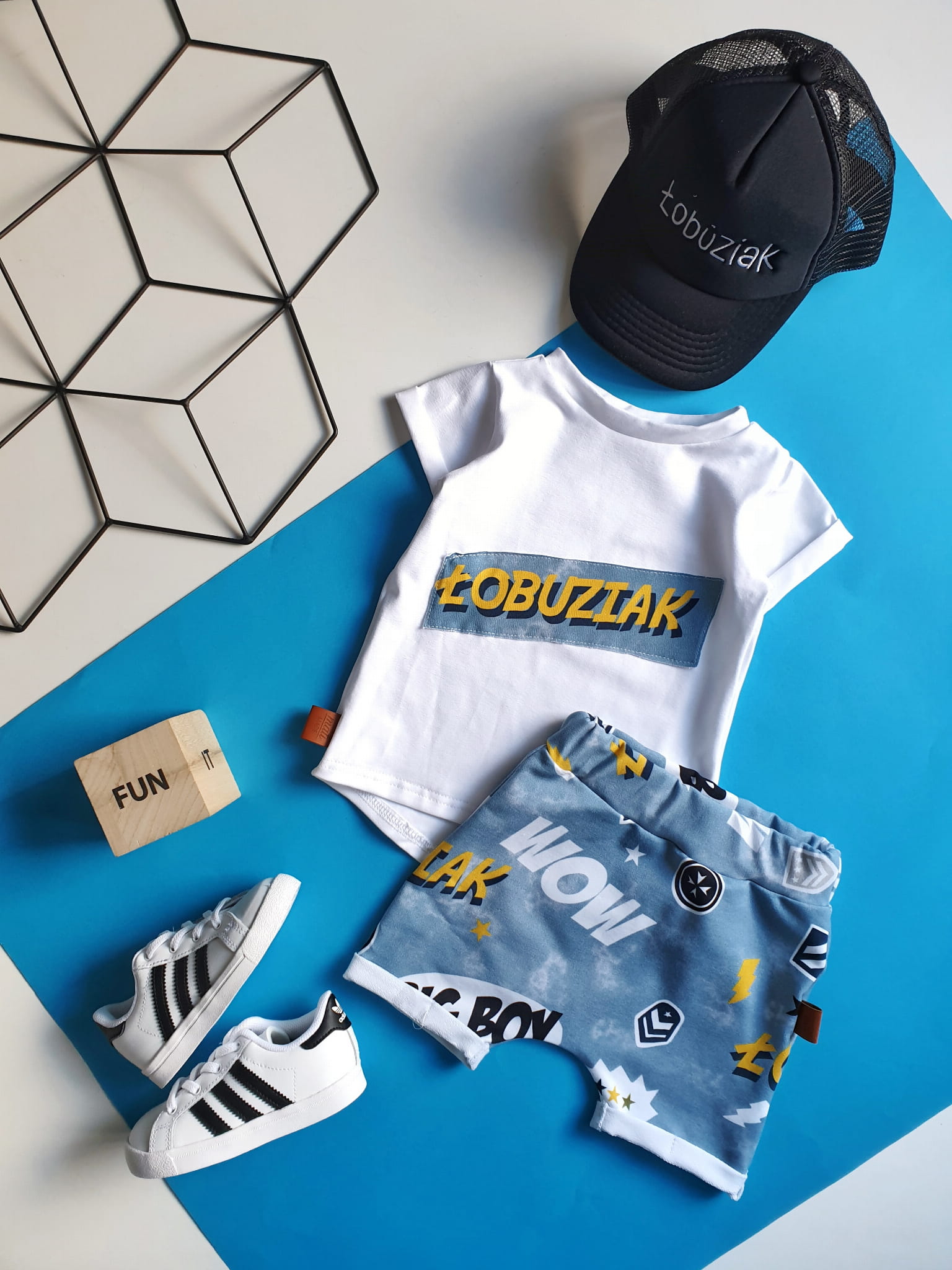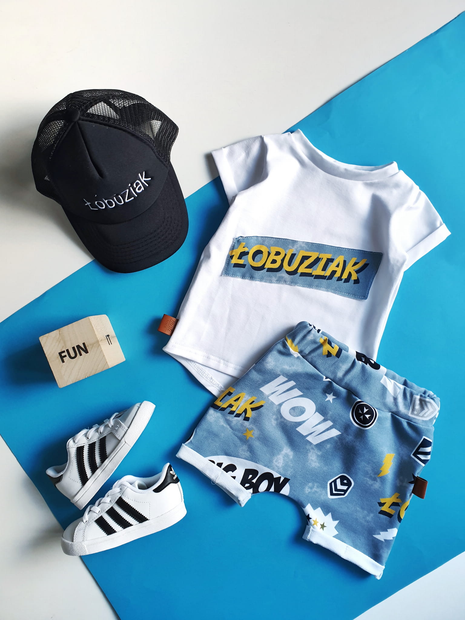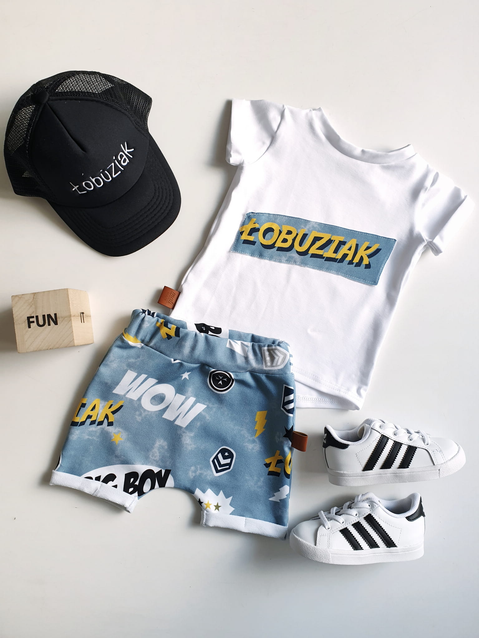 W skład kompletu wchodzi: bluzeczka krótki rękaw i szorty z gumką w pasie.