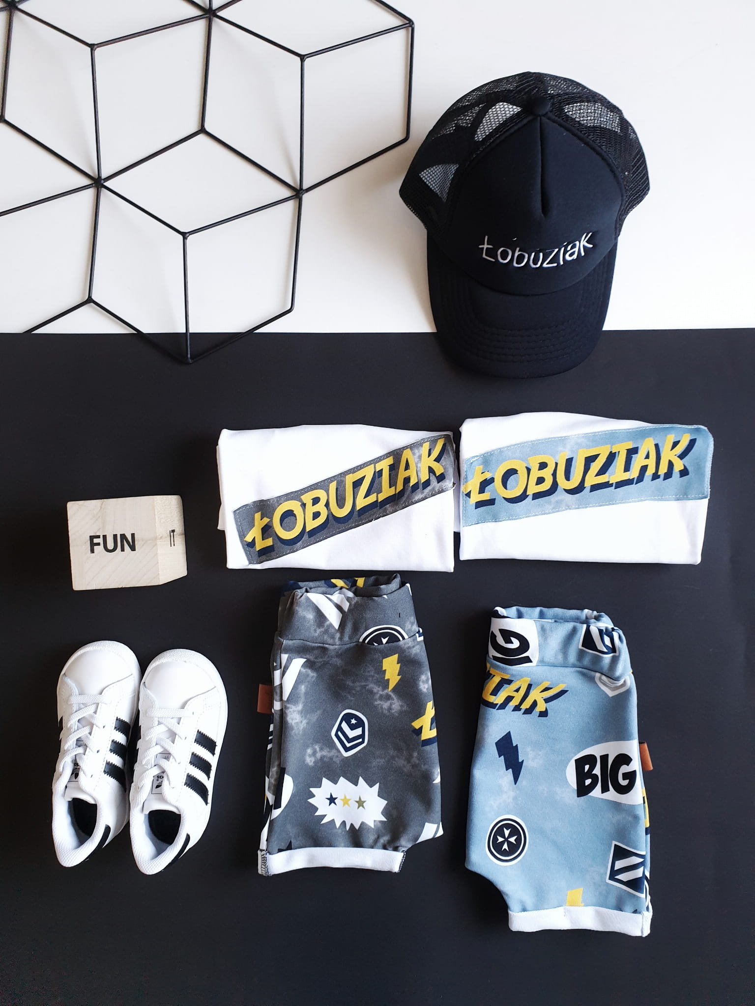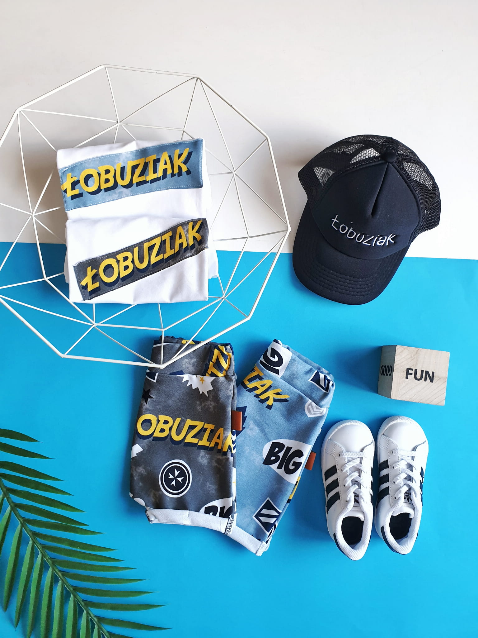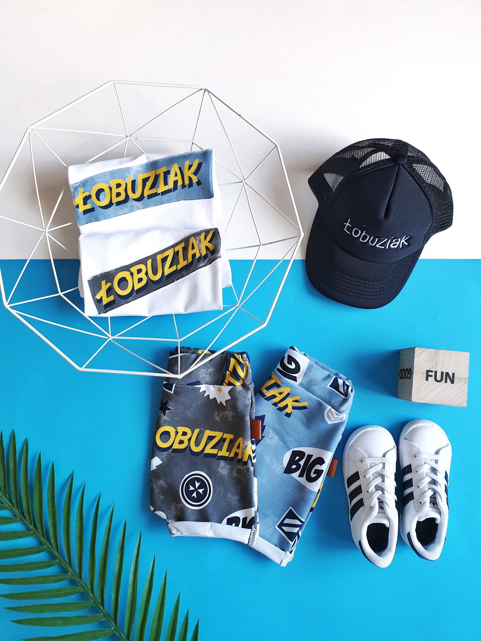 W skład kompletu wchodzi: bluzeczka krótki rękaw i szorty z gumką w pasie.