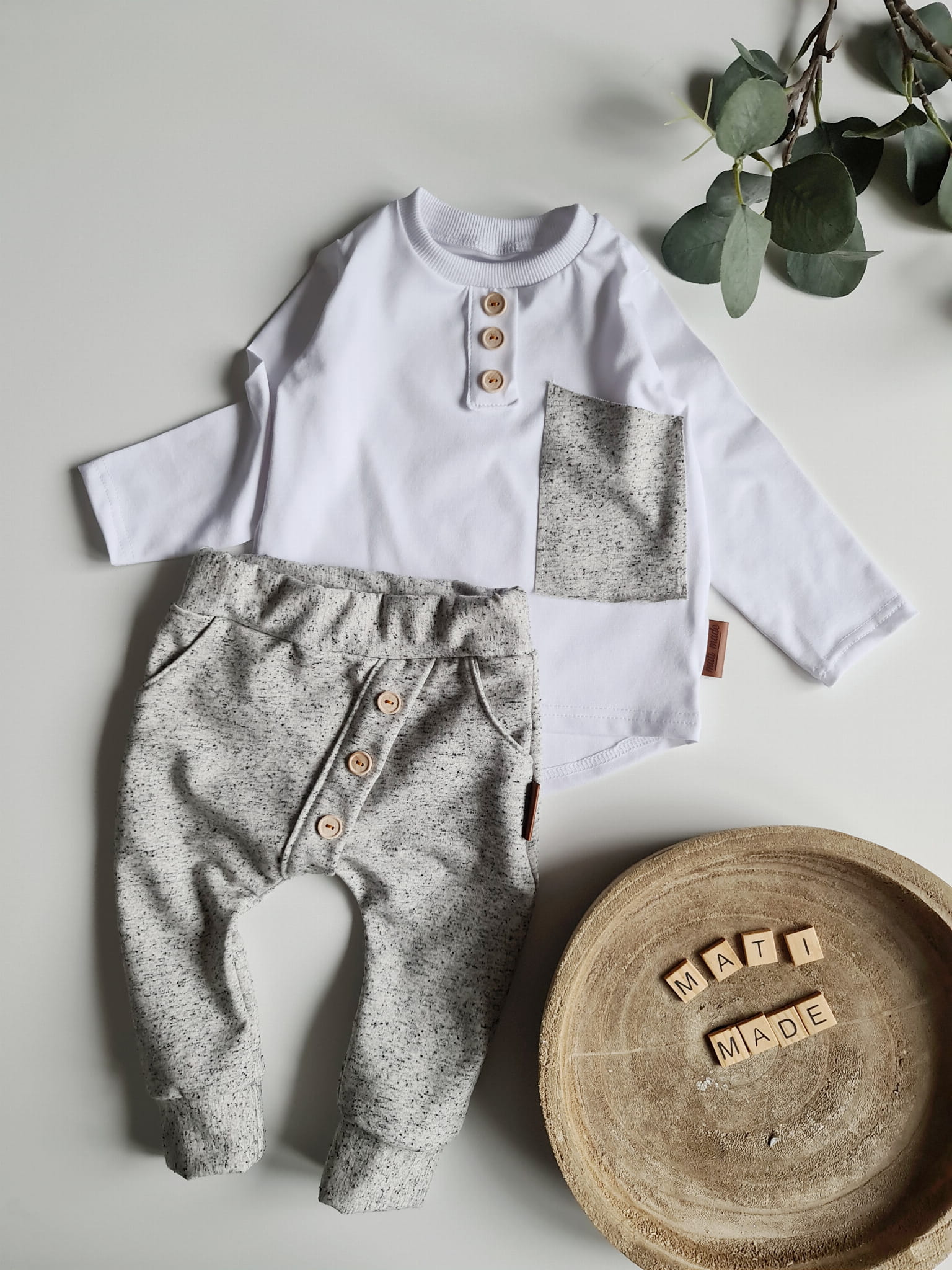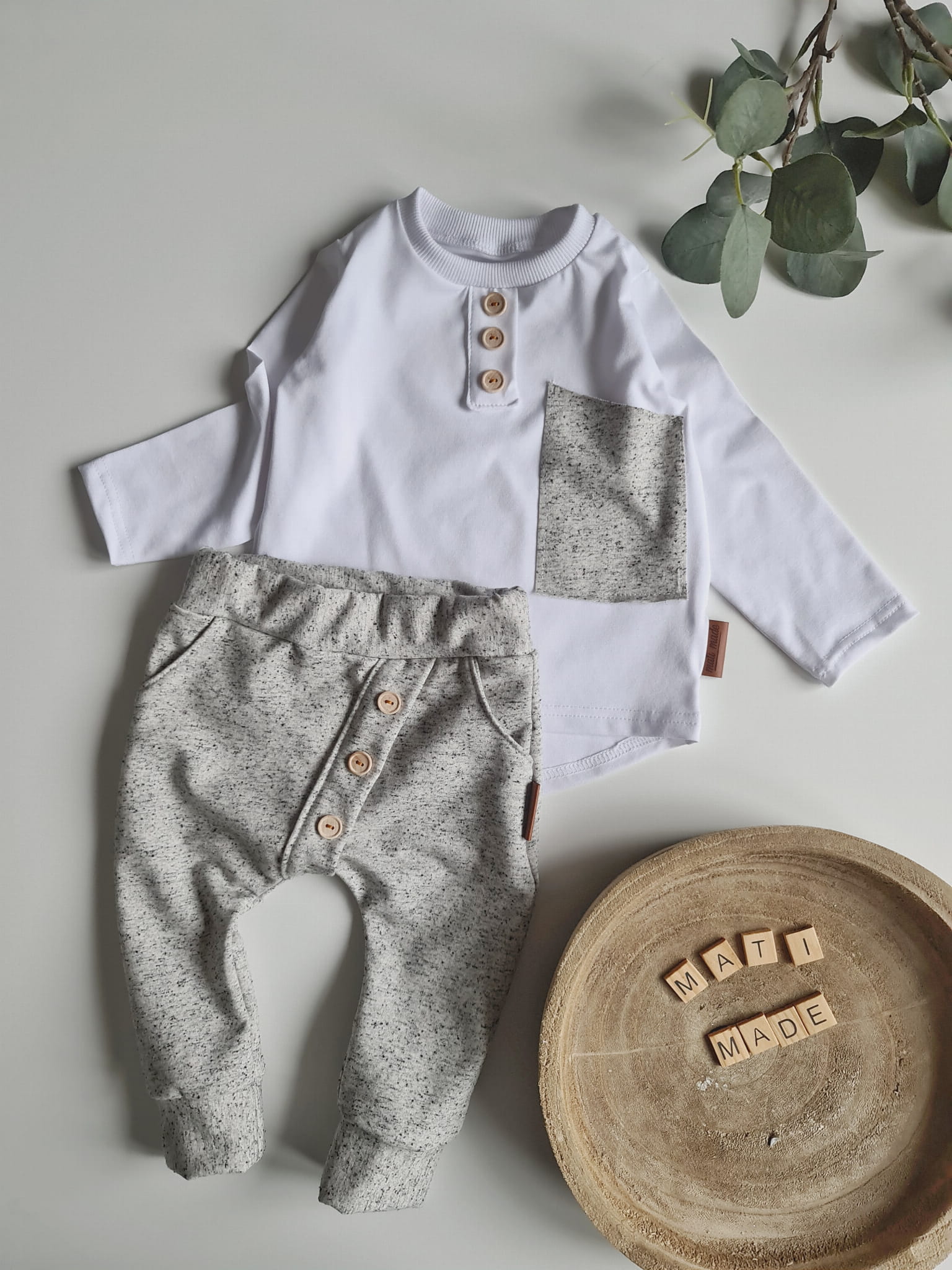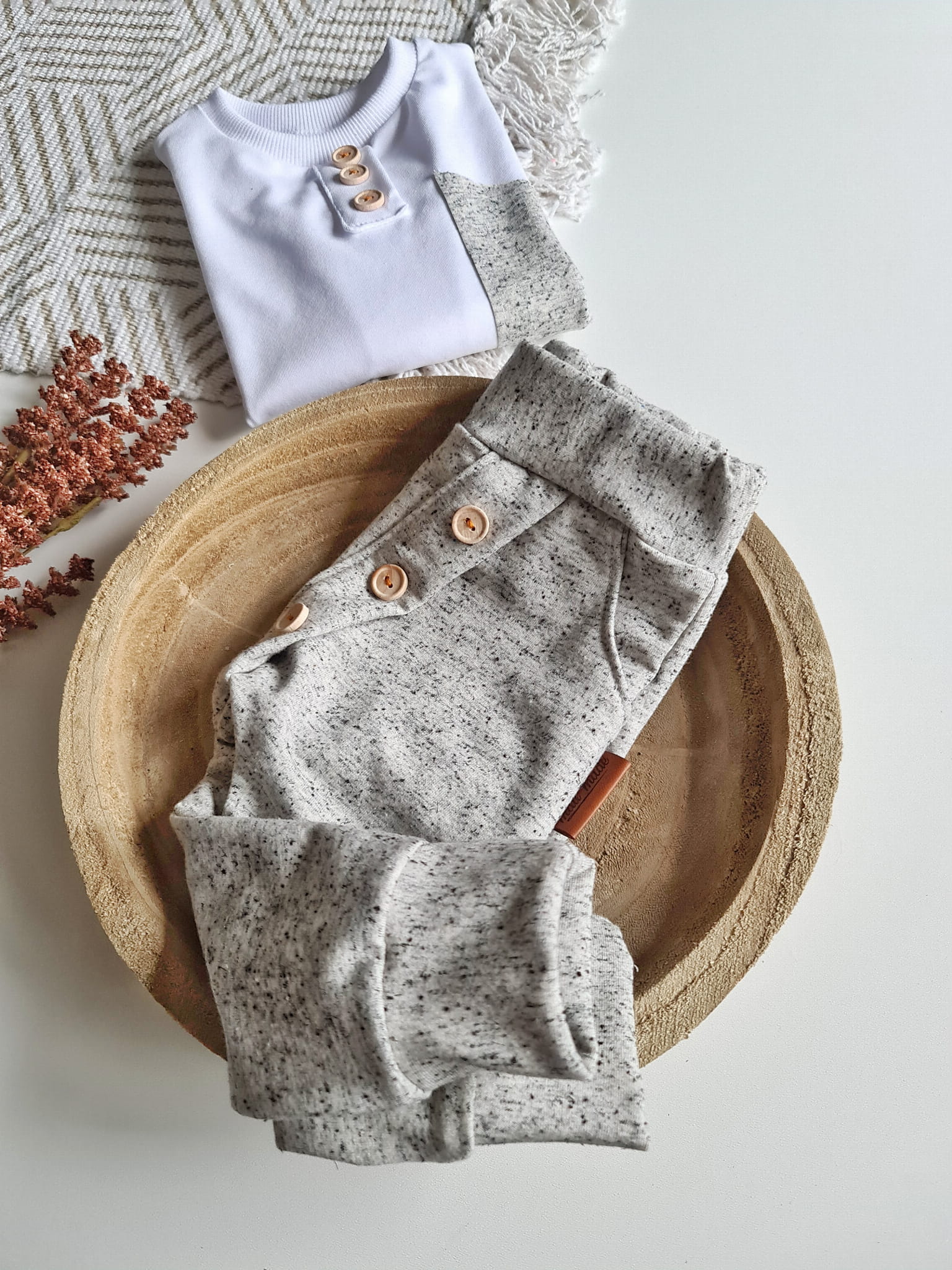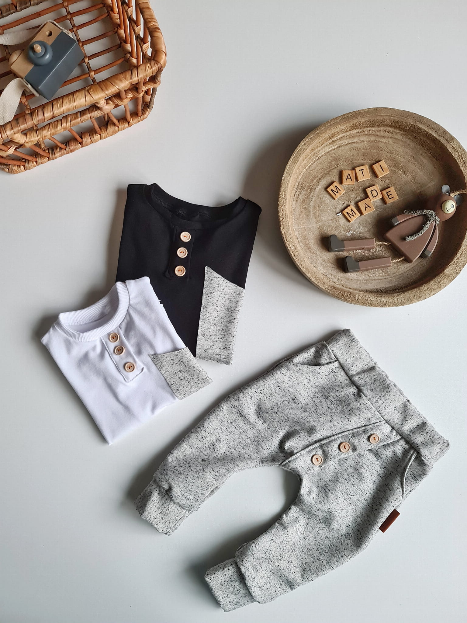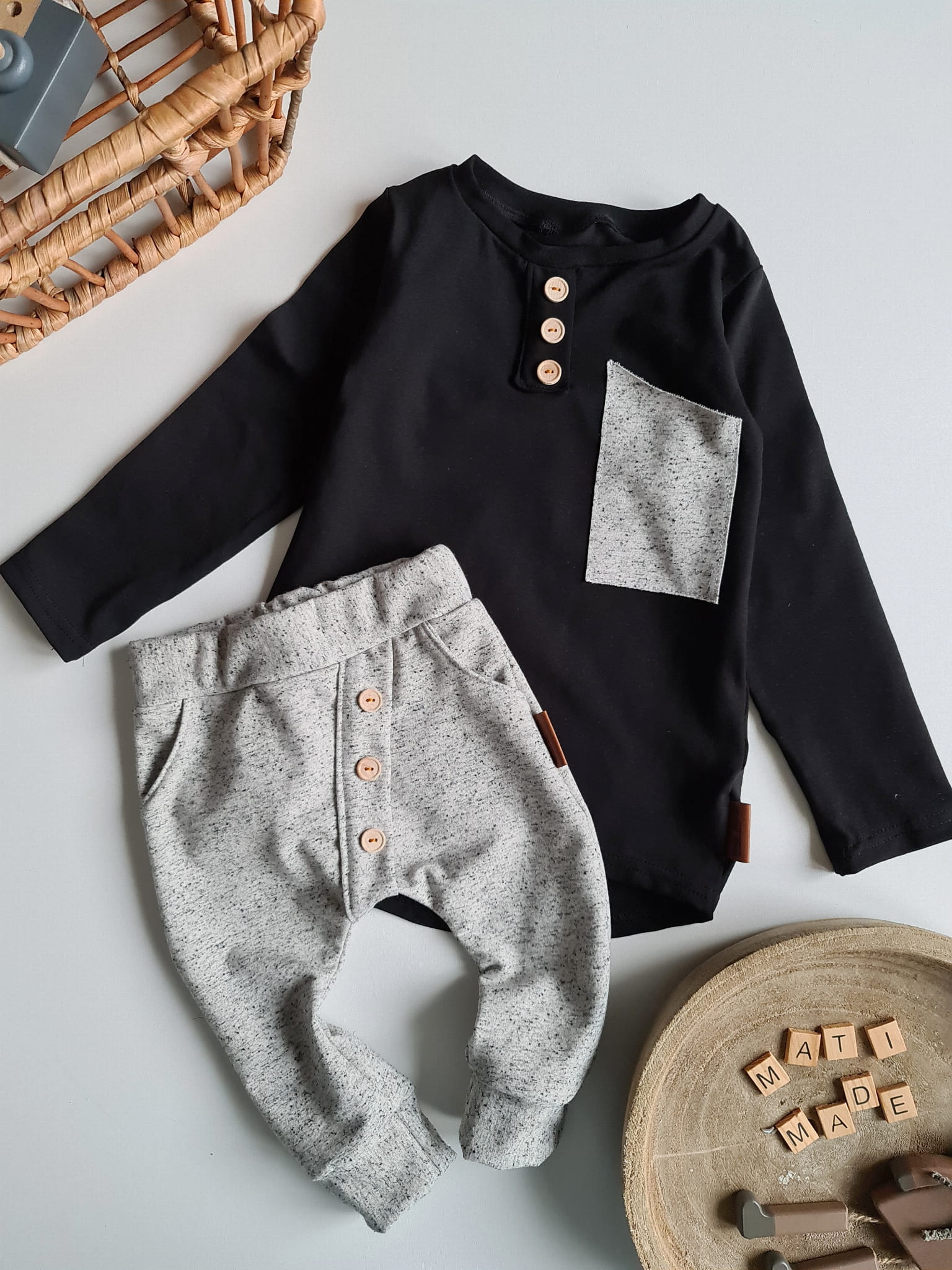Stylowy komplet dla dziecka, w którym wygoda spotyka się z elegancją. Klasyczna czerń z kontrastem bieli oraz drewniane guziki nadają wyjątkowego charakteru, a luźny krój sprawia, że to ubranko idealnie nadaje się do codziennych aktywności, przedszkola, sesji zdjęciowych czy rodzinnych spotkań.
