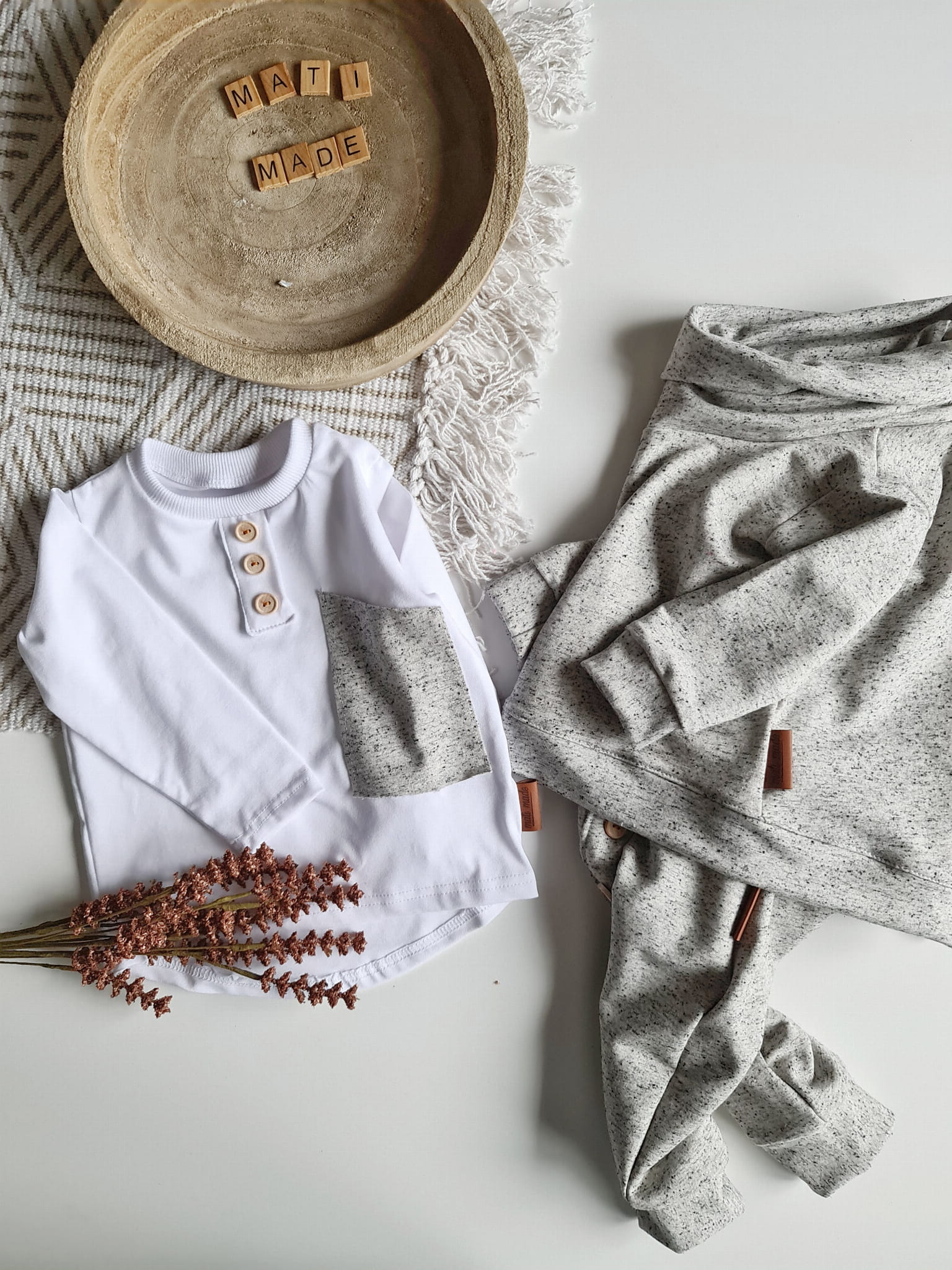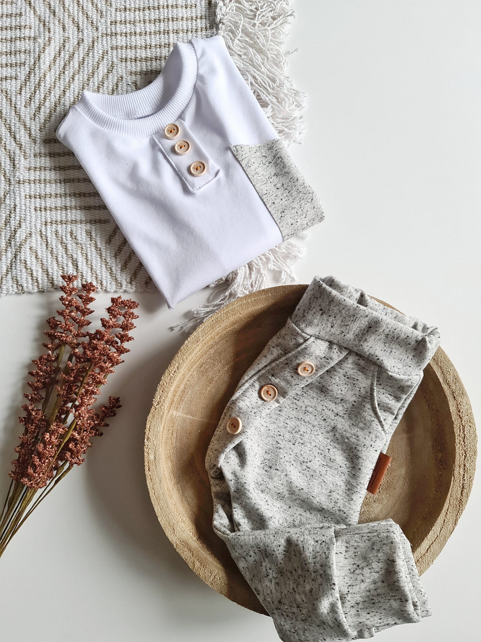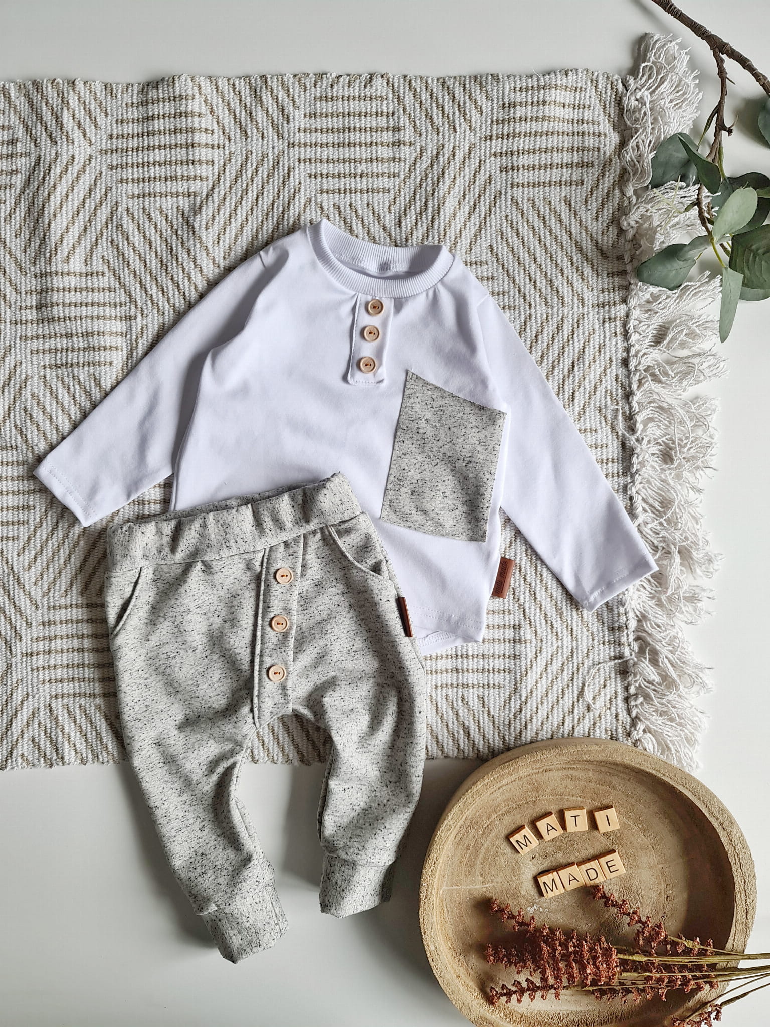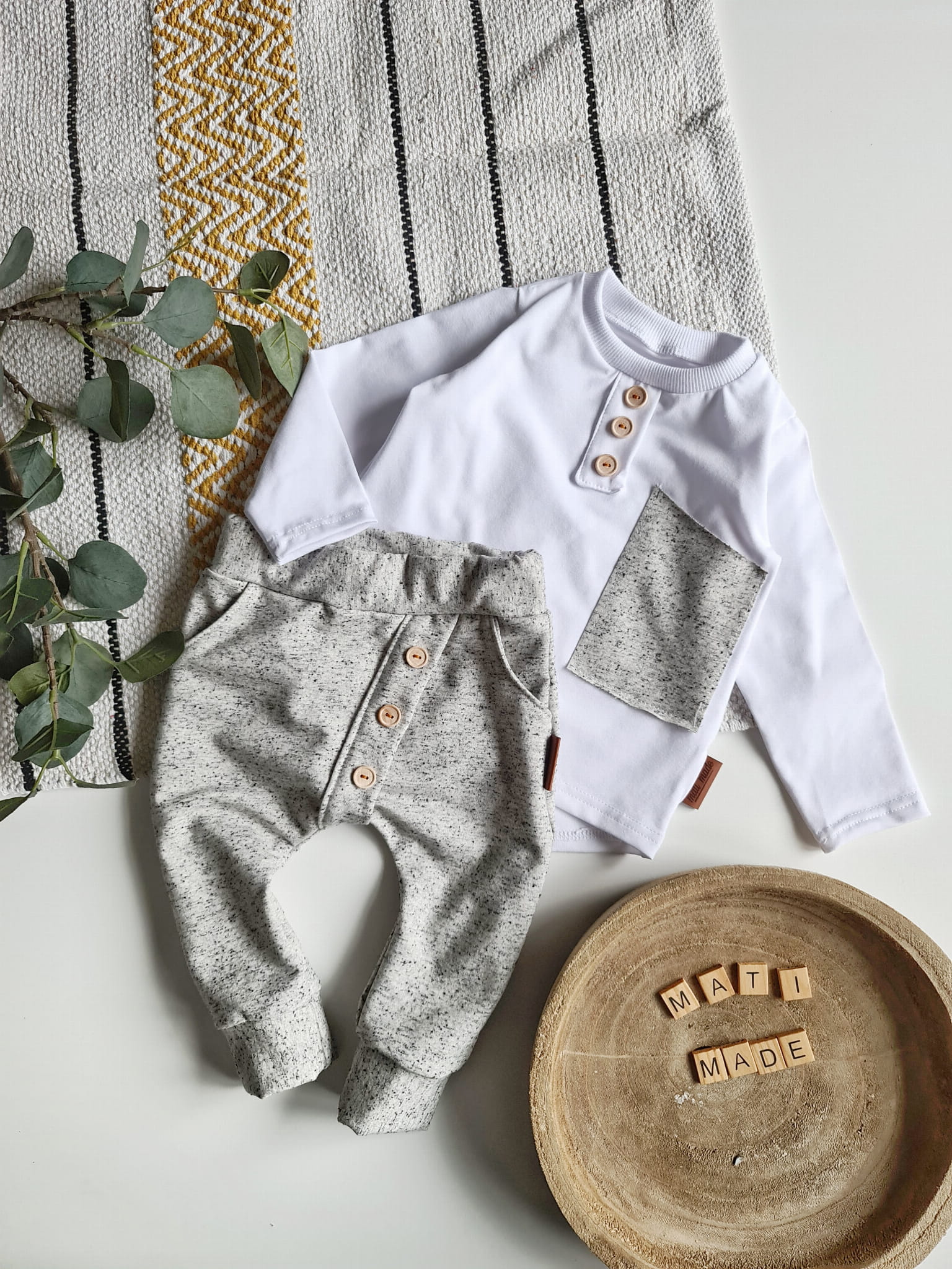 Stylowy komplet dla dziecka, w którym wygoda spotyka się z elegancją. Klasyczna czerń z kontrastem bieli oraz drewniane guziki nadają wyjątkowego charakteru, a luźny krój sprawia, że to ubranko idealnie nadaje się do codziennych aktywności, przedszkola, sesji zdjęciowych czy rodzinnych spotkań.