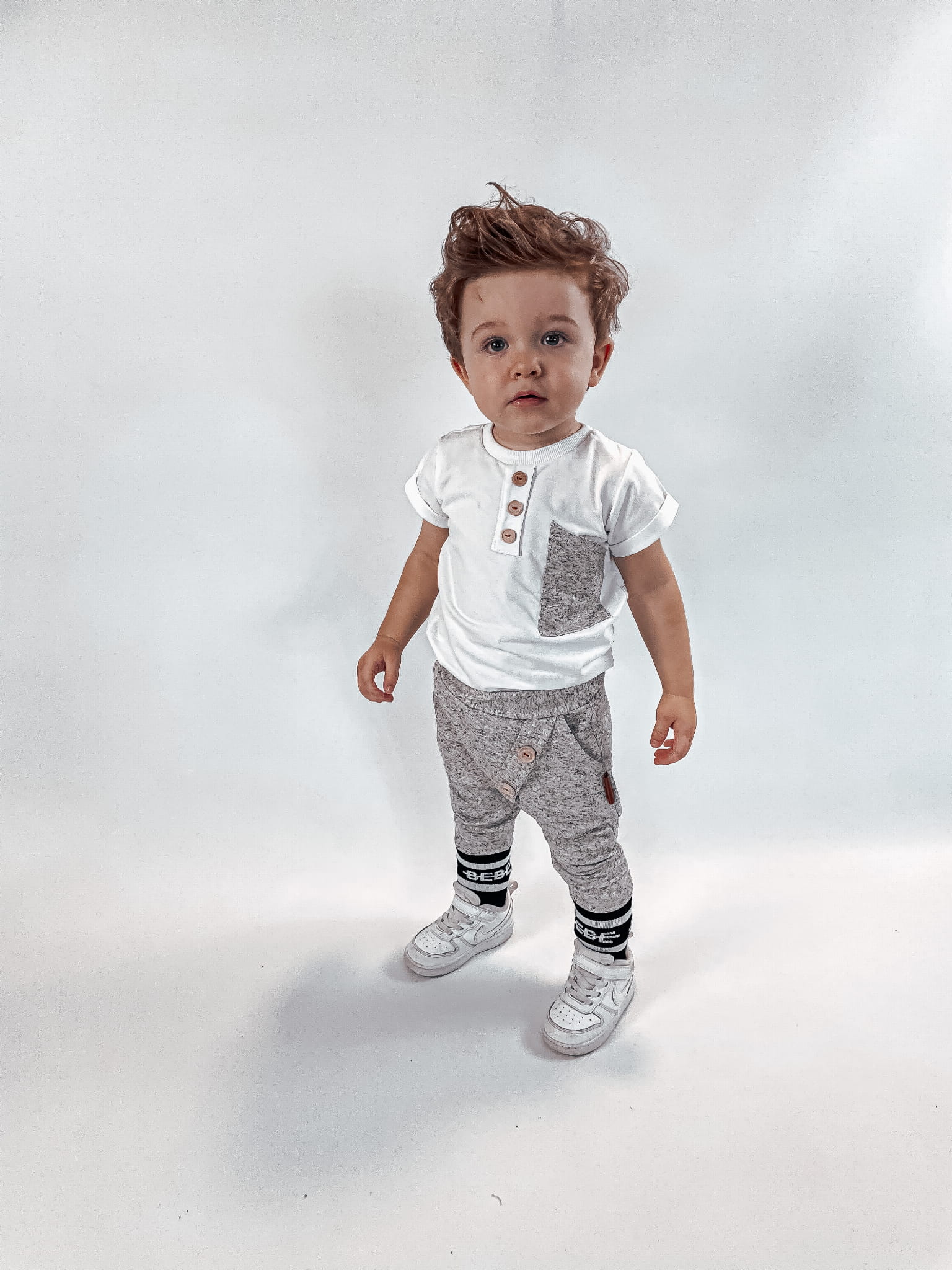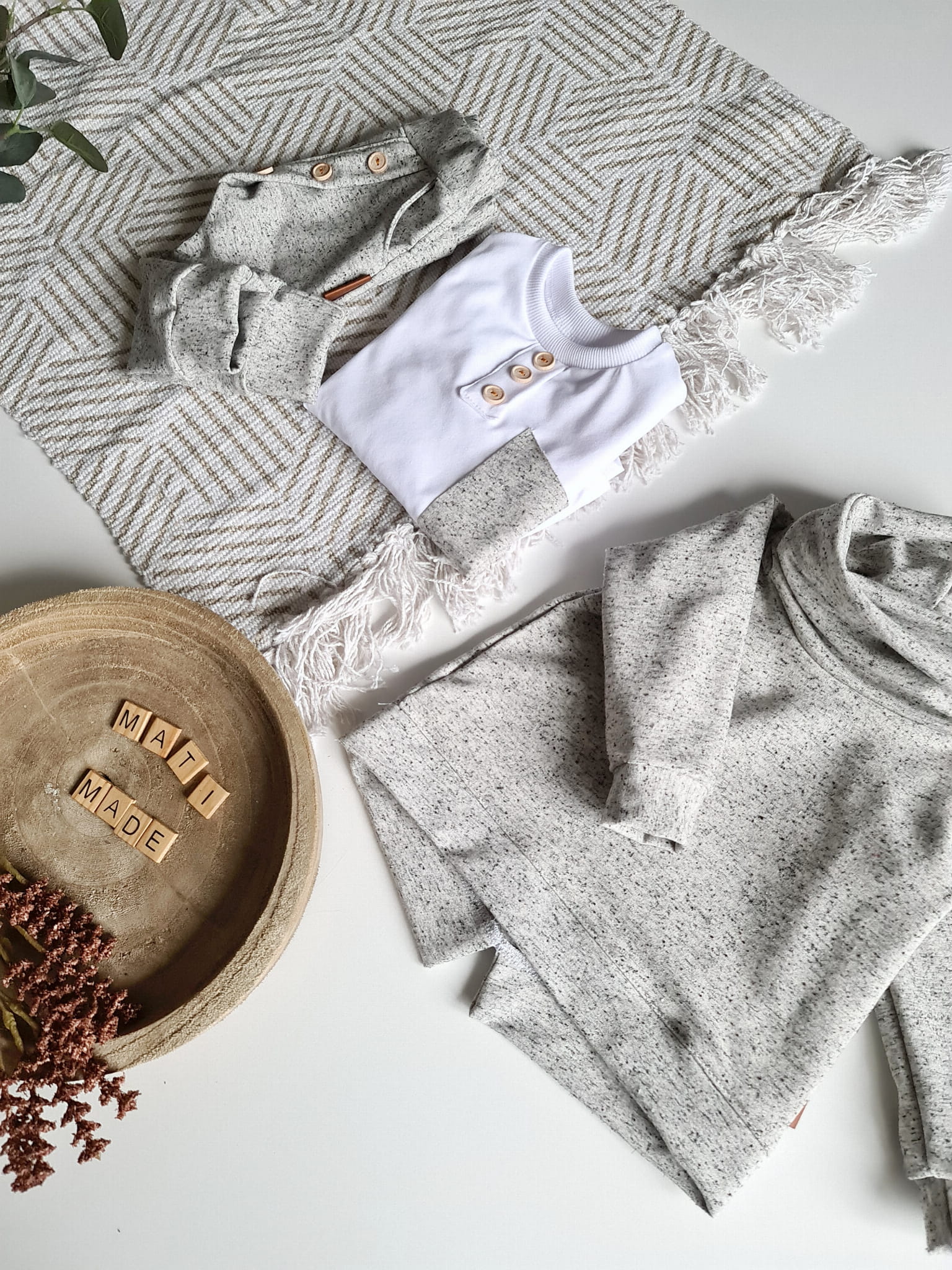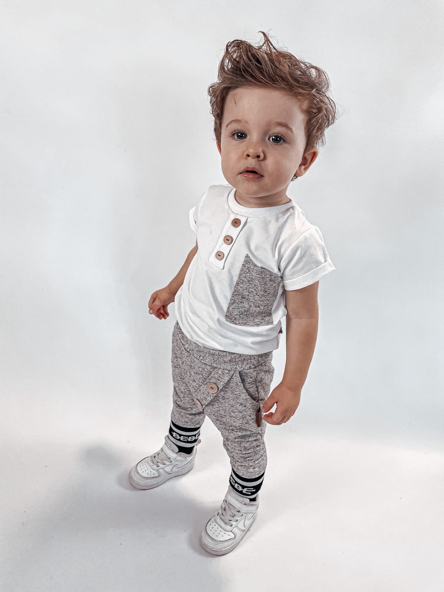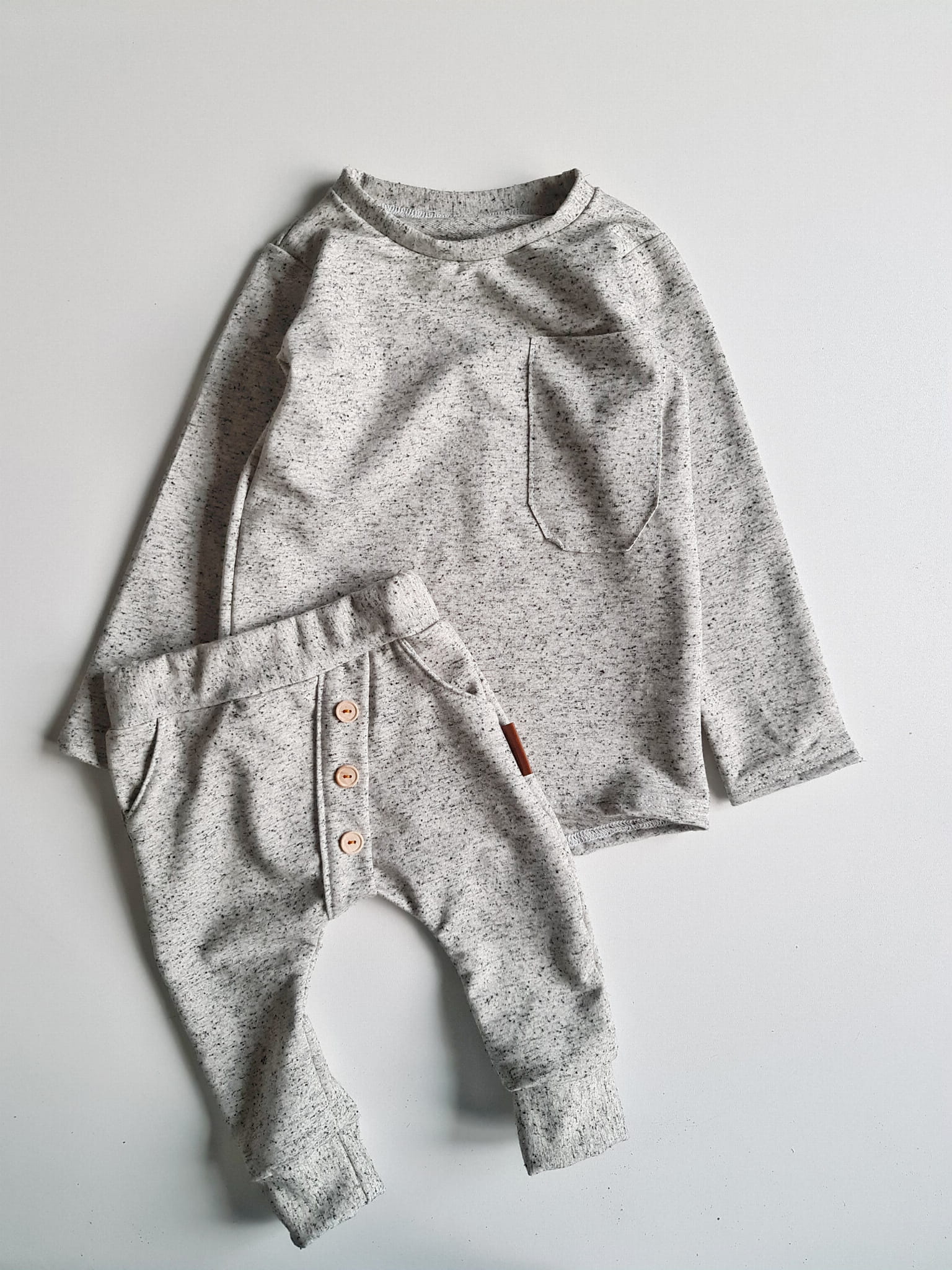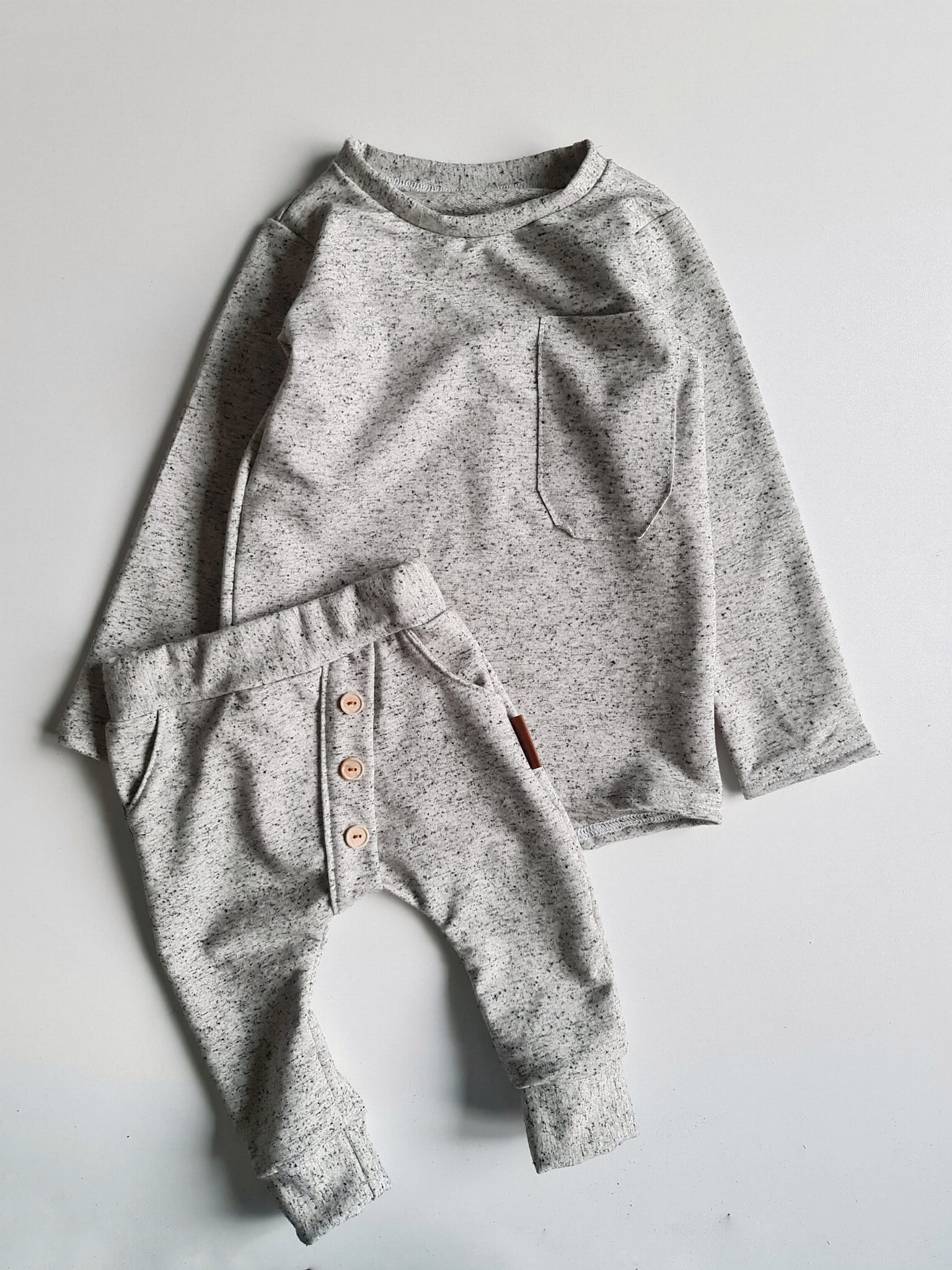 Stylowy komplet dla dziecka, w którym wygoda spotyka się z elegancją. Klasyczna czerń z kontrastem bieli oraz drewniane guziki nadają wyjątkowego charakteru, a luźny krój sprawia, że to ubranko idealnie nadaje się do codziennych aktywności, przedszkola, sesji zdjęciowych czy rodzinnych spotkań.