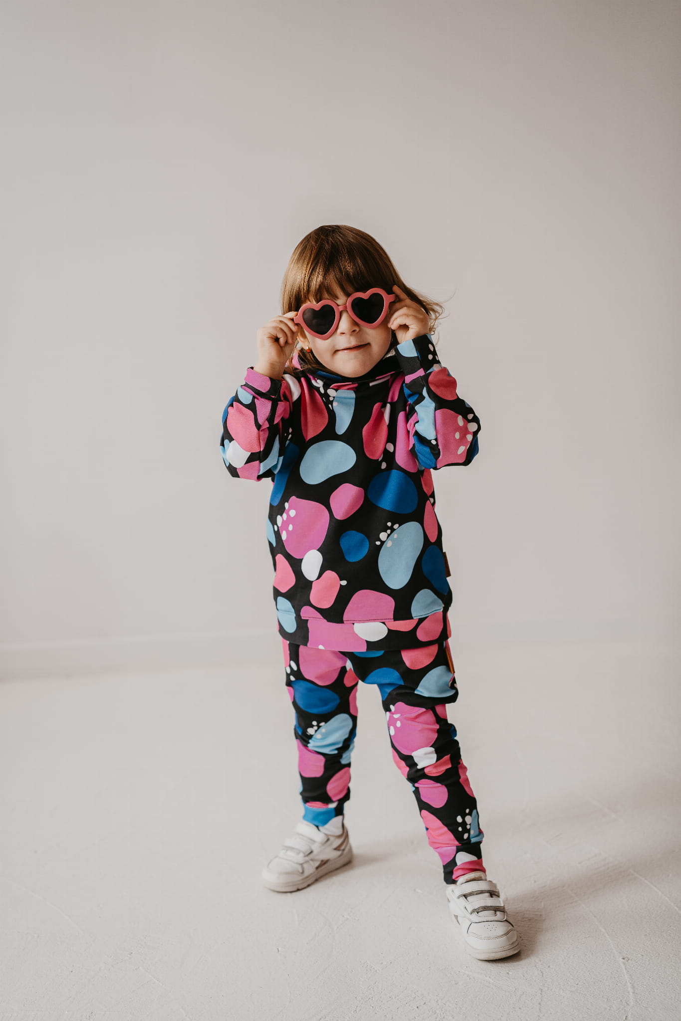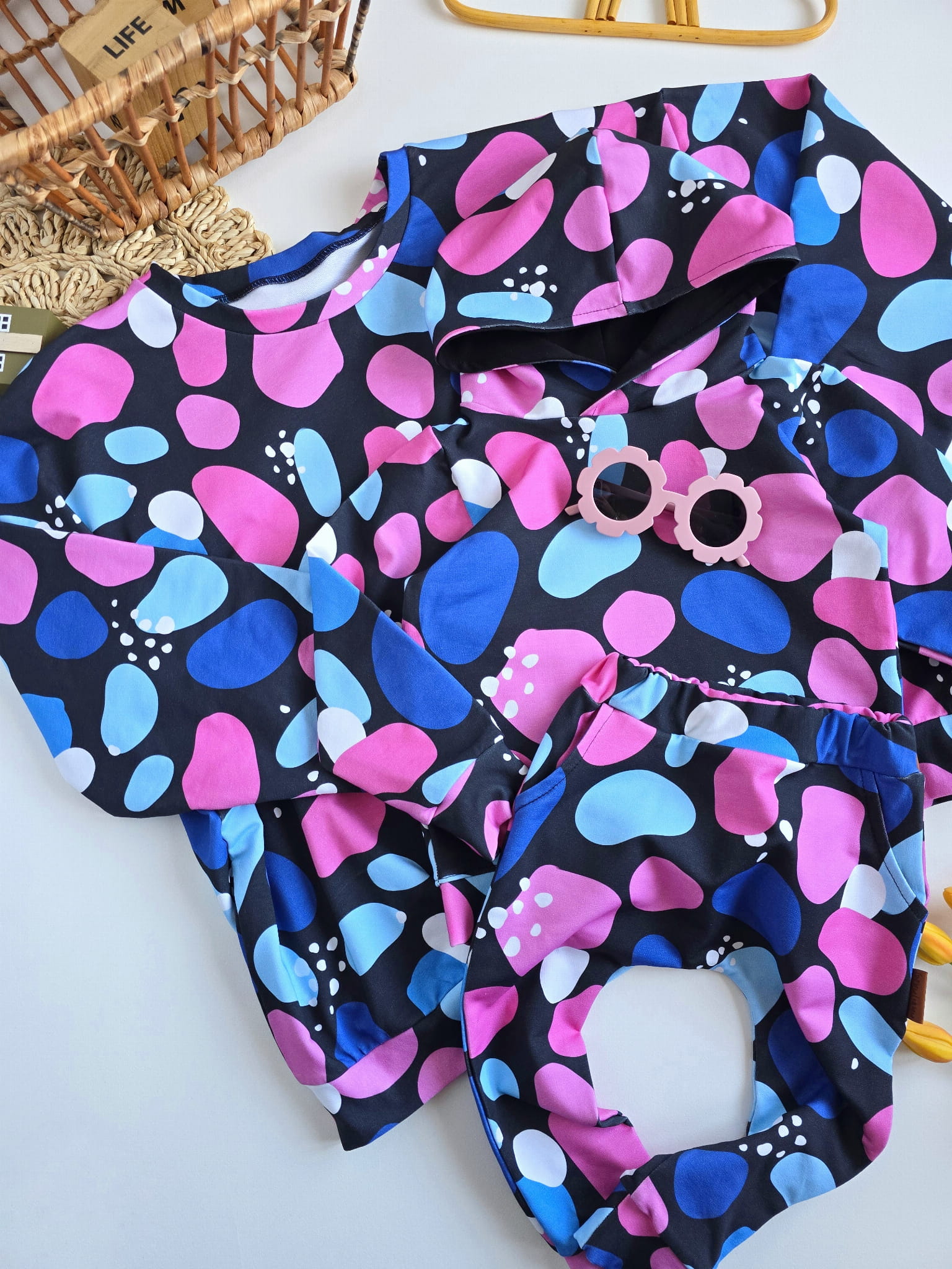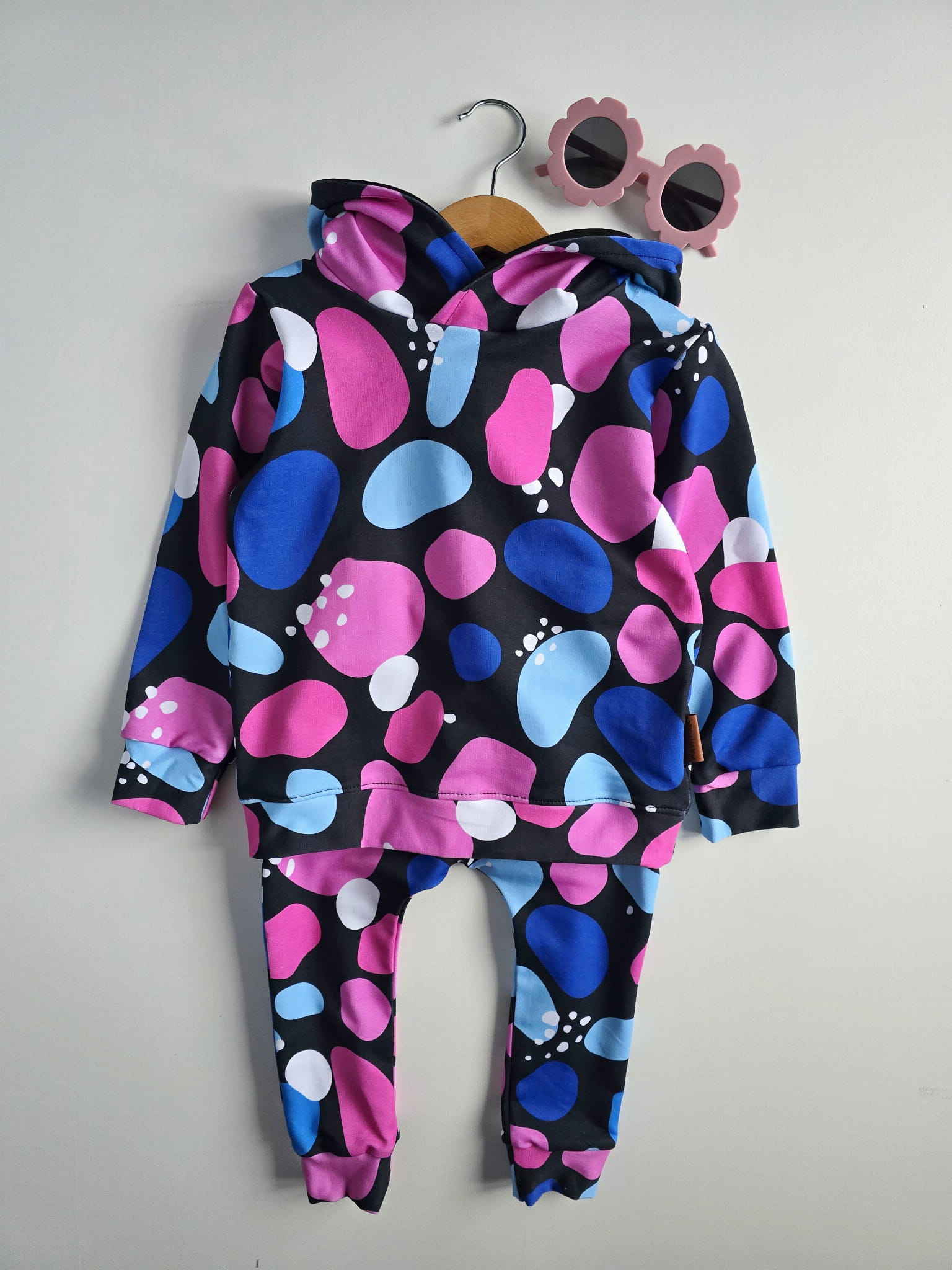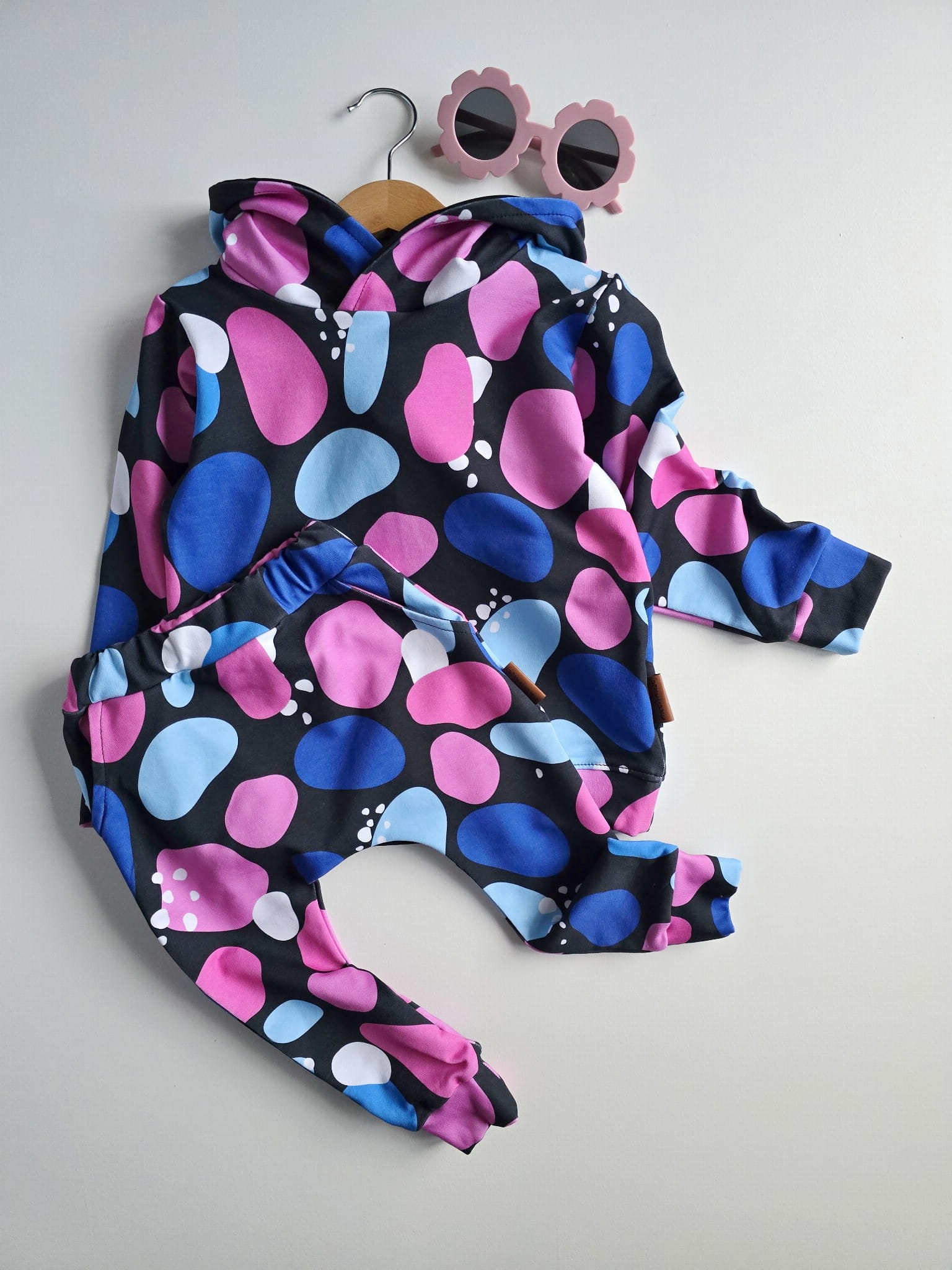 Wyjątkowy komplet "Kamyki" to połączenie wygody i oryginalnego stylu – idealny dla dzieci, które uwielbiają wyróżniać się podczas codziennych zabaw. Wzór pełen kolorowych kamieni w różu, niebieskim i bieli na czarnym tle nadaje każdej stylizacji nowoczesnego charakteru.