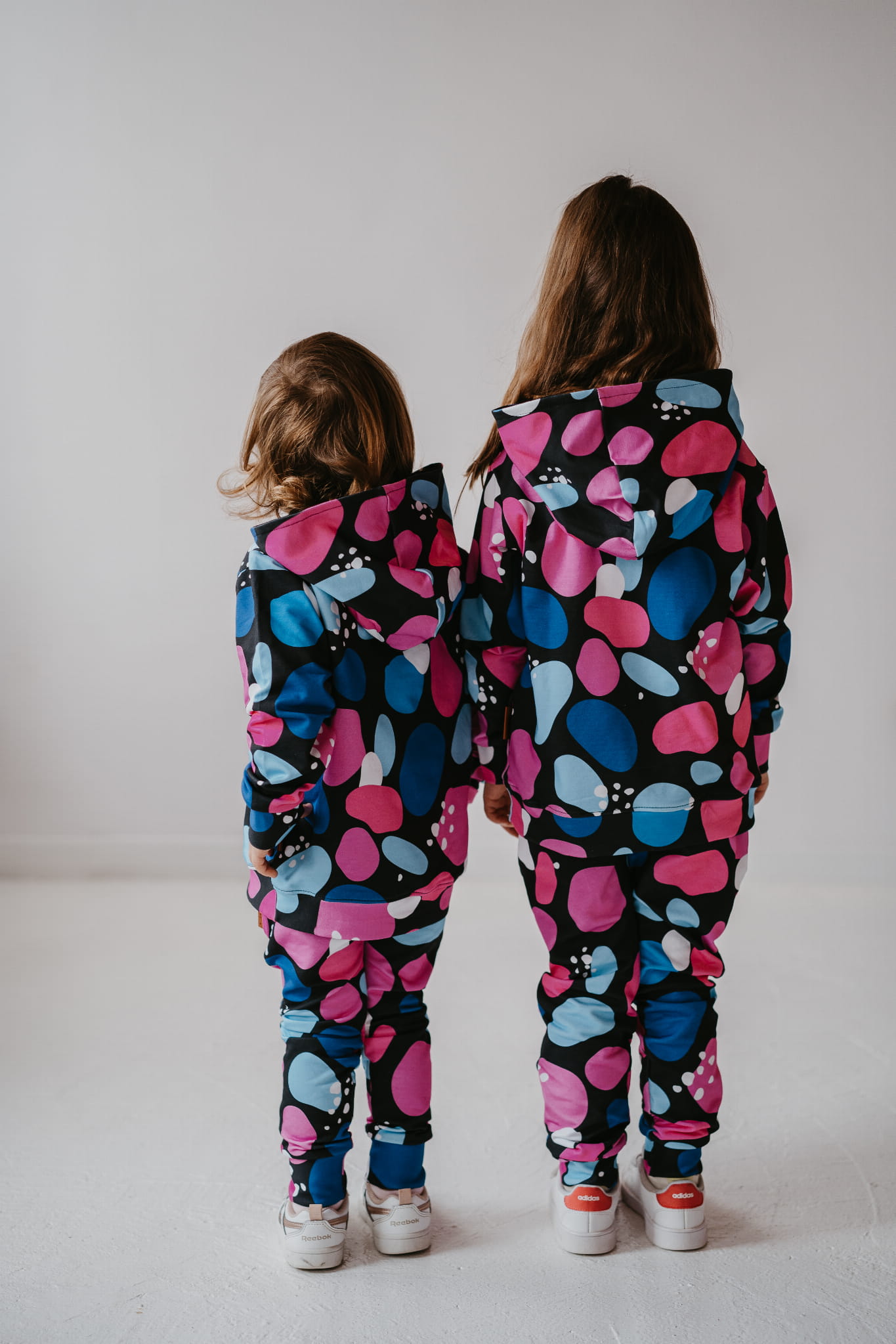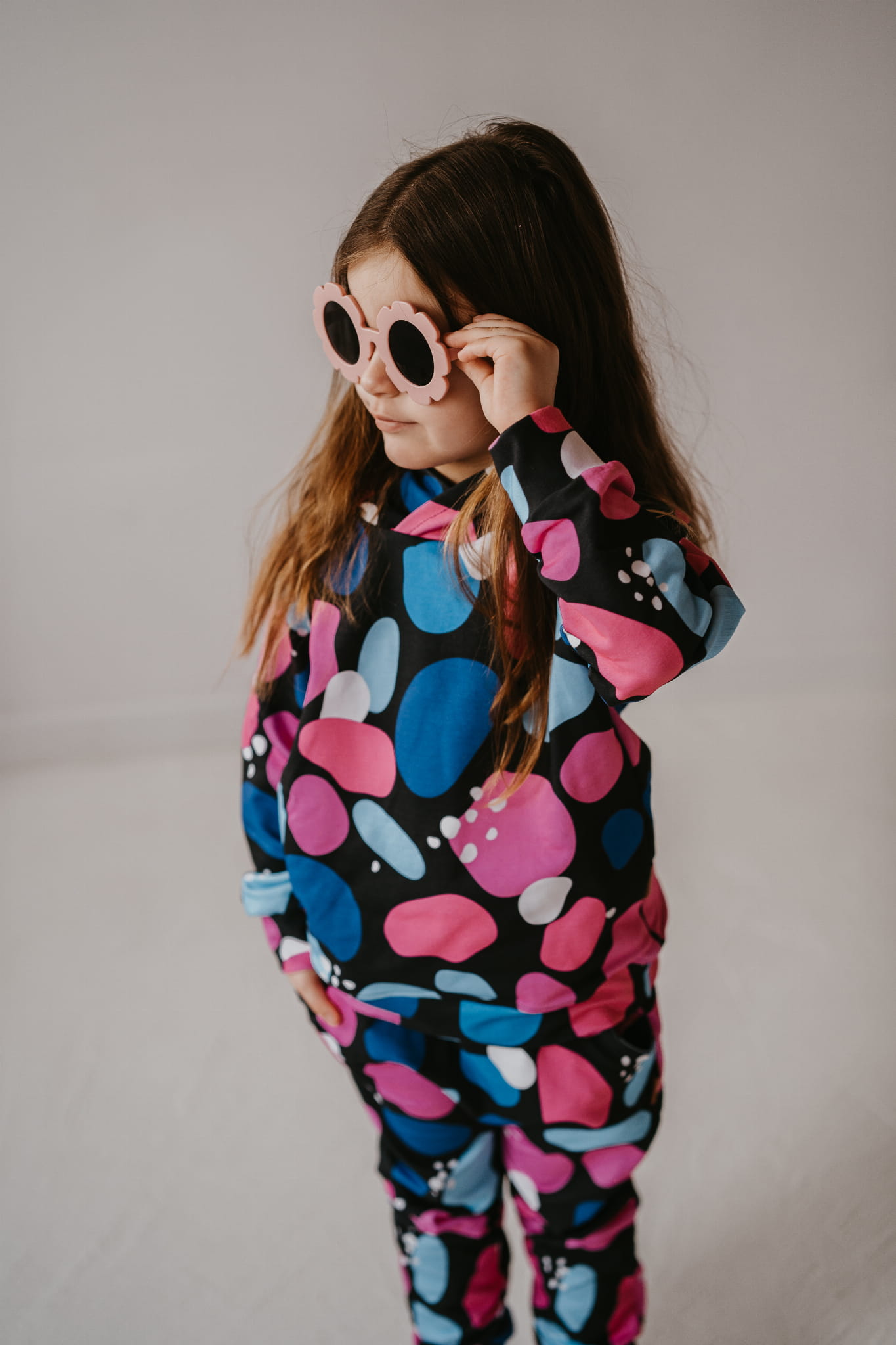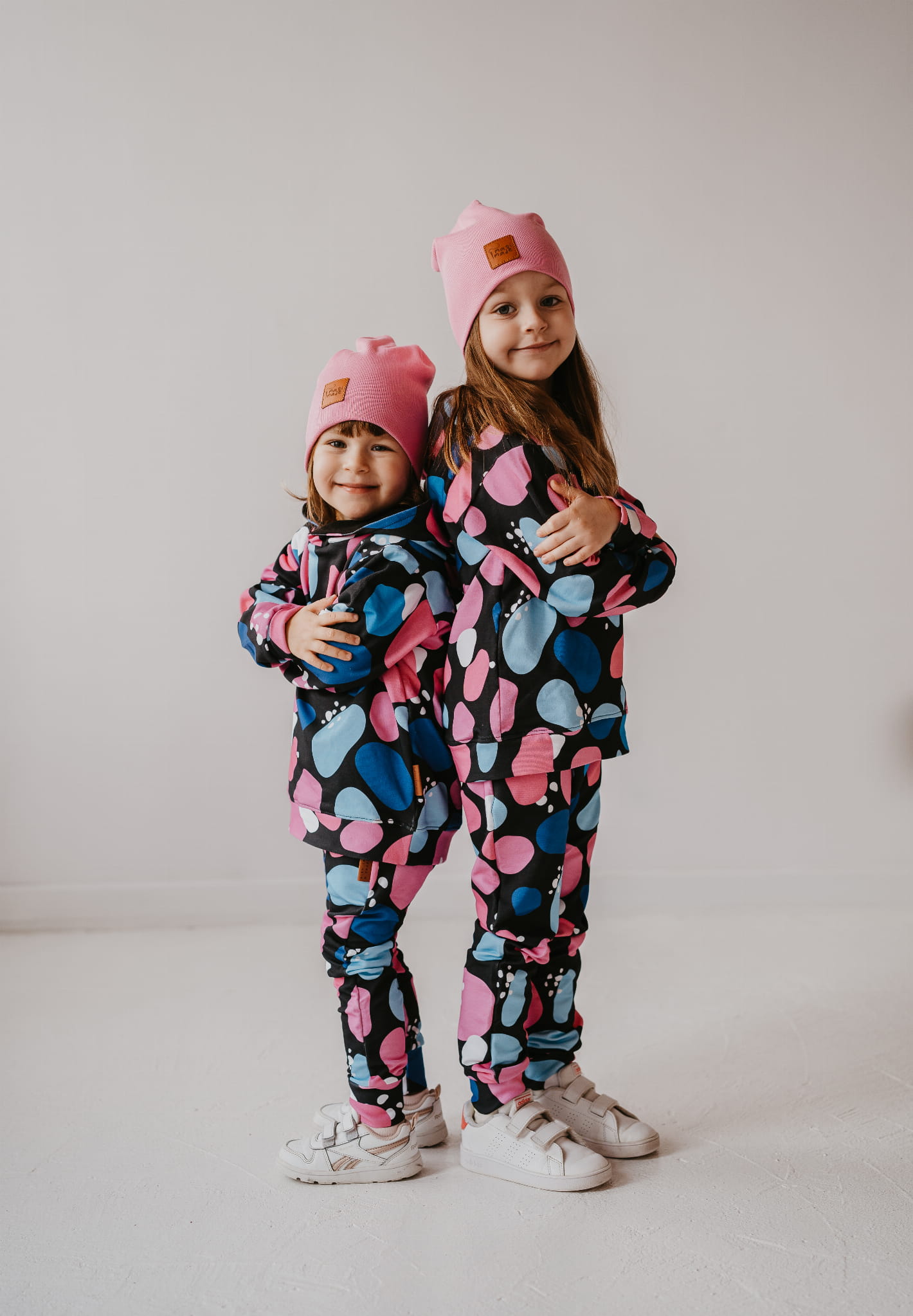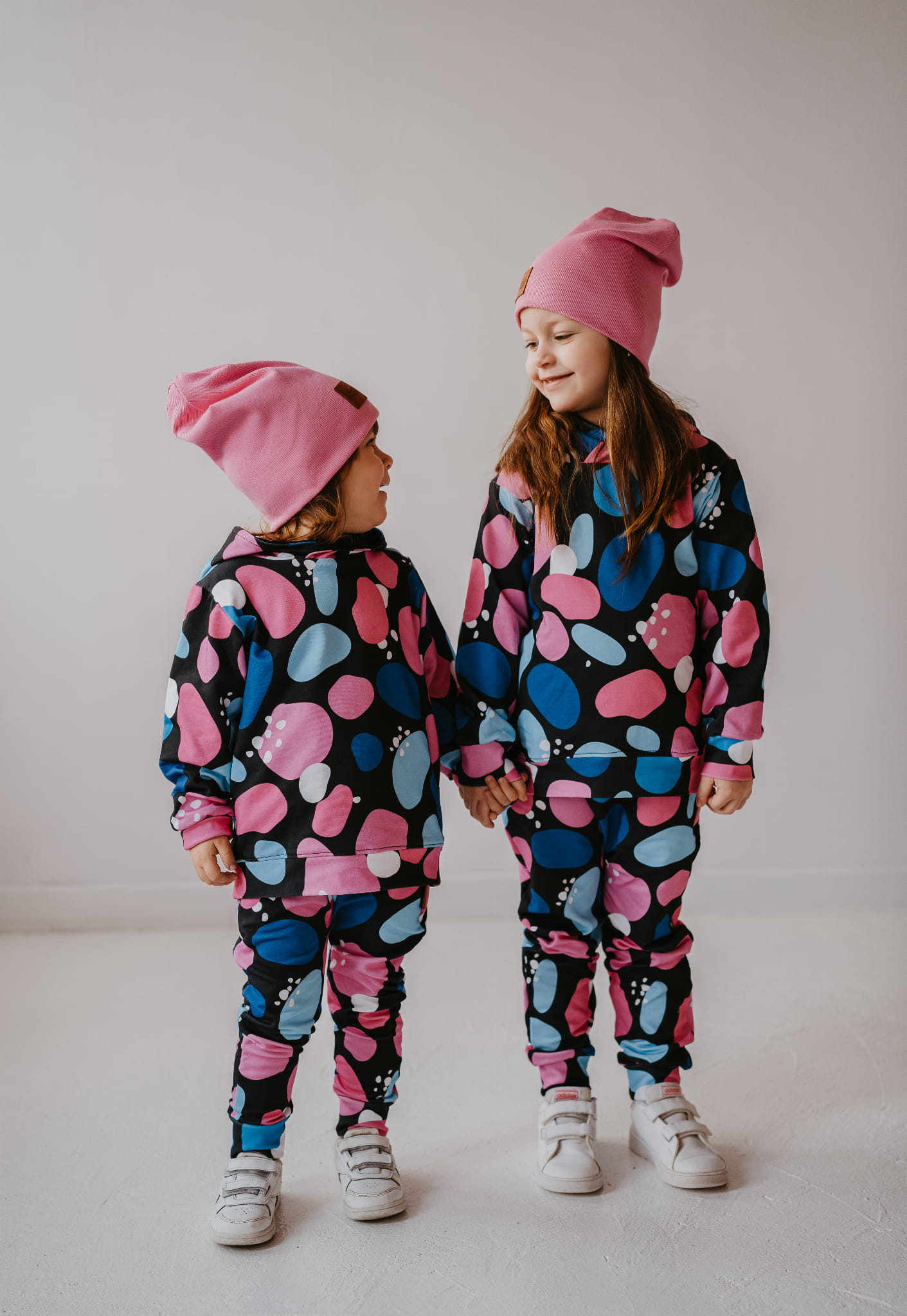 Wyjątkowy komplet "Kamyki" to połączenie wygody i oryginalnego stylu – idealny dla dzieci, które uwielbiają wyróżniać się podczas codziennych zabaw. Wzór pełen kolorowych kamieni w różu, niebieskim i bieli na czarnym tle nadaje każdej stylizacji nowoczesnego charakteru.