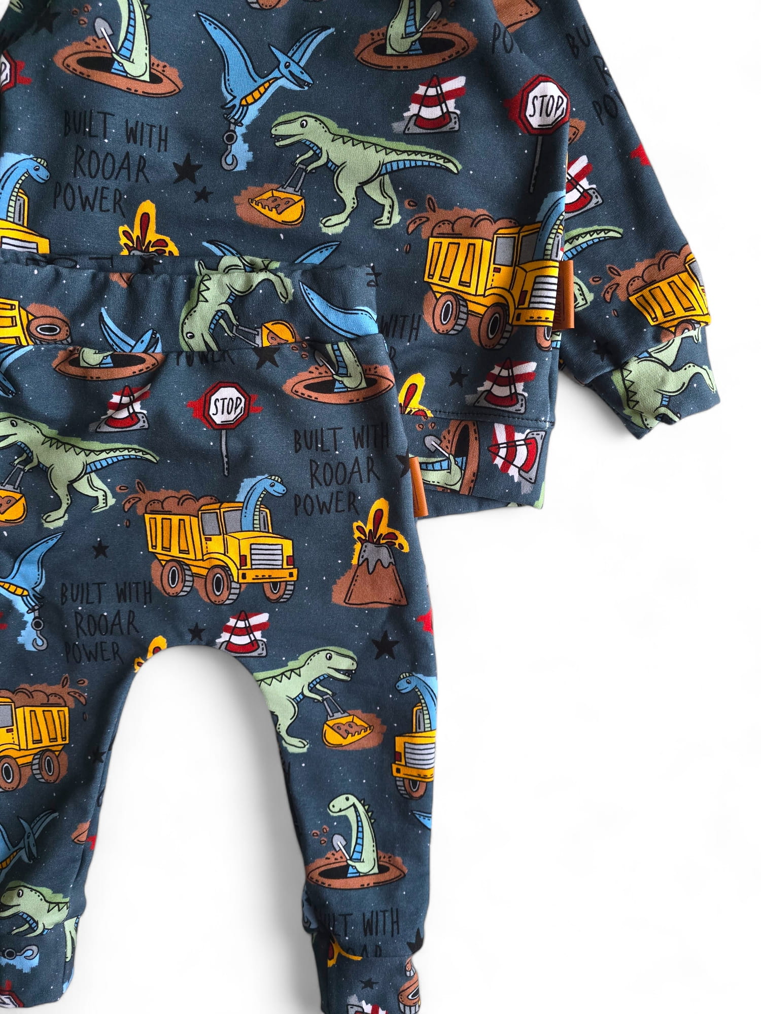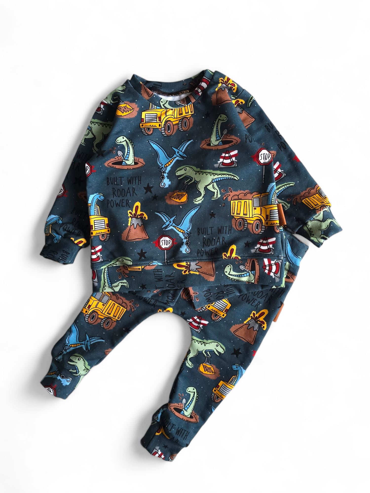 Oto coś wyjątkowego dla małych fanów dinozaurów i ciężkiego sprzętu! Komplet "Buldozaur" łączy w sobie dwa fascynujące światy: prehistoryczne dinozaury i maszyny budowlane. Bluza i spodnie w intensywnych kolorach, ozdobione grafikami przedstawiającymi dinozaury, buldożery, koparki oraz wulkany, to prawdziwy hit na każdą chłopięcą garderobę. Nadruk "Built with RROAR Power" dodaje energii i wyrazu, podkreślając moc i siłę tej stylizacji.