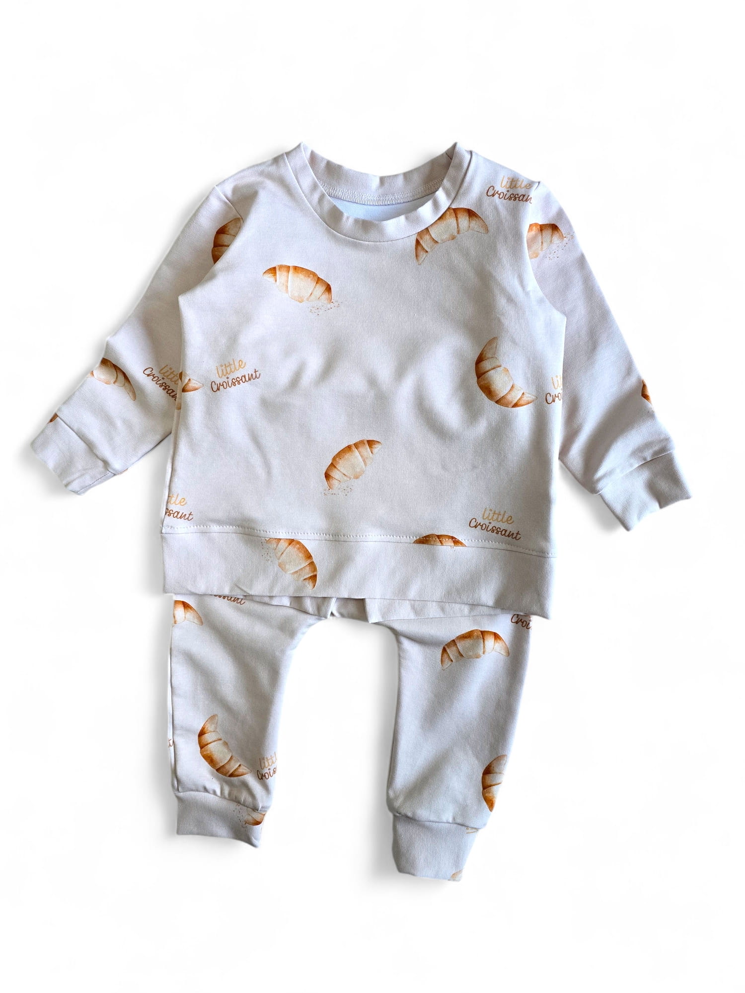 Przedstawiamy nasz wyjątkowy zestaw „Little Croissant”, który łączy w sobie urok i wygodę w jednym! Ten komplet, składający się z bluzy i spodni, został uszyty z najwyższej jakości dzianiny, która idealnie sprawdzi się na co dzień. Materiał, z którego wykonaliśmy ten uroczy zestaw, to połączenie 92% bawełny i 8% elastanu, co zapewnia miękkość, elastyczność oraz komfort noszenia. Całość ozdobiona jest subtelnym, ale wyjątkowo apetycznym wzorem z rogalikami, zaprojektowanym przez polskiego grafika specjalnie dla naszej marki.