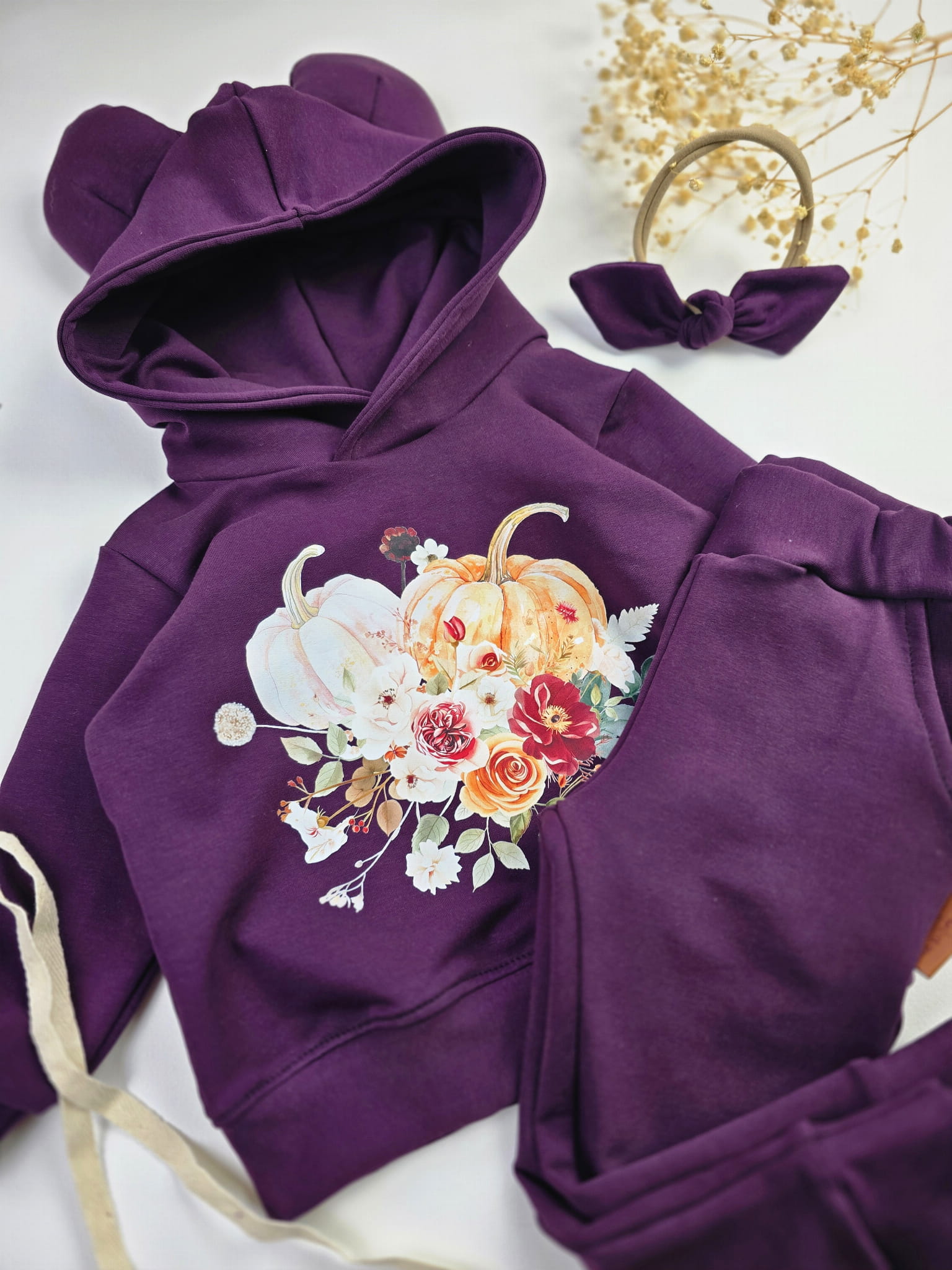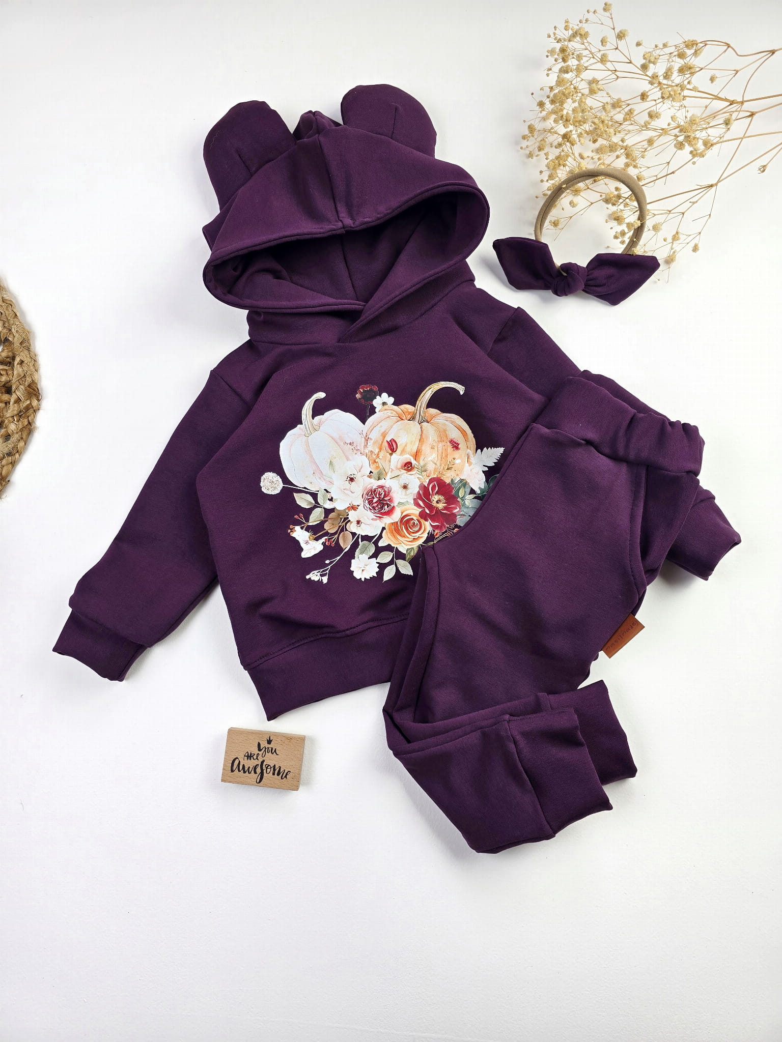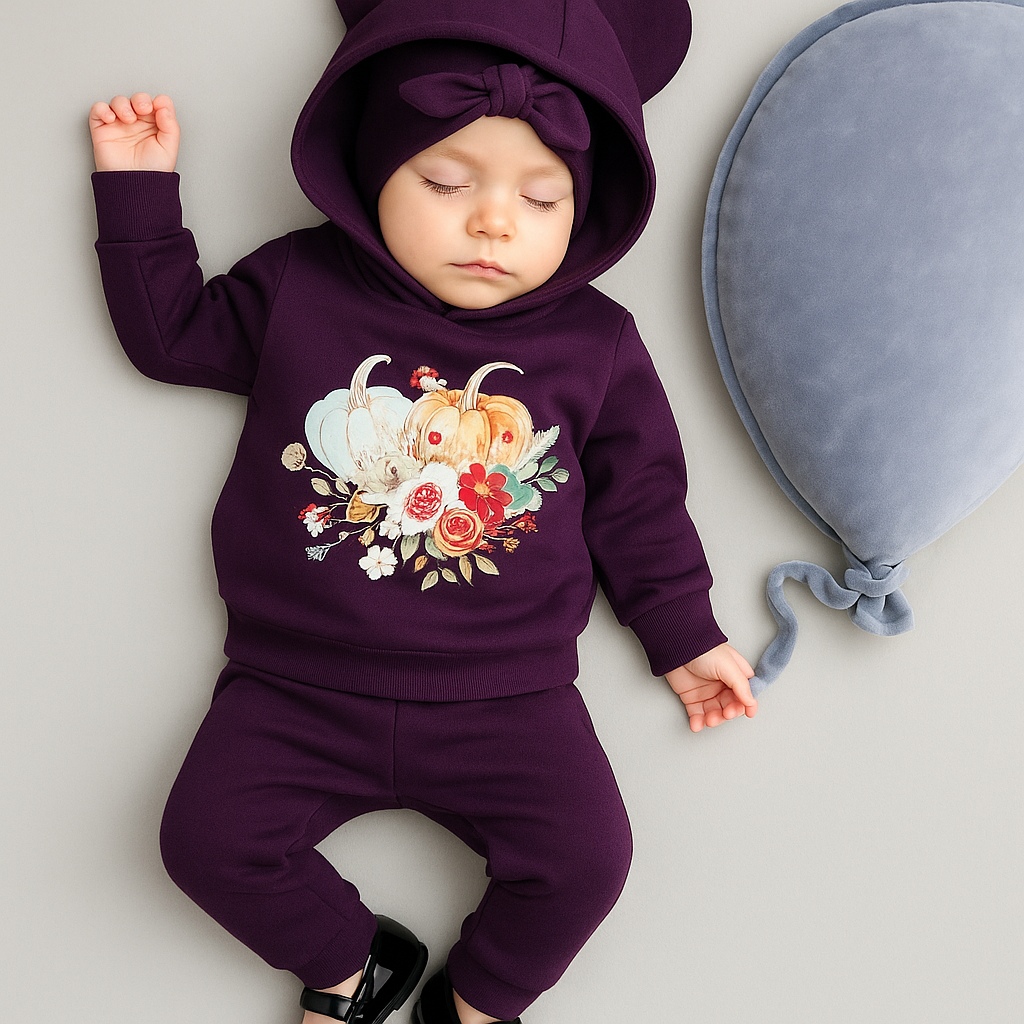 Komplet „Jesienne Dynie” to połączenie wygody i oryginalnego designu, które pokochają zarówno dzieci, jak i rodzice. Uszka na kapturze dodają uroku, a nadruk z dyniami i jesiennymi kwiatami sprawia, że ten zestaw idealnie wpisuje się w jesienny klimat. To doskonały wybór na co dzień, do przedszkola, szkoły, a także na rodzinne wyjścia czy sesje zdjęciowe.
