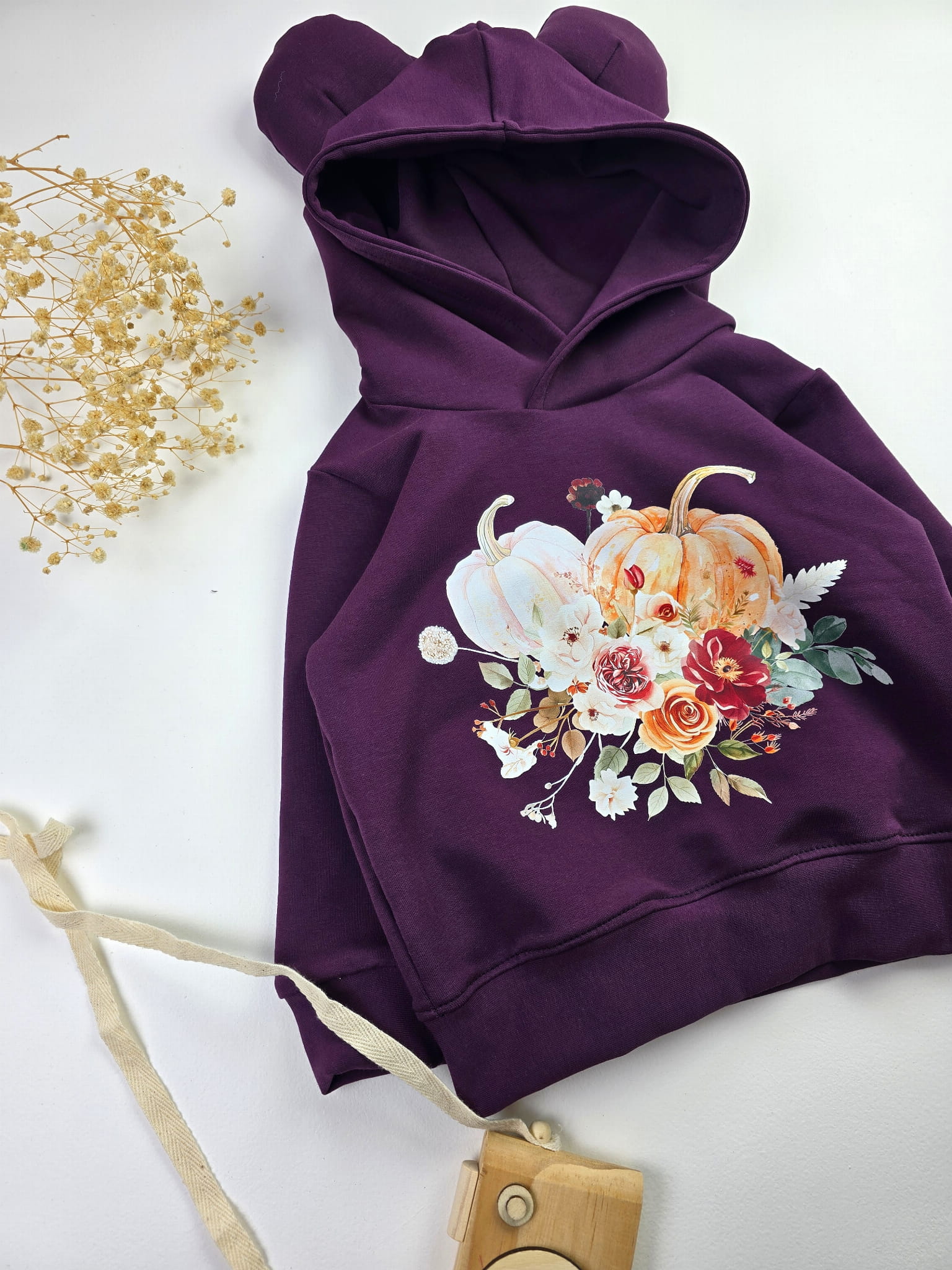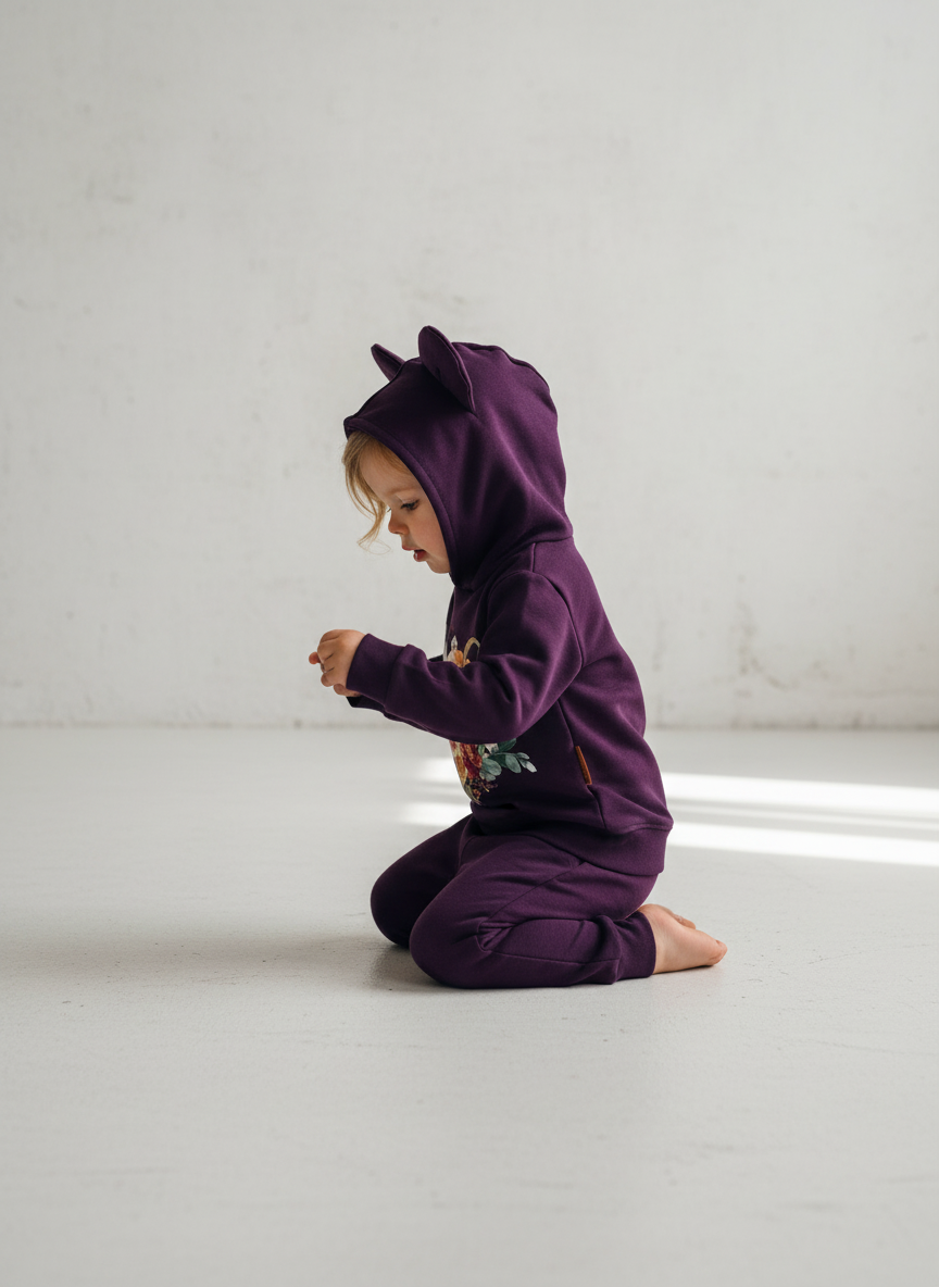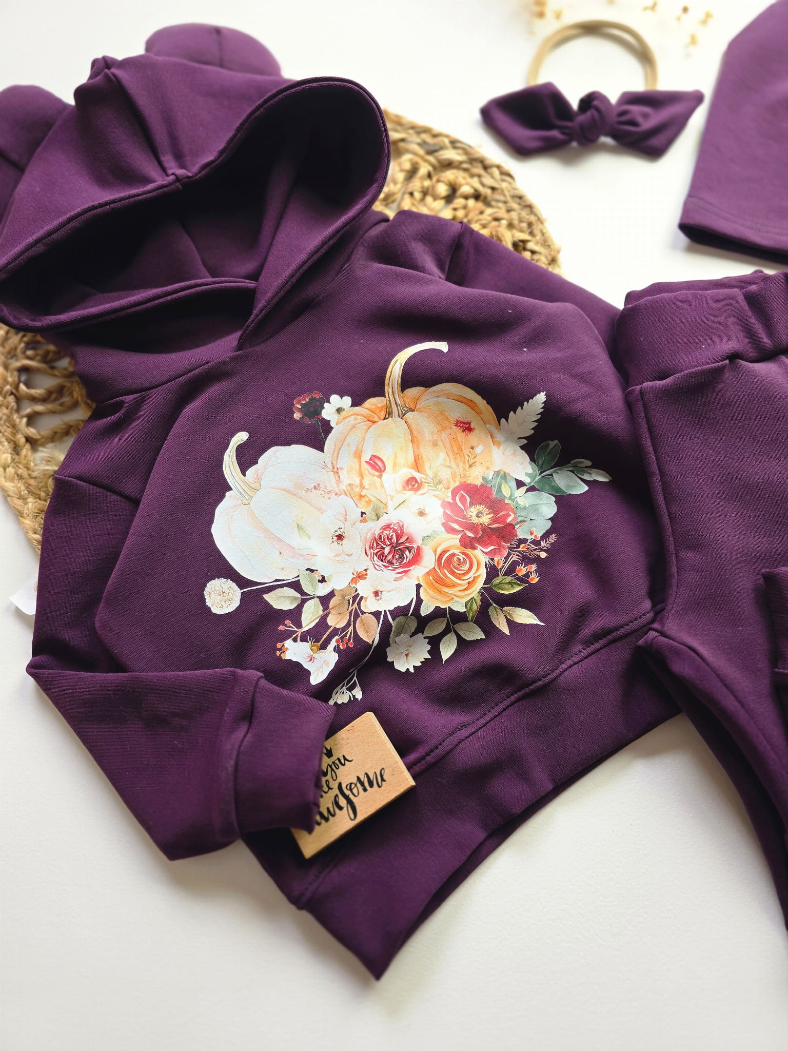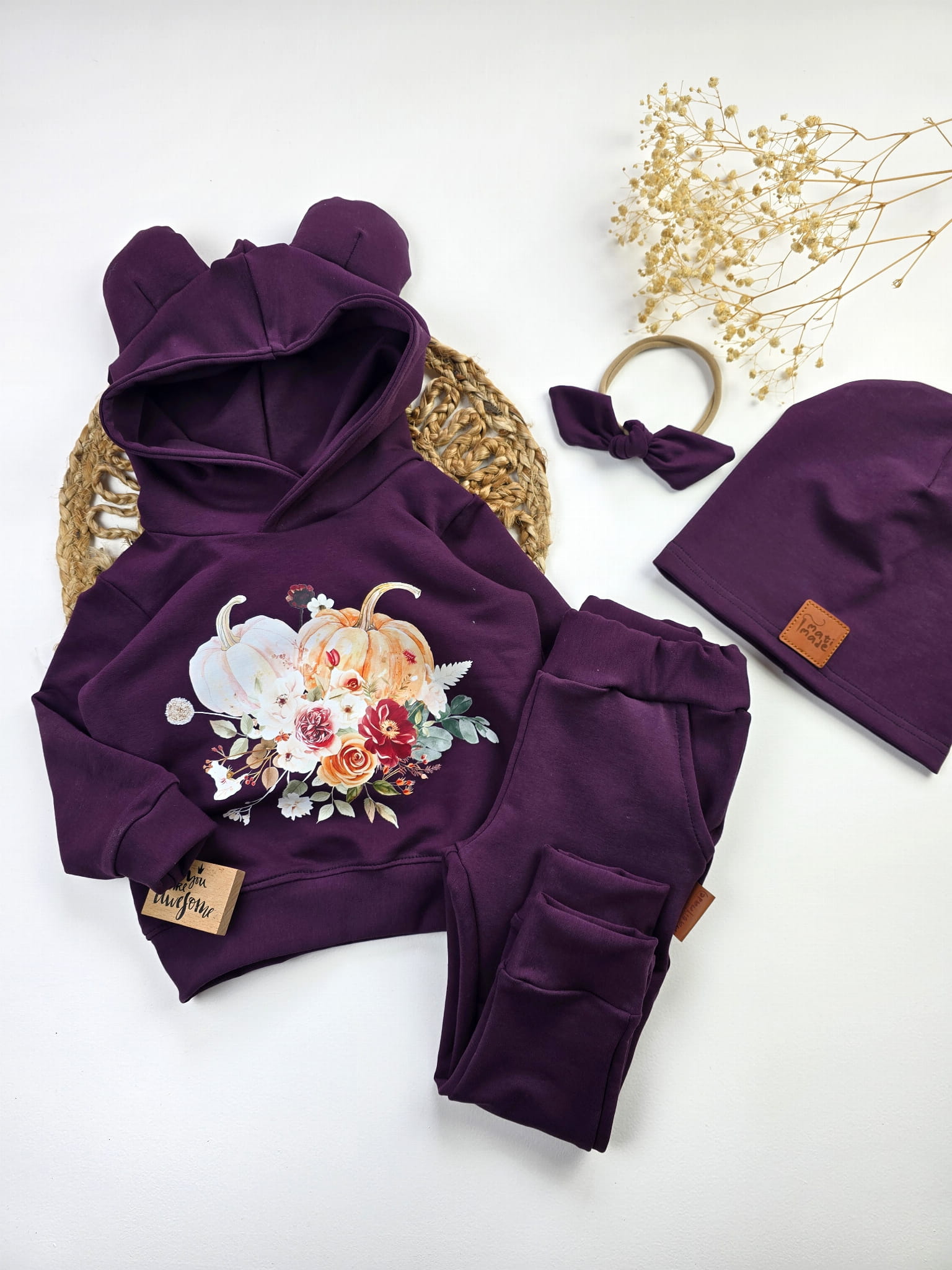 Komplet „Jesienne Dynie” to połączenie wygody i oryginalnego designu, które pokochają zarówno dzieci, jak i rodzice. Uszka na kapturze dodają uroku, a nadruk z dyniami i jesiennymi kwiatami sprawia, że ten zestaw idealnie wpisuje się w jesienny klimat. To doskonały wybór na co dzień, do przedszkola, szkoły, a także na rodzinne wyjścia czy sesje zdjęciowe.