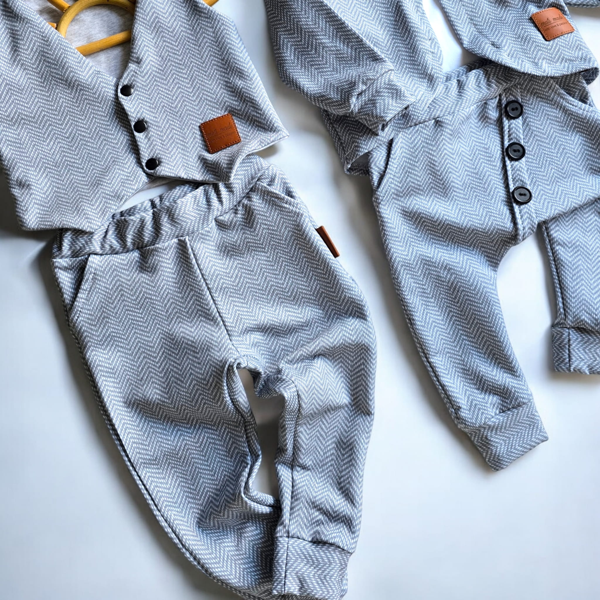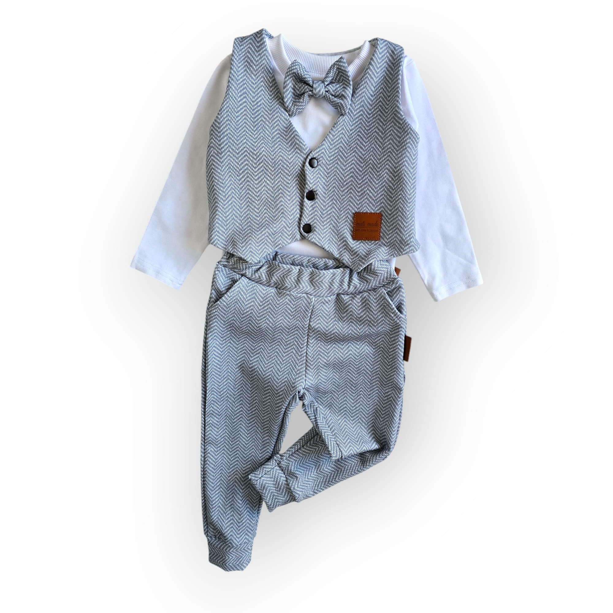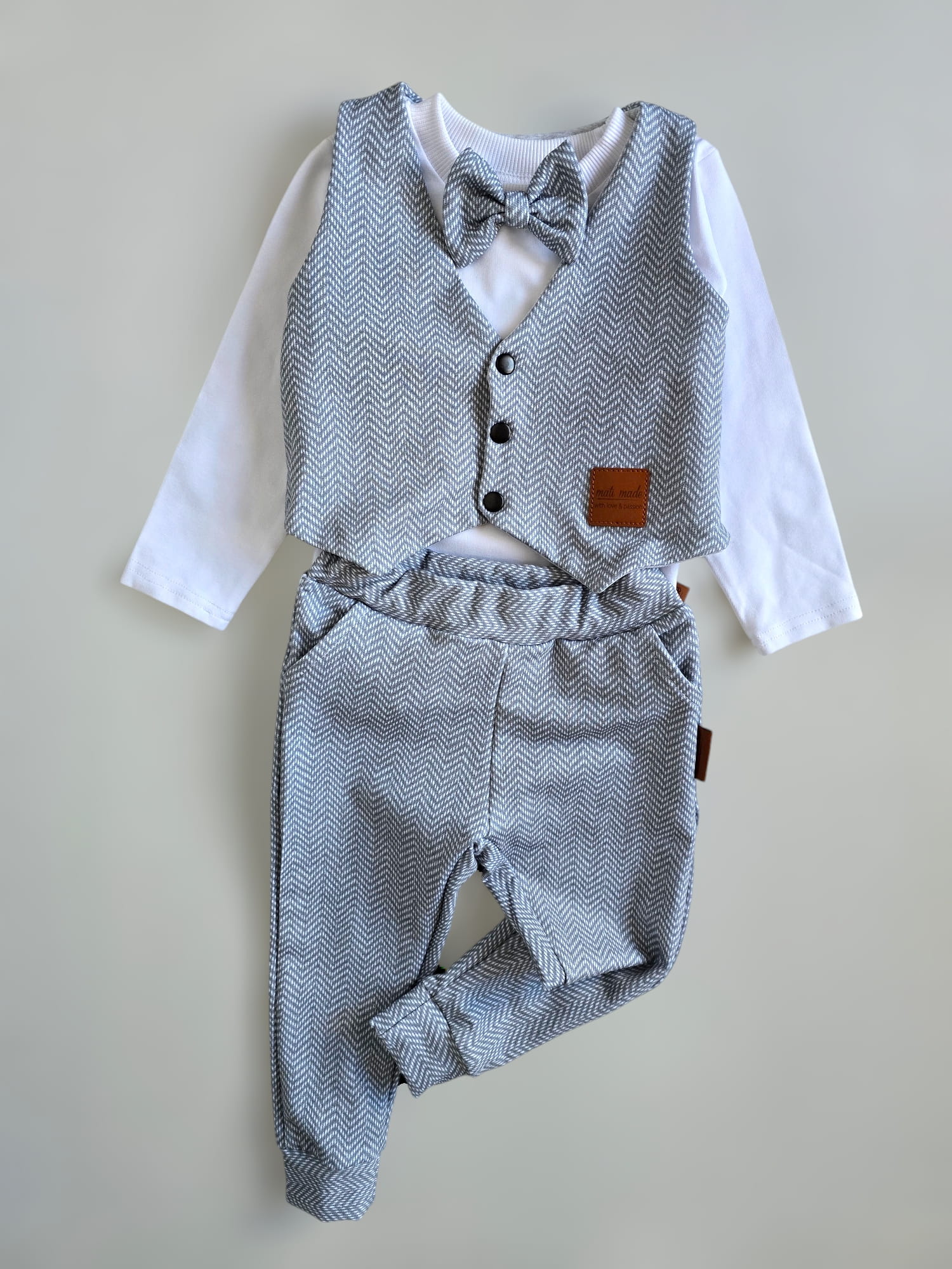 Elegancki komplet "Antek" to idealna stylizacja dla chłopca na ważne uroczystości, takie jak chrzest, roczek, wesele, czy ślub. Zestaw wyróżnia się klasycznym wzorem w jodełkę, który nadaje całości eleganckiego i ponadczasowego charakteru. Wykonany z najwyższej jakości materiałów, zapewnia pełen komfort noszenia i swobodę ruchów.