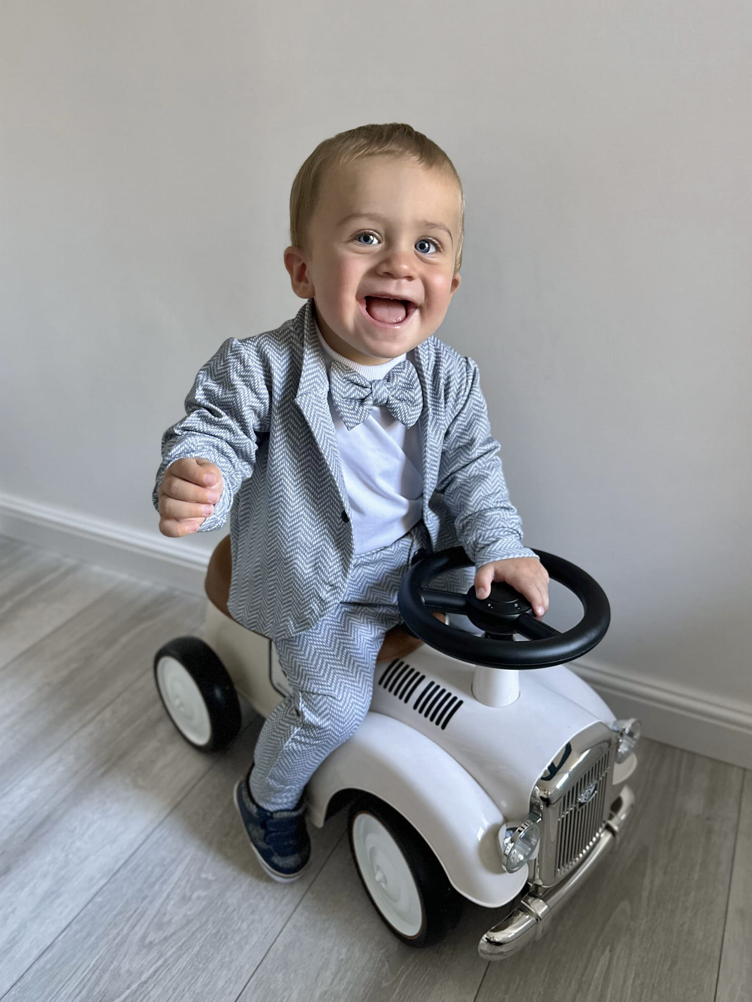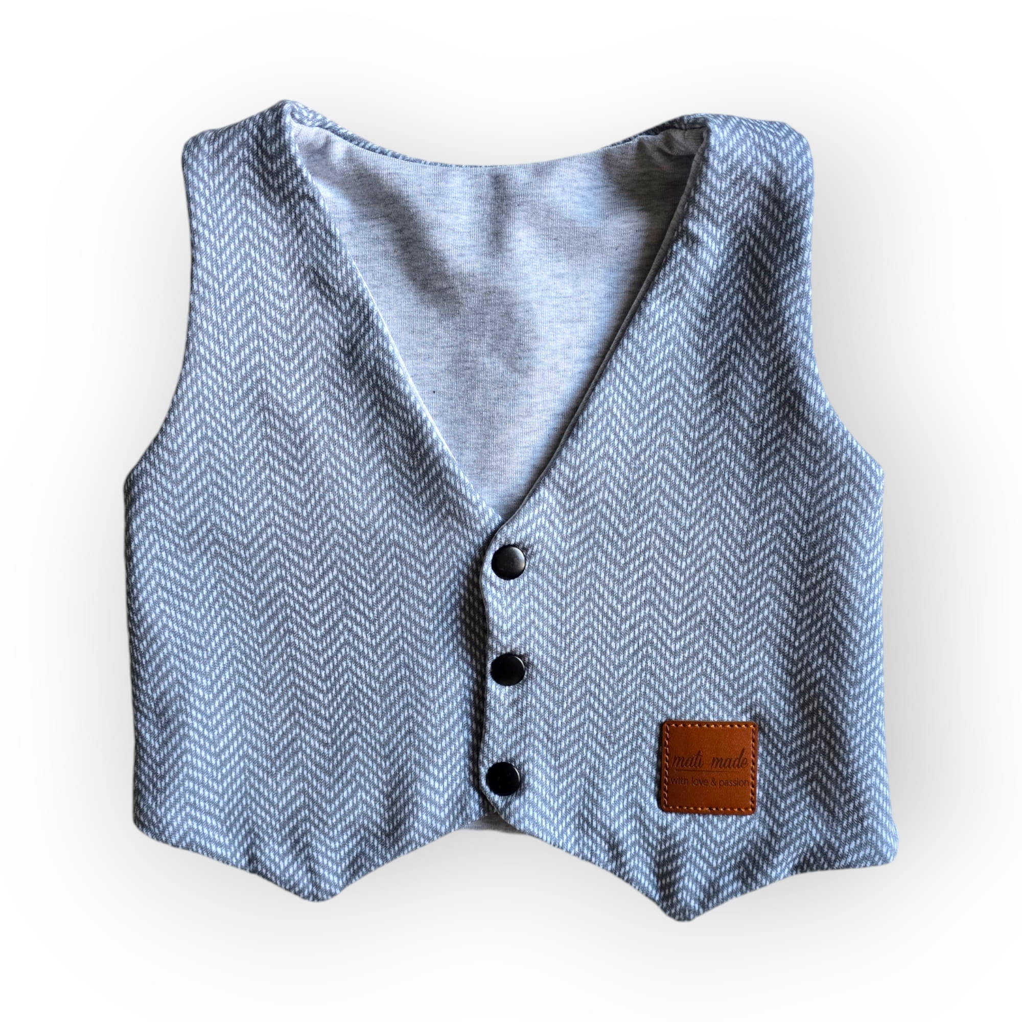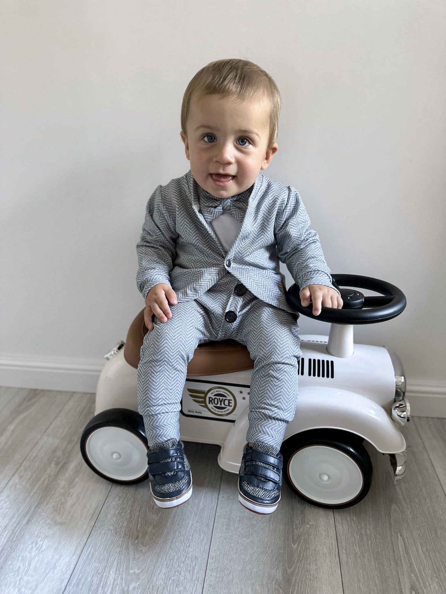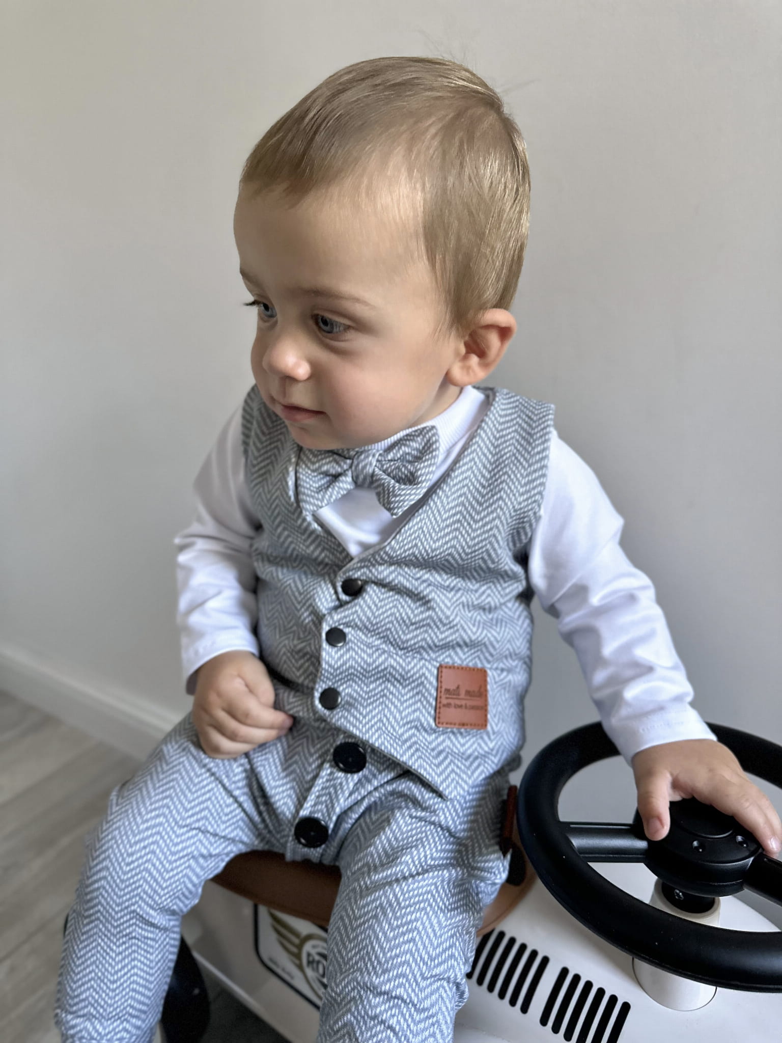 Elegancki komplet "Antek" to idealna stylizacja dla chłopca na ważne uroczystości, takie jak chrzest, roczek, wesele, czy ślub. Zestaw wyróżnia się klasycznym wzorem w jodełkę, który nadaje całości eleganckiego i ponadczasowego charakteru. Wykonany z najwyższej jakości materiałów, zapewnia pełen komfort noszenia i swobodę ruchów.