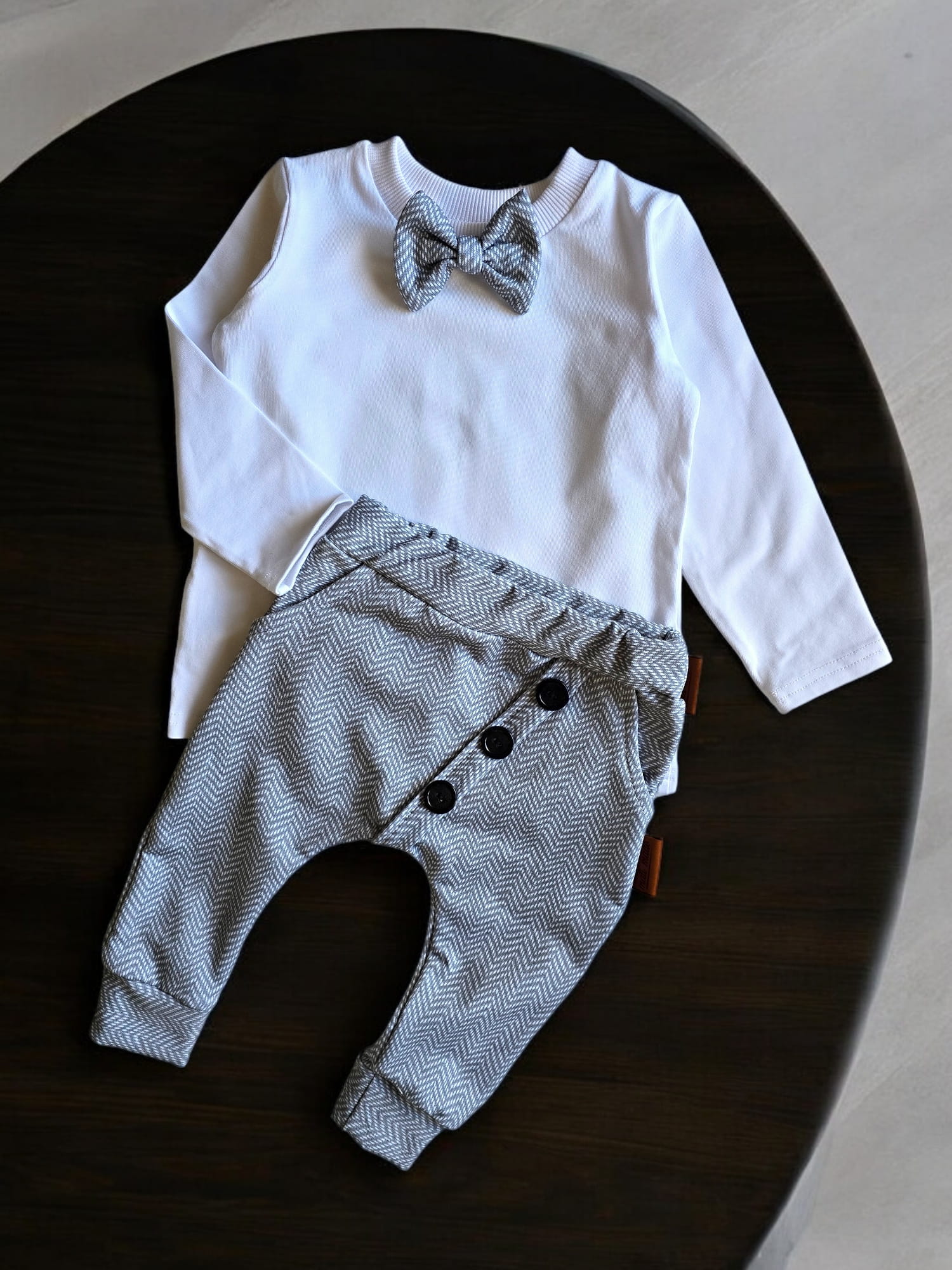 Komplet elegancki "Antek" – spodnie baggy i bluzka/body dla chłopca na chrzest, roczek, ślub (56-152)