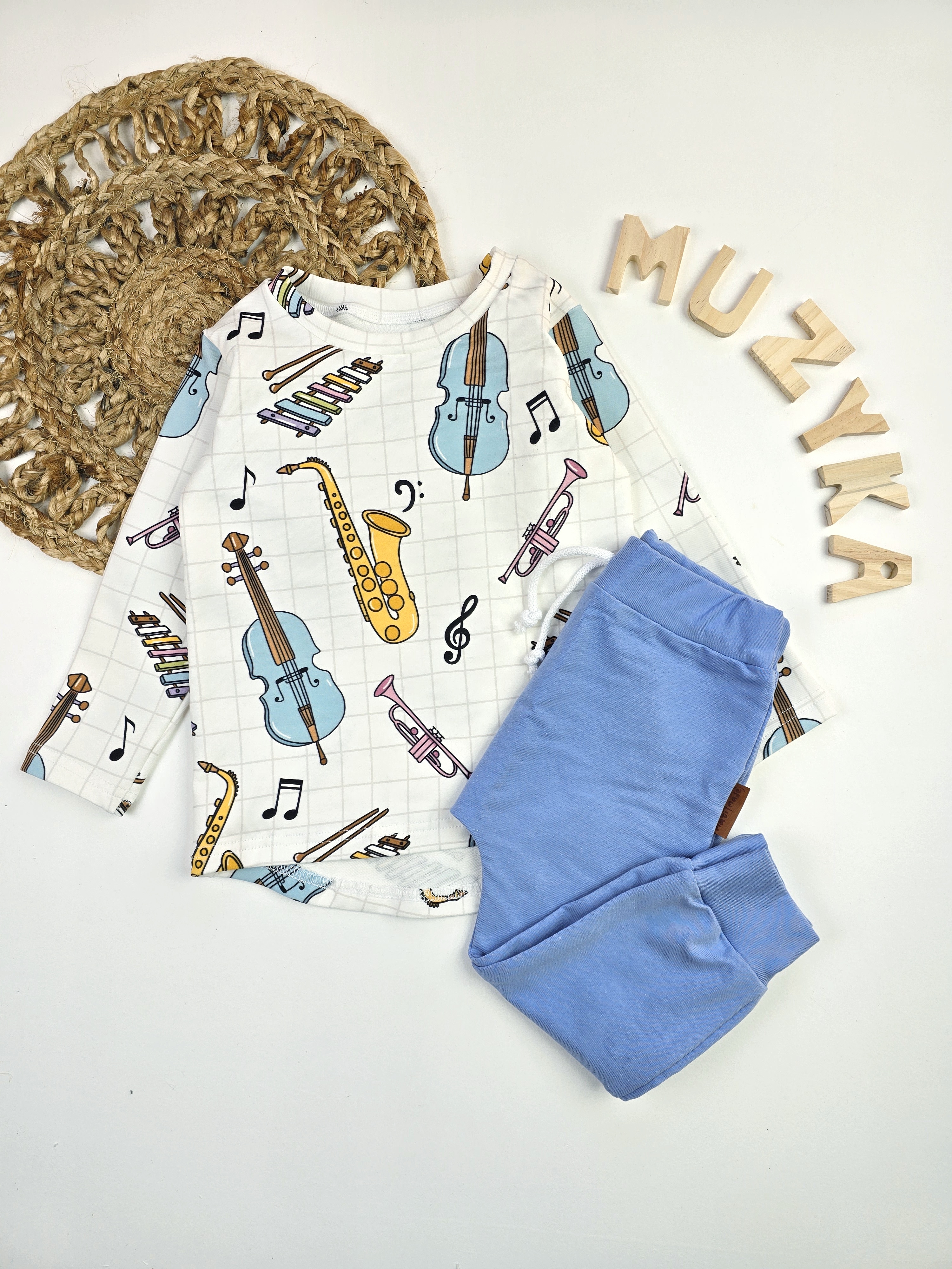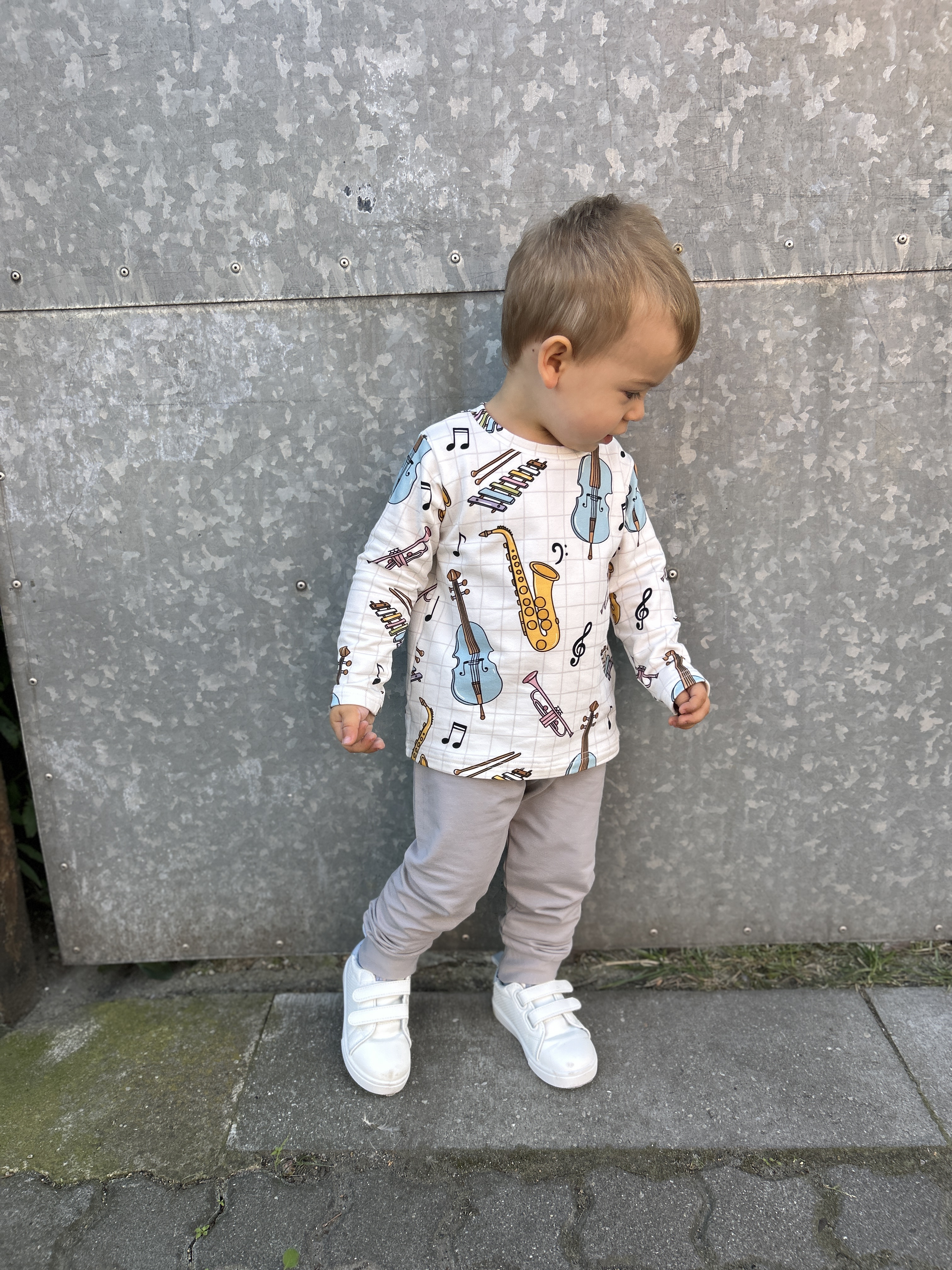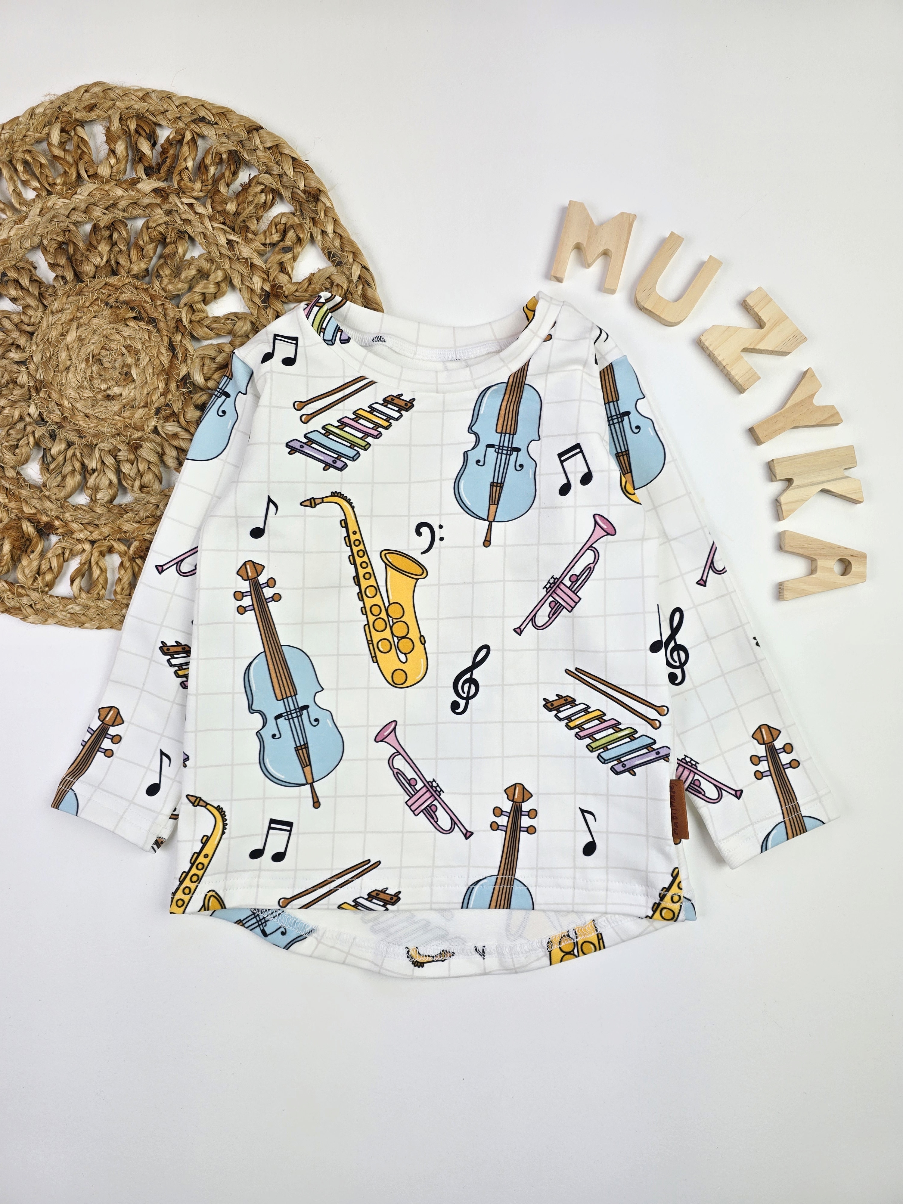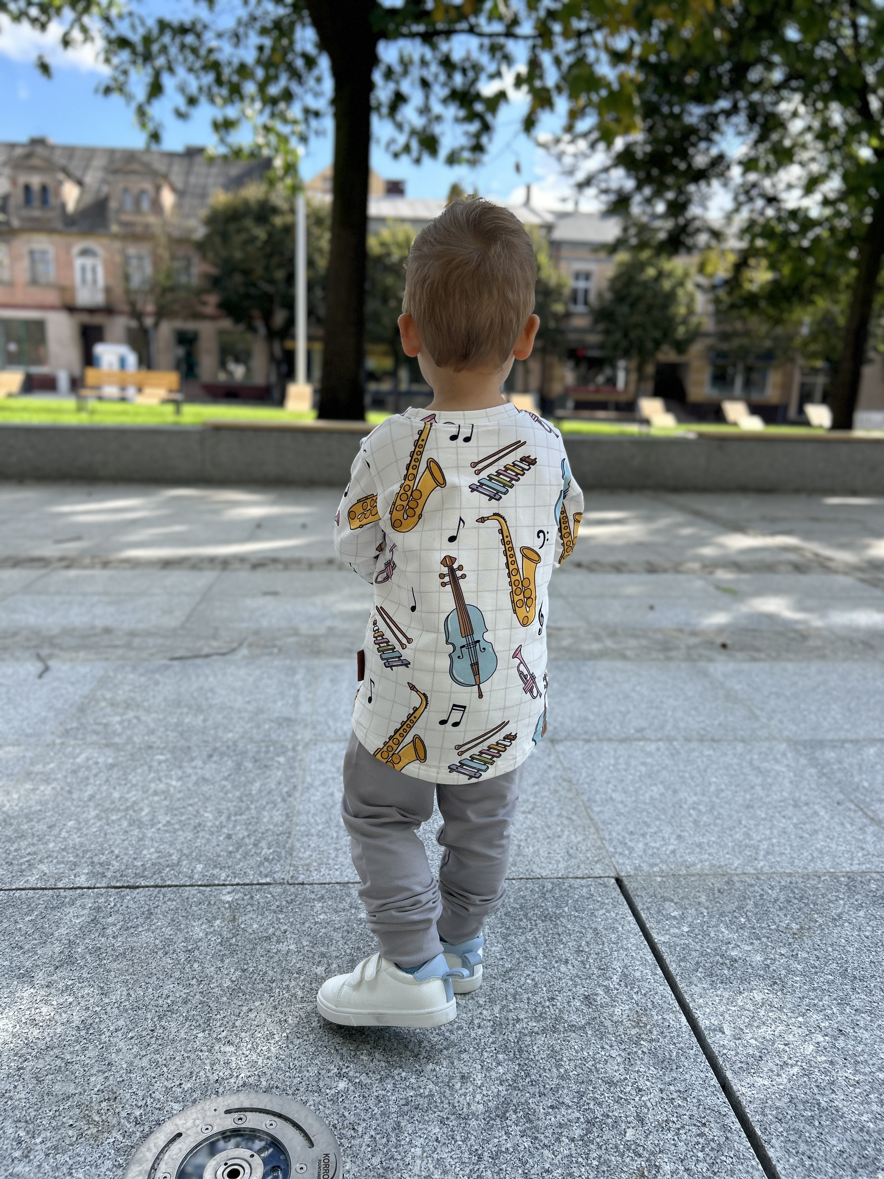 Muzyka to radość, energia i uśmiech – i właśnie taki jest nasz longsleeve z długim rękawem w muzyczny wzór. Kolorowe instrumenty – skrzypce, saksofony, trąbki czy nutki – zamieniają zwykłą bluzkę w małe dzieło sztuki, które pobudza wyobraźnię dziecka i sprawia, że każdy dzień staje się wyjątkowy.