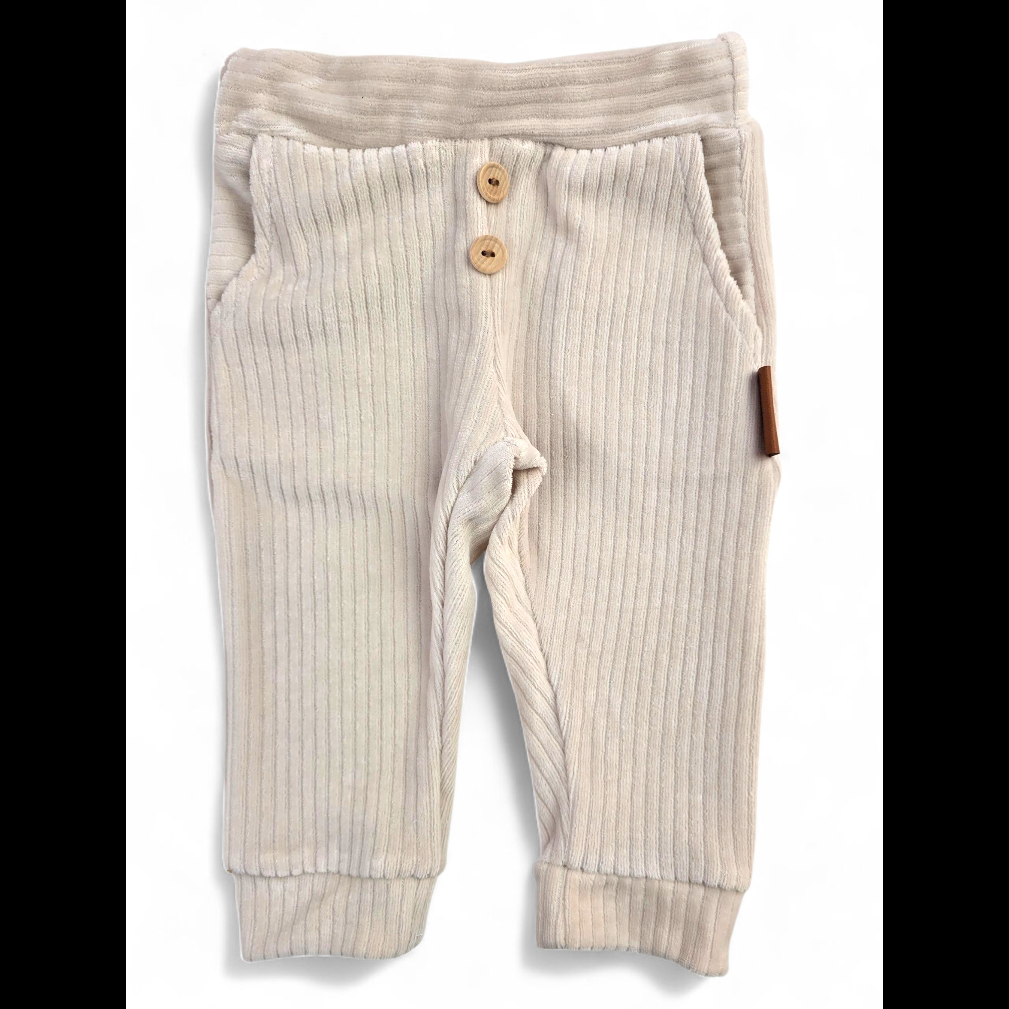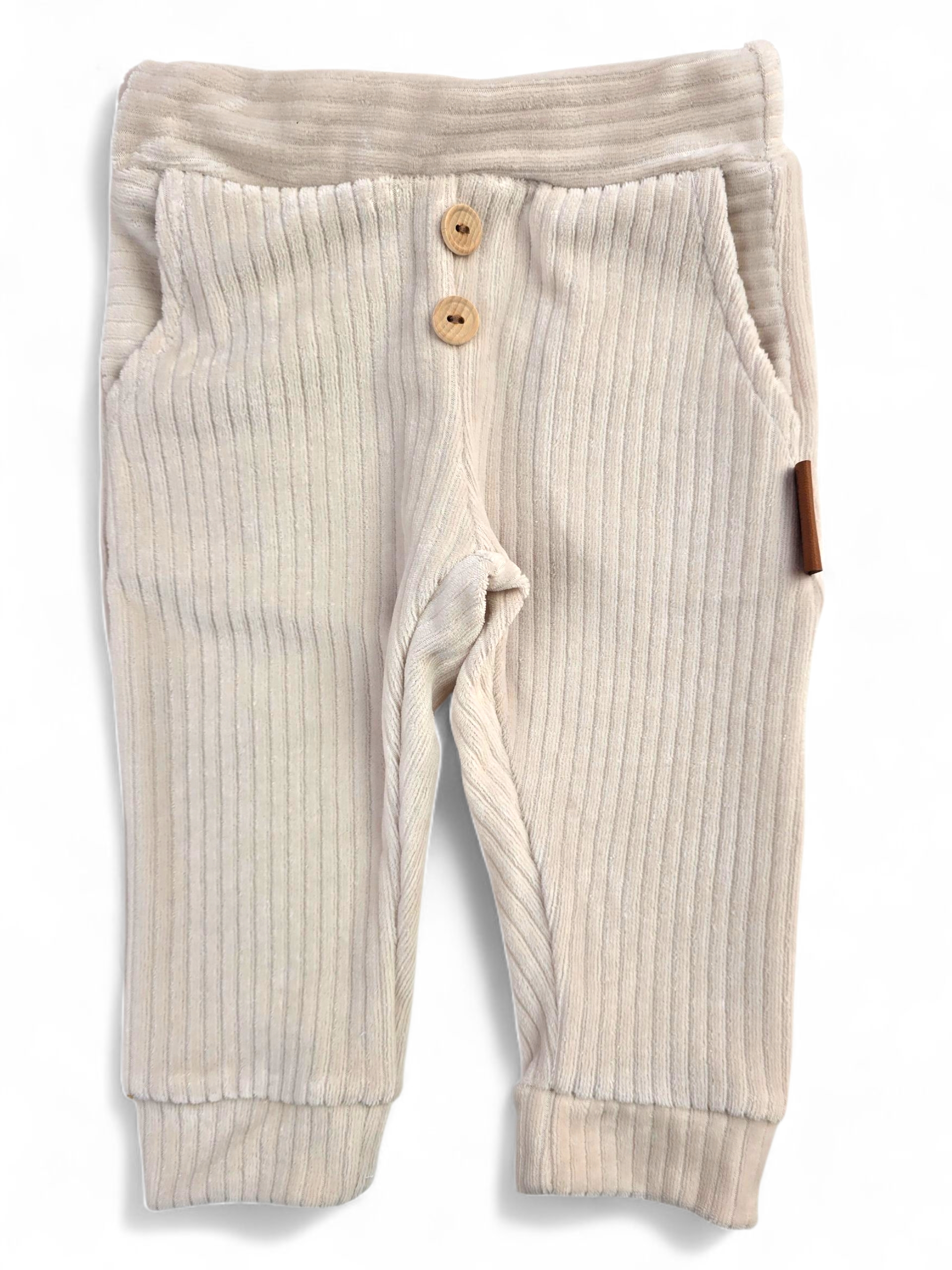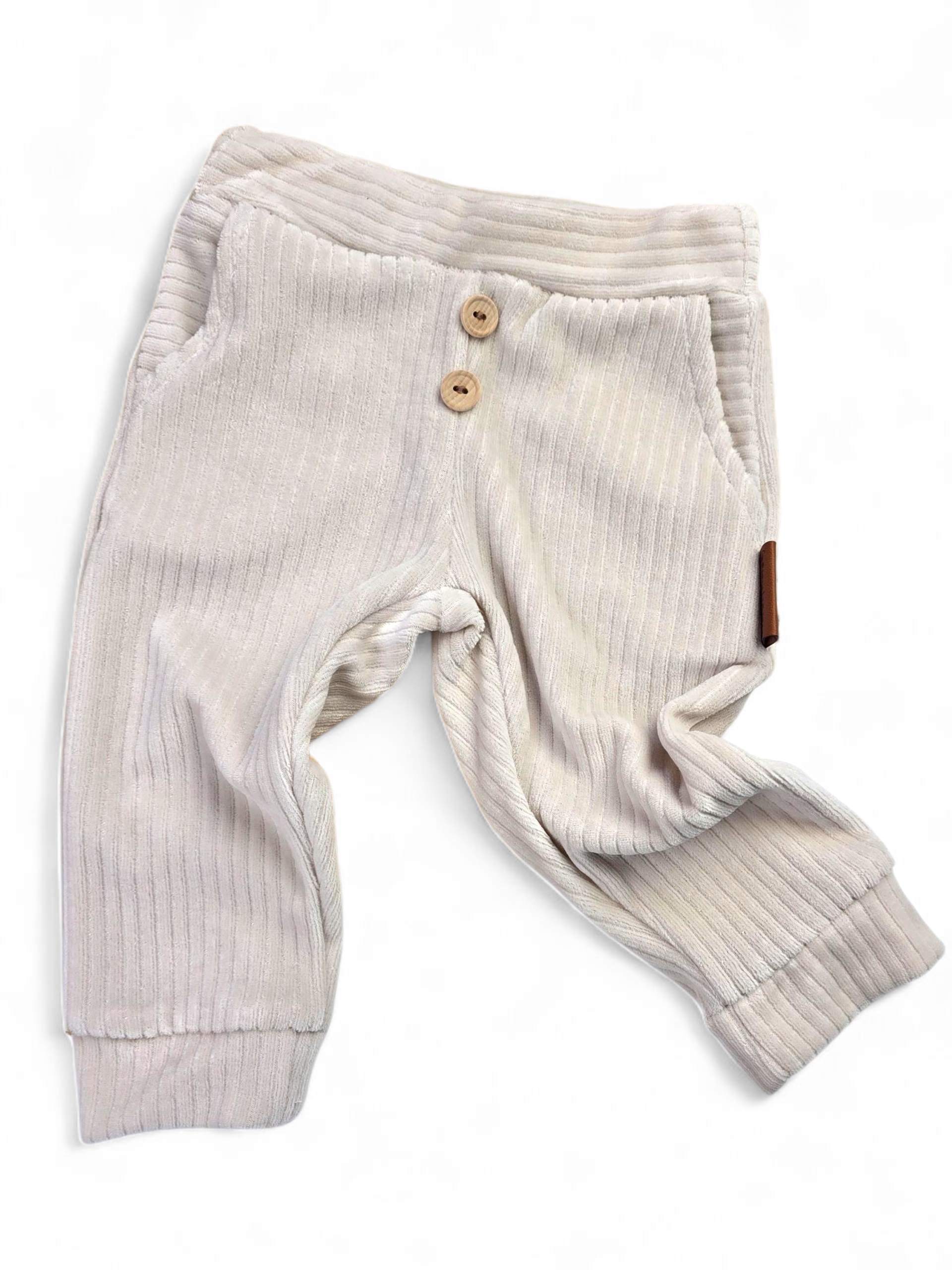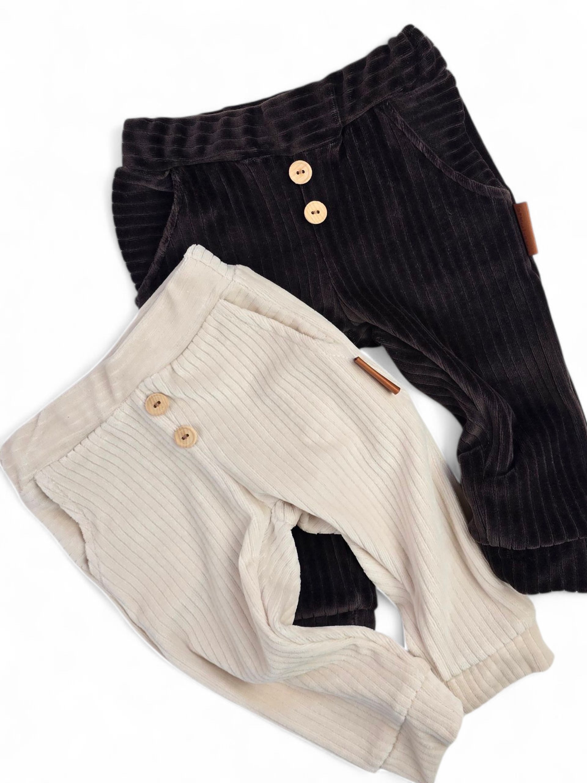 Spodnie uszyte są z wysokiej jakości dzianiny welurowej o prążkowanej strukturze, co nadaje im wyjątkowego uroku i eleganckiego charakteru. Elastyczny pas oraz miękki materiał gwarantują wygodę, a ozdobne drewniane guziczki z przodu dodają subtelnego, naturalnego akcentu.