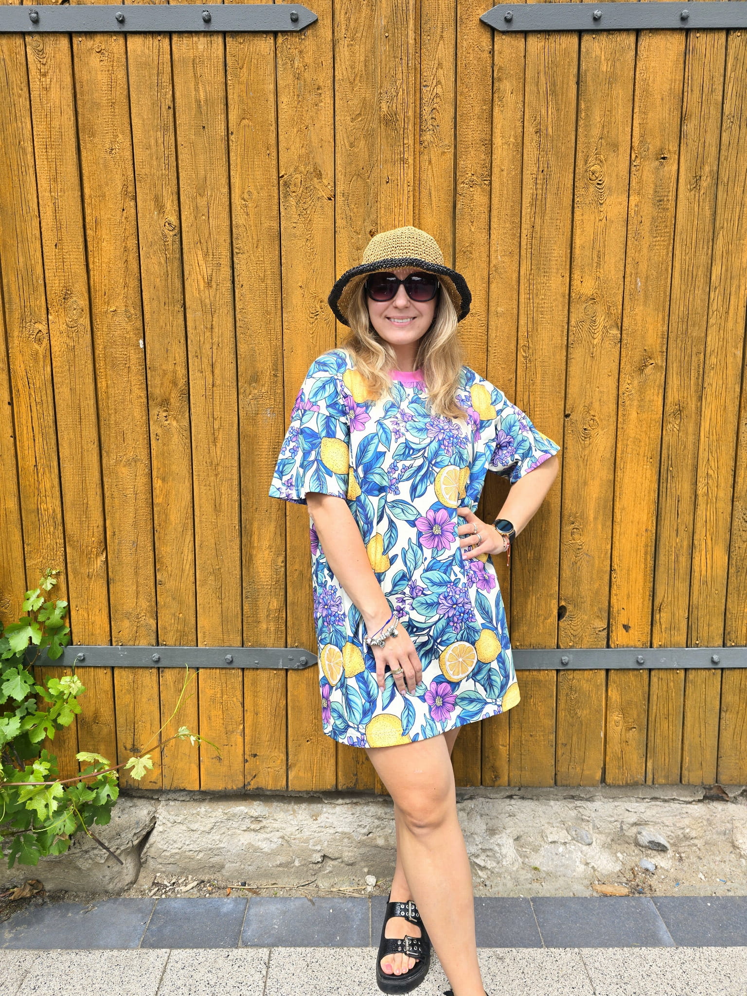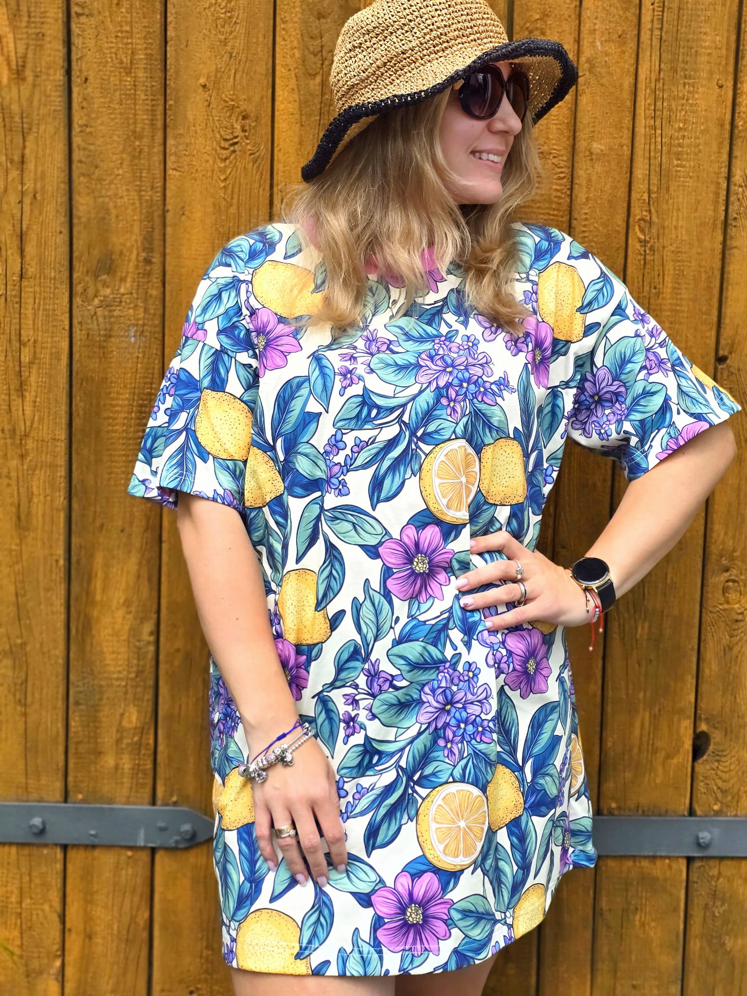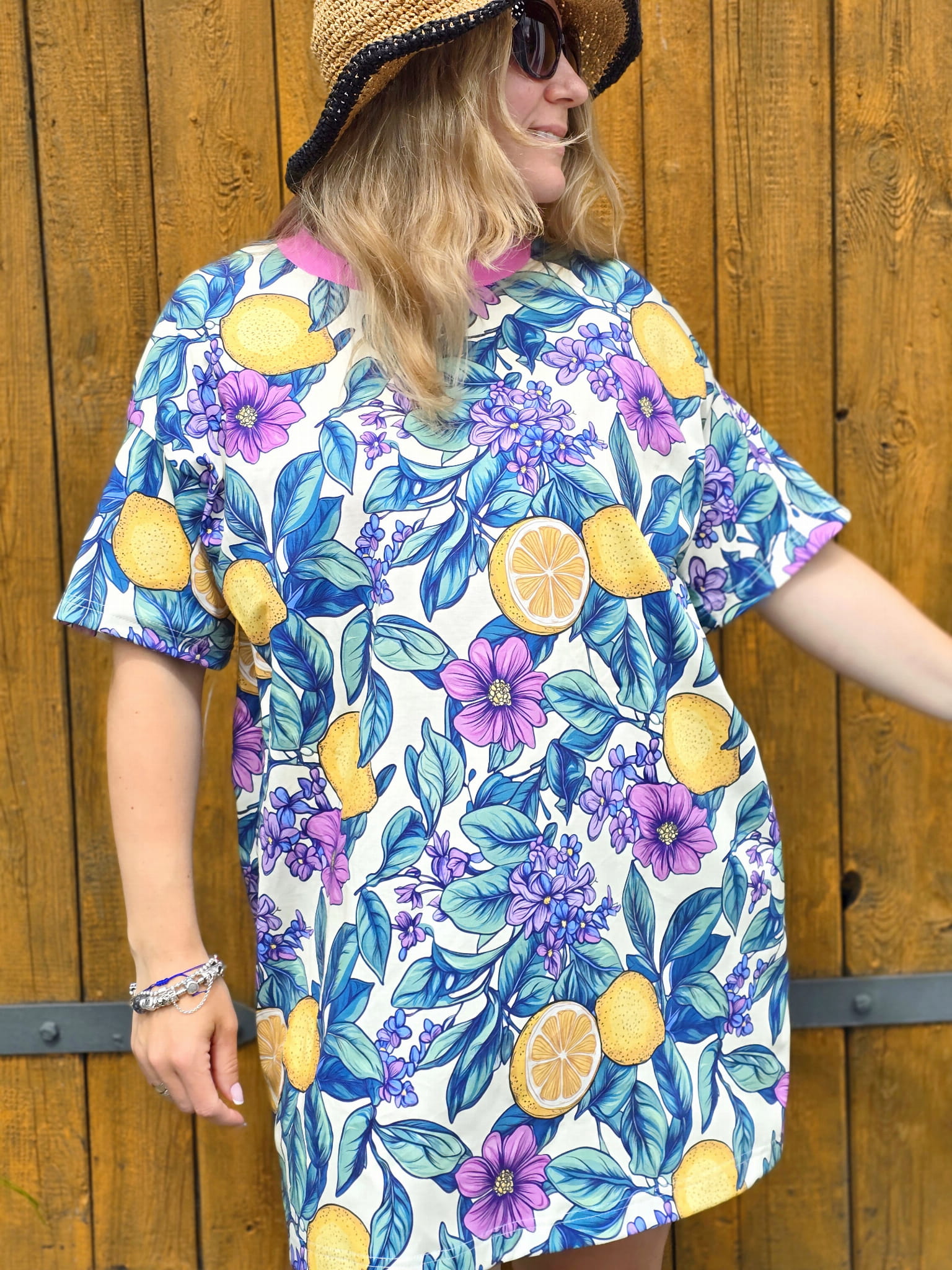 Luźna sukienka oversize uszyta z miękkiego, elastycznego jerseyu, która sprawdzi się idealnie na lato – na plażę, spacer czy do pracy. Wzór pełen cytryn, liści i fioletowych kwiatów dodaje świeżości i energii każdej stylizacji.