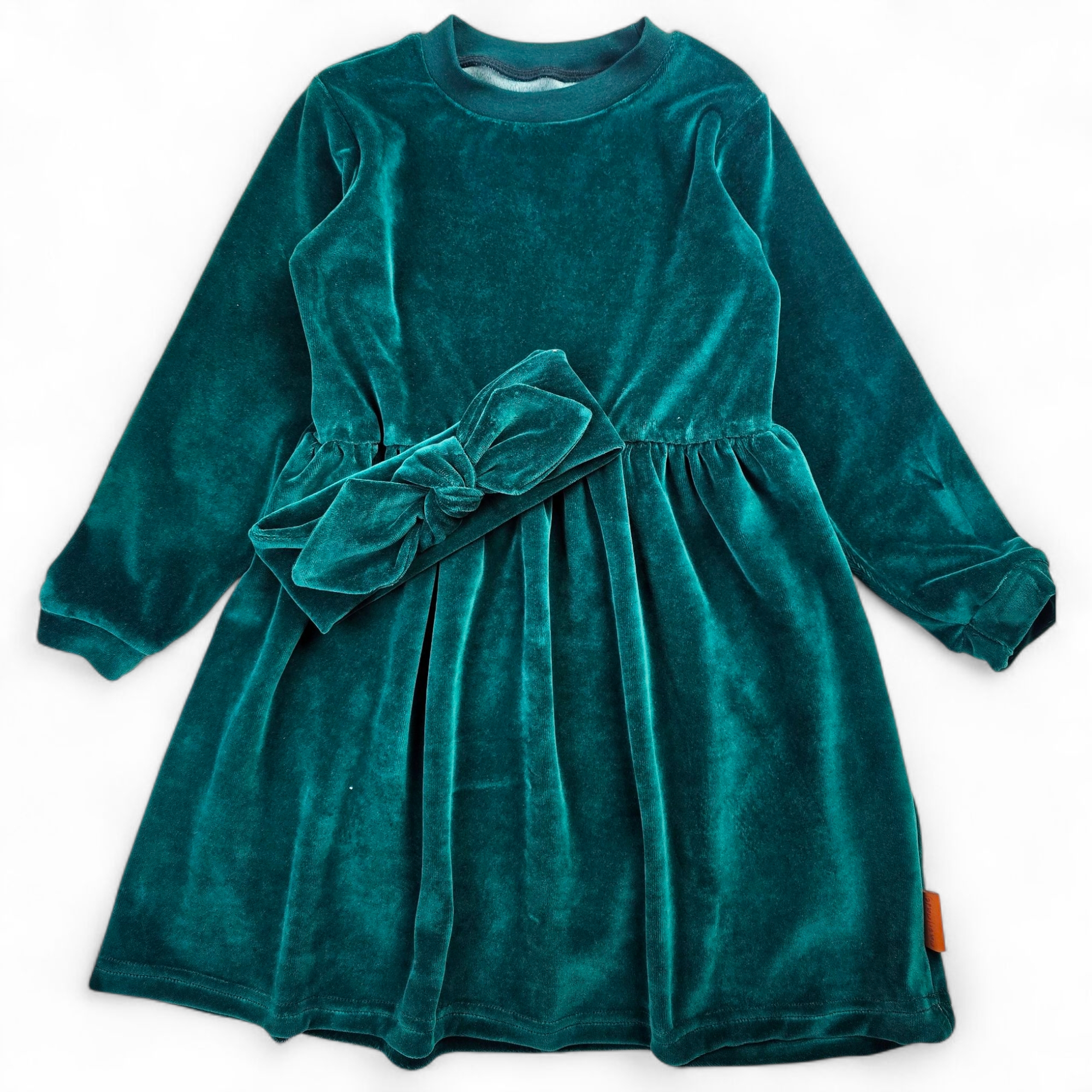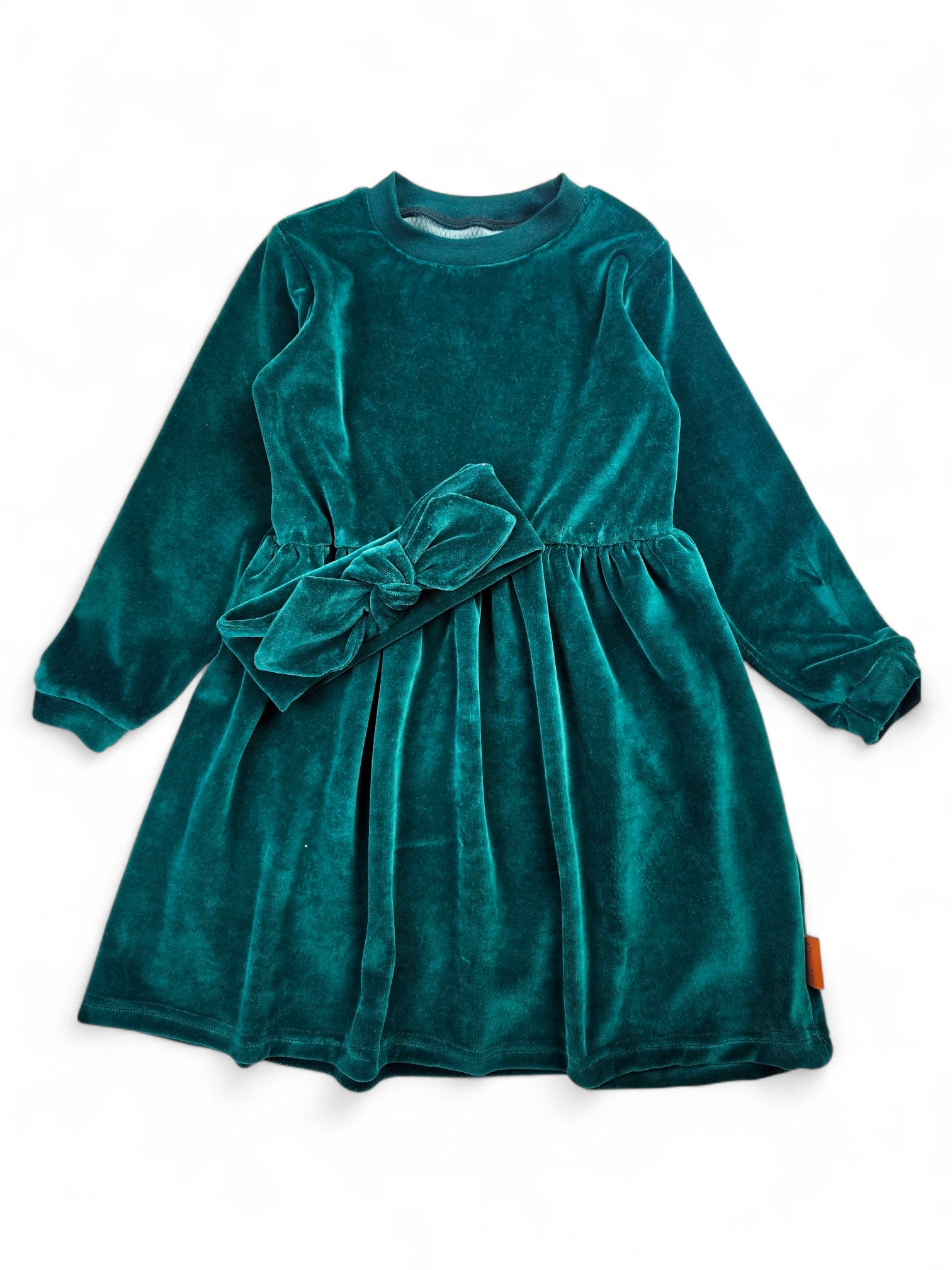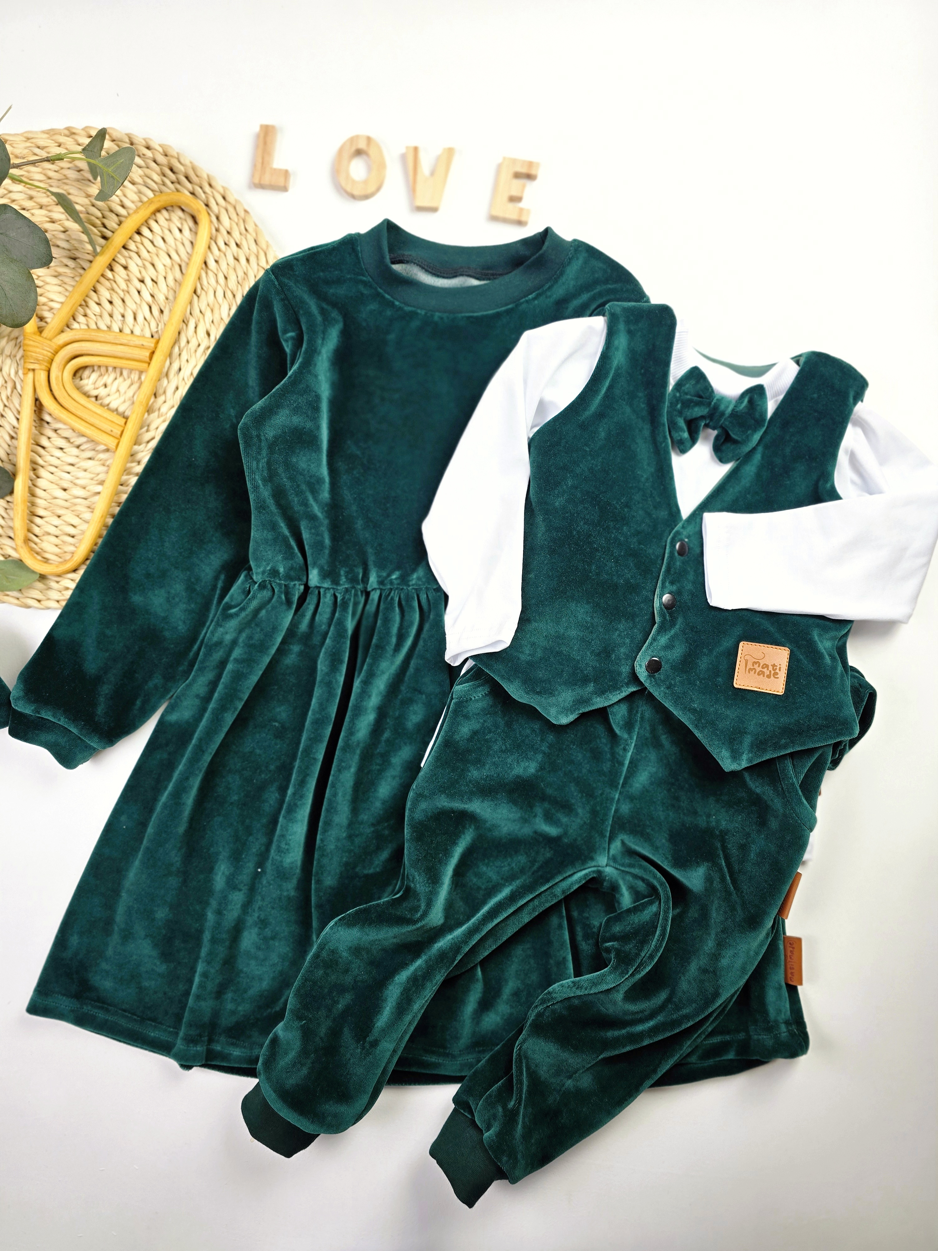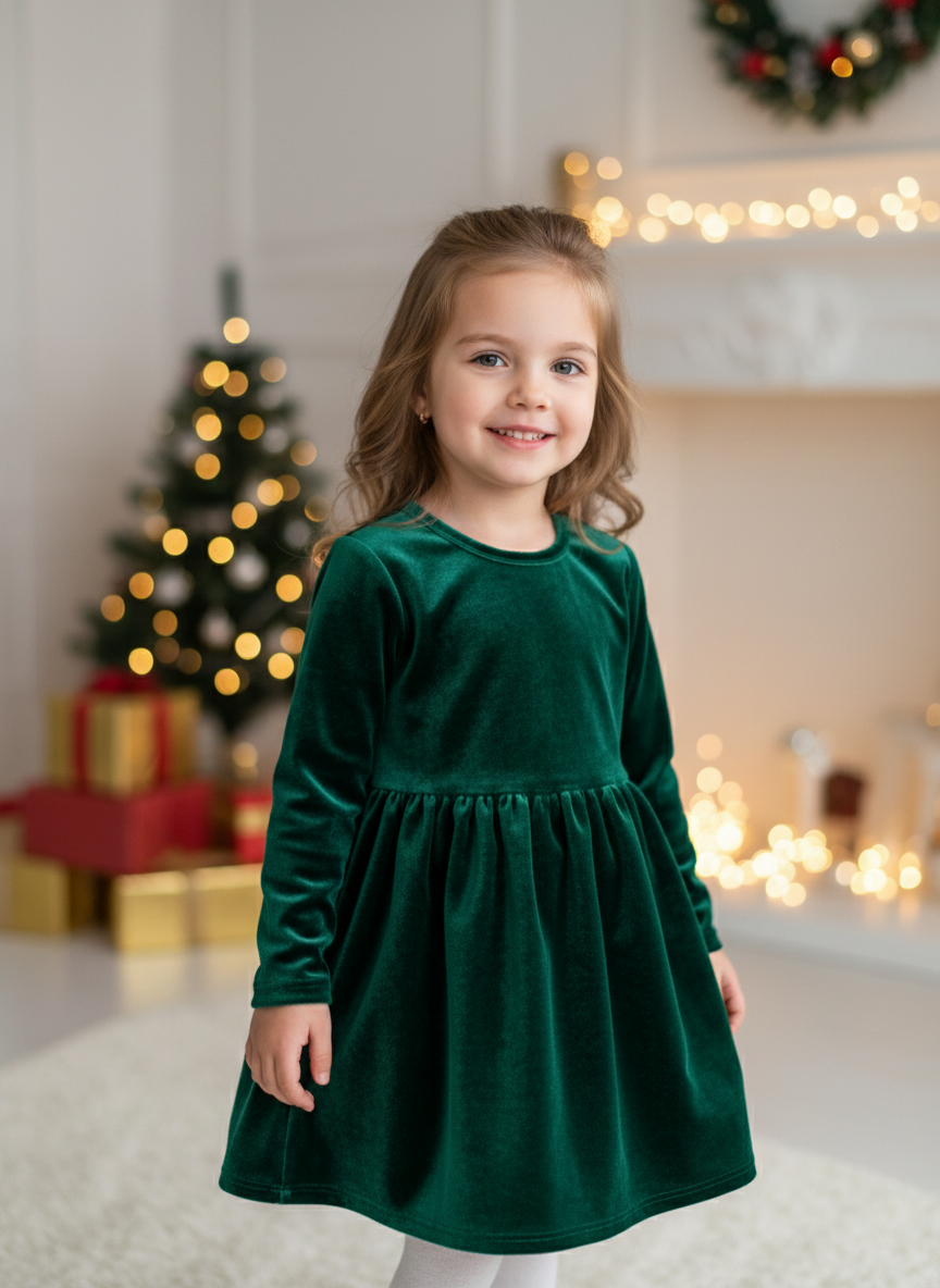 Elegancka, miękka i niezwykle przyjemna w dotyku – taka właśnie jest nasza sukienka z bawełnianego weluru w ponadczasowym odcieniu butelkowej zieleni. Ten model to połączenie klasy, wygody i delikatnego połysku, który sprawia, że każda dziewczynka wygląda wyjątkowo.